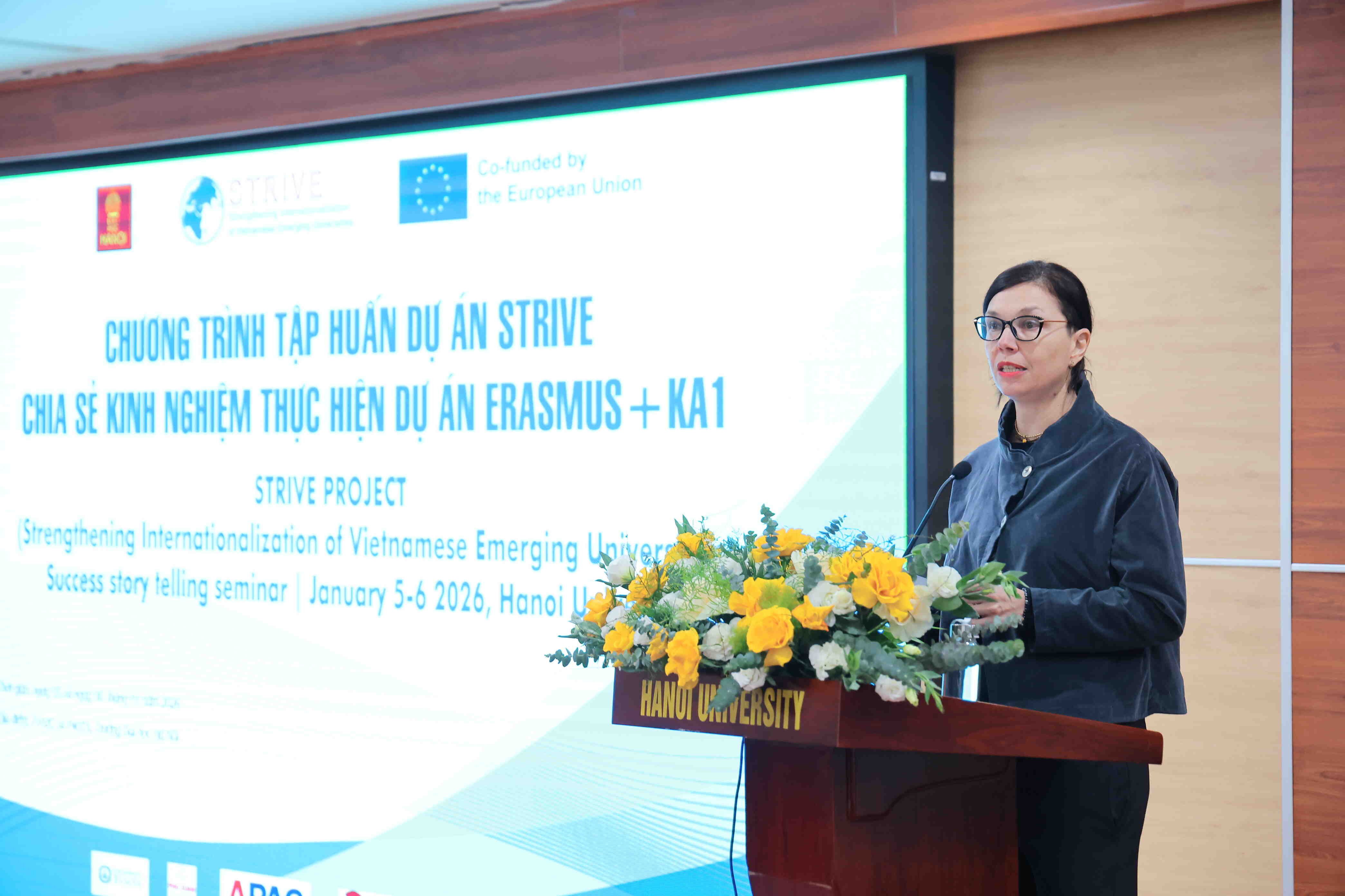 (apag.edu.vn) - Trong hai ngày 05/01 - 06/01/2026, Trường Đại học Hà Nội (HANU) tổ chức chương trình tập huấn “Chia sẻ kinh nghiệm thực hiện dự án Erasmus+ KA1”. Đây là hoạt động nằm trong khuôn khổ dự án STRIVE. Sự kiện quy tụ các chuyên gia từ Châu Âu cùng đại diện gần 15 trường đại học, học viện trên khắp Việt Nam. Trong bối cảnh hội nhập giáo dục toàn cầu đang chuyển dịch mạnh mẽ, sự kiện không chỉ đánh dấu bước tiến trong hợp tác quốc tế mà còn mở ra diễn đàn đối thoại chiến lược giữa các trường đại học Việt Nam và các đối tác Châu Âu.