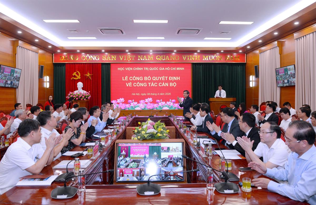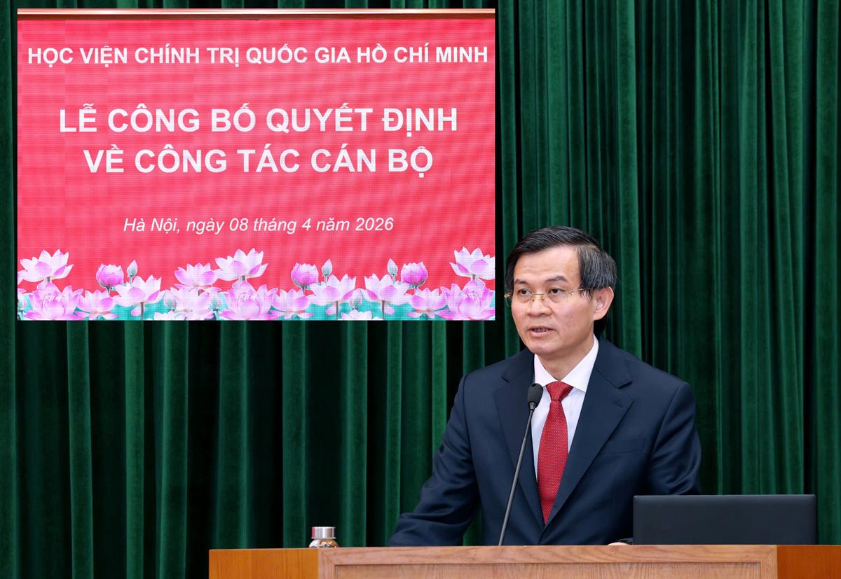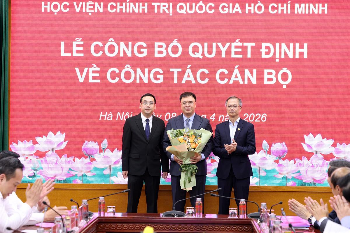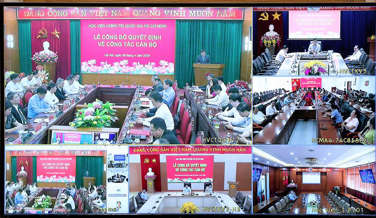 (apag.edu.vn) - Chiều ngày 08/4/2026, tại Hà Nội, Học viện Chính trị quốc gia Hồ Chí Minh tổ chức Lễ công bố quyết định bổ nhiệm Trợ lý, Thư ký đồng chí Ủy viên Bộ Chính trị, Giám đốc Học viện Chính trị quốc gia Hồ Chí Minh. Lễ công bố được kết nối trực tuyến đến 6 điểm cầu các Học viện trực thuộc. PGS.TS Đoàn Minh Huấn, Ủy viên Bộ Chính trị, Bí thư Đảng ủy, Giám đốc Học viện Chính trị quốc gia Hồ Chí Minh dự và chủ trì buổi Lễ.