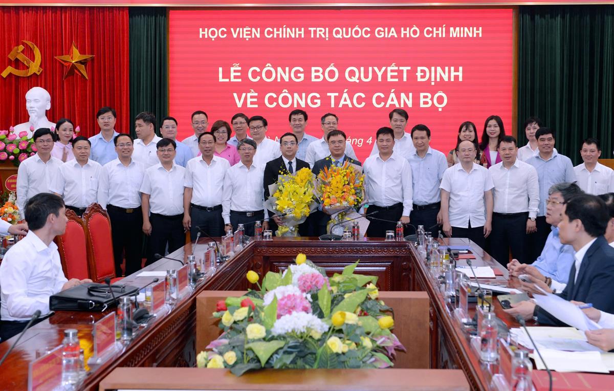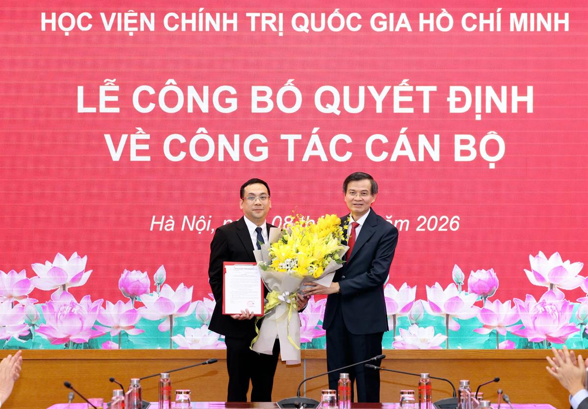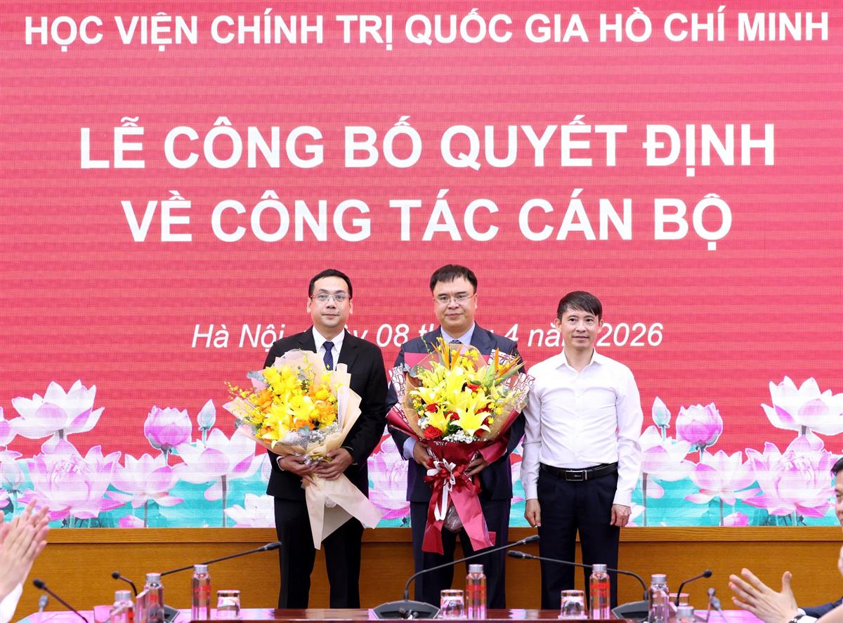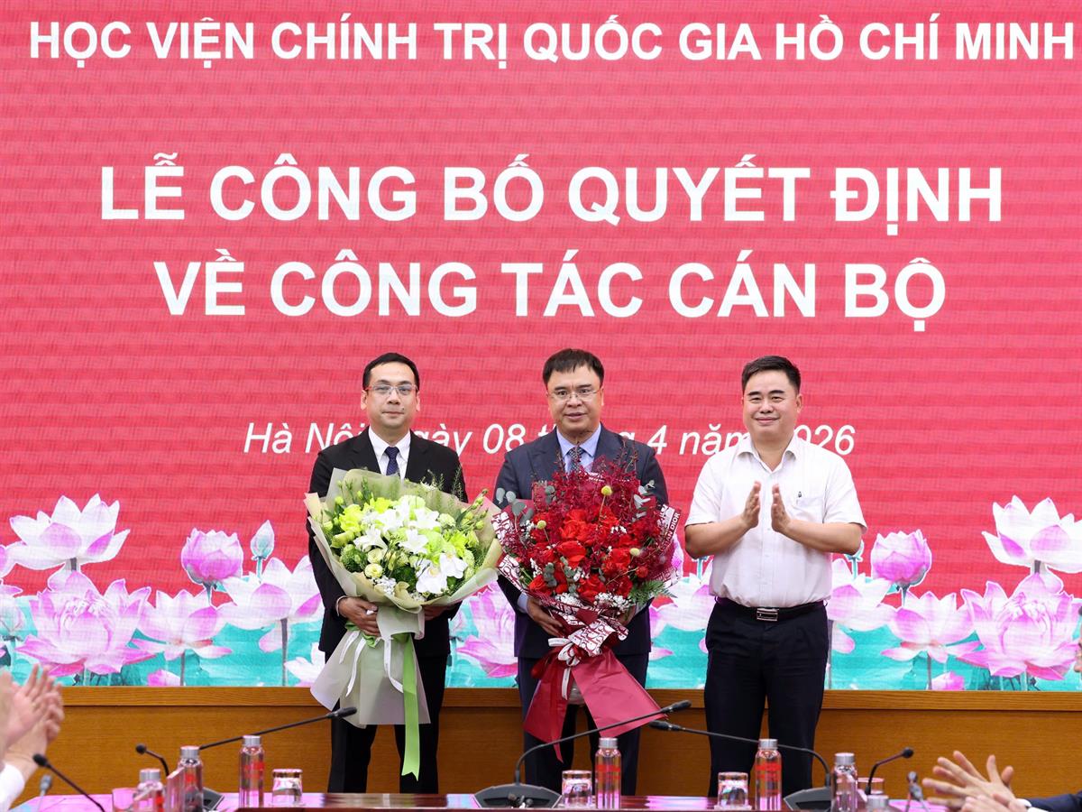 (apag.edu.vn) - Chiều ngày 08/4/2026, tại Hà Nội, Học viện Chính trị quốc gia Hồ Chí Minh tổ chức Lễ công bố quyết định bổ nhiệm Trợ lý, Thư ký đồng chí Ủy viên Bộ Chính trị, Giám đốc Học viện Chính trị quốc gia Hồ Chí Minh. Lễ công bố được kết nối trực tuyến đến 6 điểm cầu các Học viện trực thuộc. PGS.TS Đoàn Minh Huấn, Ủy viên Bộ Chính trị, Bí thư Đảng ủy, Giám đốc Học viện Chính trị quốc gia Hồ Chí Minh dự và chủ trì buổi Lễ.