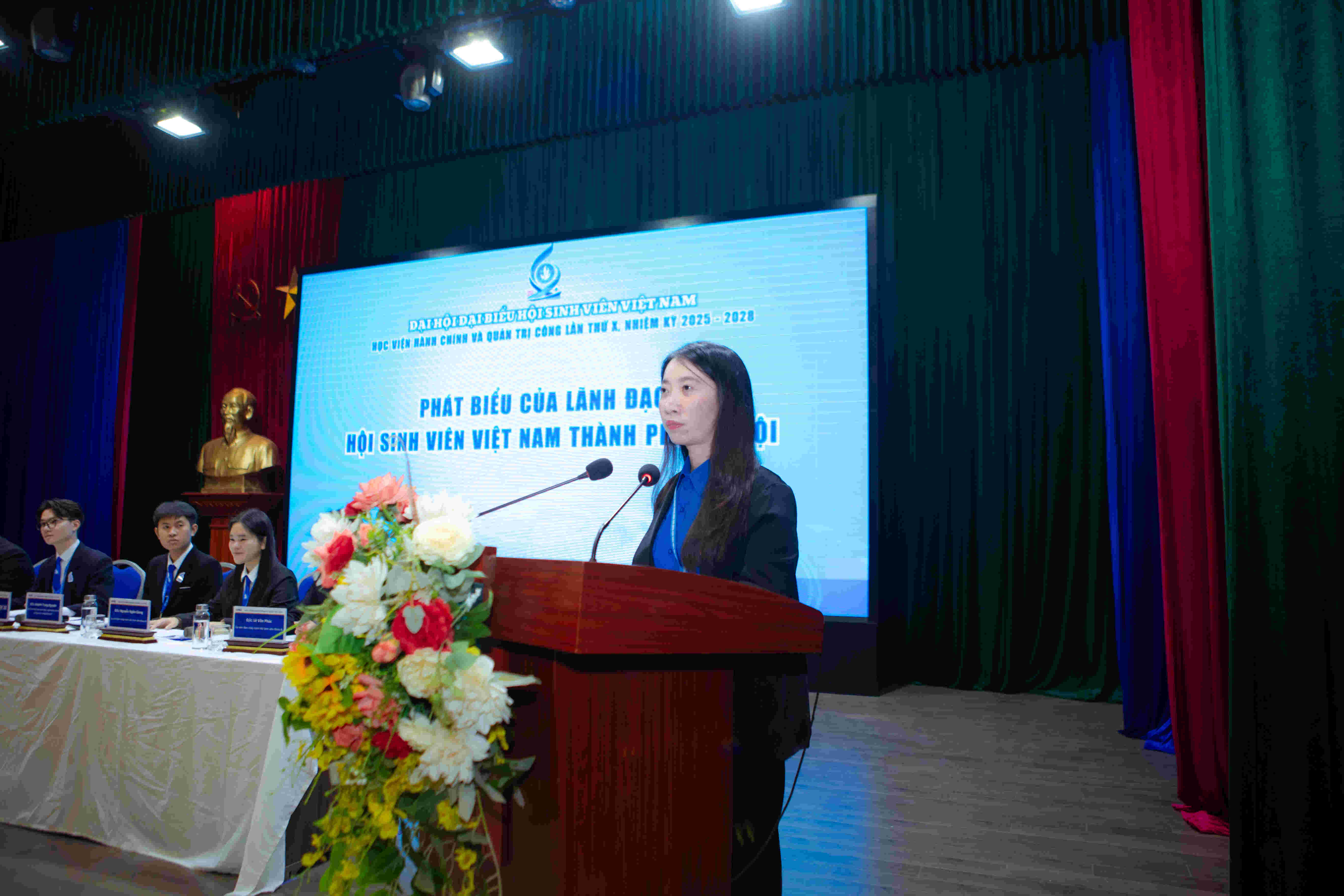 Phát biểu tại Đại hội, đồng chí Vũ Thị Minh Hằng, Ủy viên Ban Chấp hành, Phó Trưởng Ban Công tác Đoàn và Thanh thiếu nhi Ủy ban MTTQ Việt Nam Thành phố, Phó Chủ tịch Thường trực Hội Sinh viên Việt Nam Thành phố Hà Nội, đã ghi nhận và biểu dương những thành tích nổi bật của Hội Sinh viên Học viện trong nhiệm kỳ 2023 - 2025. Hội Sinh viên Học viện Hành chính và Quản trị công là một trong những đơn vị có phong trào sinh viên sôi nổi, sáng tạo và có chiều sâu trong hệ thống Hội Sinh viên Thành phố. Các phong trào như “Sinh viên 5 tốt”, hoạt động học thuật, khởi nghiệp, tình nguyện vì cộng đồng đã góp phần khẳng định vai trò, vị thế của sinh viên Học viện trong công tác Hội và phong trào sinh viên Thủ đô. Đồng chí đề nghị trong nhiệm kỳ tới, Hội Sinh viên Học viện tiếp tục phát huy kết quả đạt được, đẩy mạnh đổi mới nội dung và phương thức hoạt động, đáp ứng nhu cầu phát triển toàn diện của sinh viên trong bối cảnh chuyển đổi số và hội nhập quốc tế sâu rộng và mong rằng các đồng chí trong Ban Chấp hành khóa X sẽ là những thủ lĩnh sinh viên bản lĩnh, tâm huyết, trí tuệ; luôn giữ ngọn lửa nhiệt huyết, đoàn kết, gắn bó, không ngừng học hỏi, đổi mới và sáng tạo để đưa phong trào sinh viên Học viện Hành chính và Quản trị công phát triển mạnh mẽ hơn nữa, xứng đáng là tổ chức Hội tiêu biểu của Thủ đô.