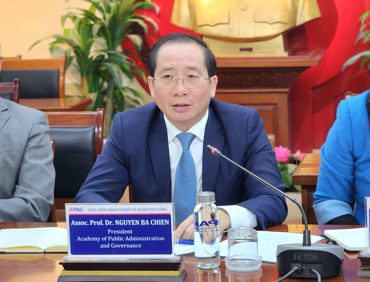 Ảnh: PGS.TS. Nguyễn Bá Chiến phát biểu tại buổi làm việcPhát biểu chào mừng Đoàn chuyên gia Đại học INHA, PGS.TS. Nguyễn Bá Chiến khẳng định Học viện Hành chính và Quản trị công luôn coi trọng và đánh giá cao hiệu quả hợp tác với Trường Đại học INHA trong suốt thời gian qua. Giám đốc Học viện cho rằng các chương trình trao đổi học thuật, hội thảo quốc tế và nghiên cứu chung đã góp phần thiết thực nâng cao năng lực giảng dạy, nghiên cứu và hội nhập quốc tế của đội ngũ viên chức, giảng viên. Trên tinh thần đó, Học viện mong muốn hai bên tiếp tục phát triển hợp tác theo chiều sâu, tập trung vào các lĩnh vực đào tạo liên kết, trao đổi giảng viên - học viên, nghiên cứu khoa học chung và chuyển giao tri thức gắn với quản trị công, chuyển đổi số và phát triển bền vững.