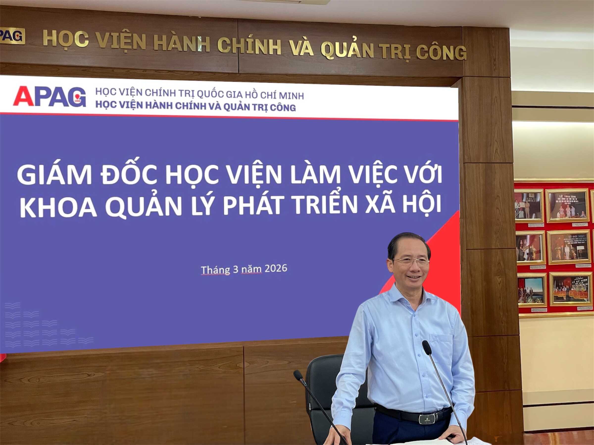 (apag.edu.vn) - Sáng ngày 13/3/2026, tại Phòng Truyền thống, Học viện Hành chính và Quản trị công, PGS.TS. Nguyễn Bá Chiến, Giám đốc Học viện đã chủ trì buổi làm việc với Khoa Quản lý phát triển xã hội nhằm nắm bắt tình hình hoạt động của Khoa, đồng thời trao đổi, định hướng một số nhiệm vụ trọng tâm trong thời gian tới. Buổi làm việc diễn ra trong không khí cởi mở, thẳng thắn và mang tính xây dựng, tập trung vào các nội dung liên quan đến công tác đào tạo, nghiên cứu khoa học và phát triển đội ngũ giảng viên.