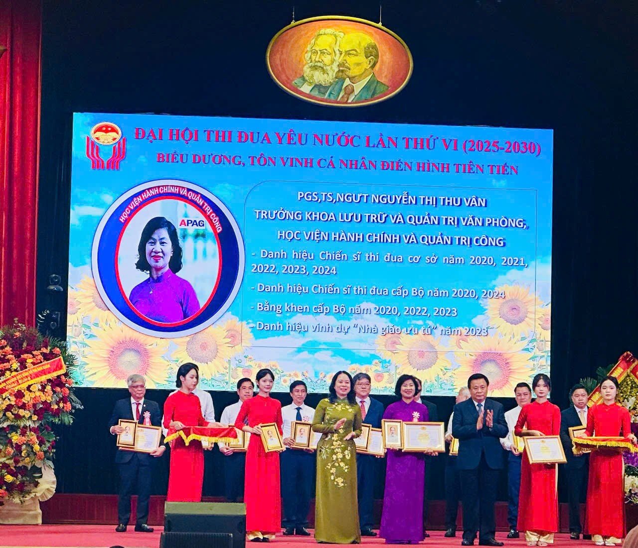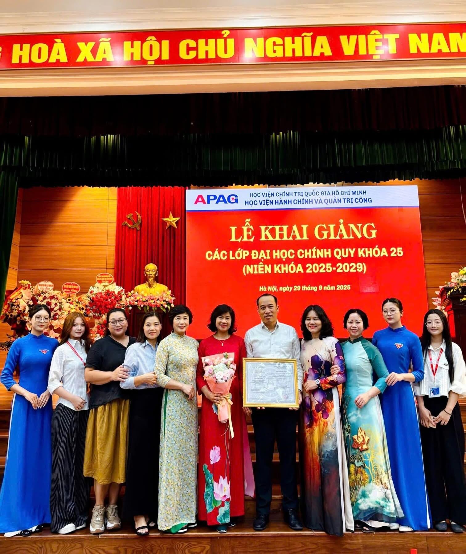 GS.TS. Nguyễn Xuân Thắng, Ủy viên Bộ Chính trị, Giám đốc Học viện Chính trị Quốc gia Hồ Chí Minh trao tặng PGS.TS. Nguyễn Thị Thu Vân, Trưởng khoa Khoa Lưu trữ và Quản trị văn phòng đón nhận Công nhận là điển hình tiên tiến trong phong trào thi đua “Đoàn kết - Kỷ cương - Gương mẫu - Sáng tạo - Hiệu quả” giai đoạn 2020-2025.