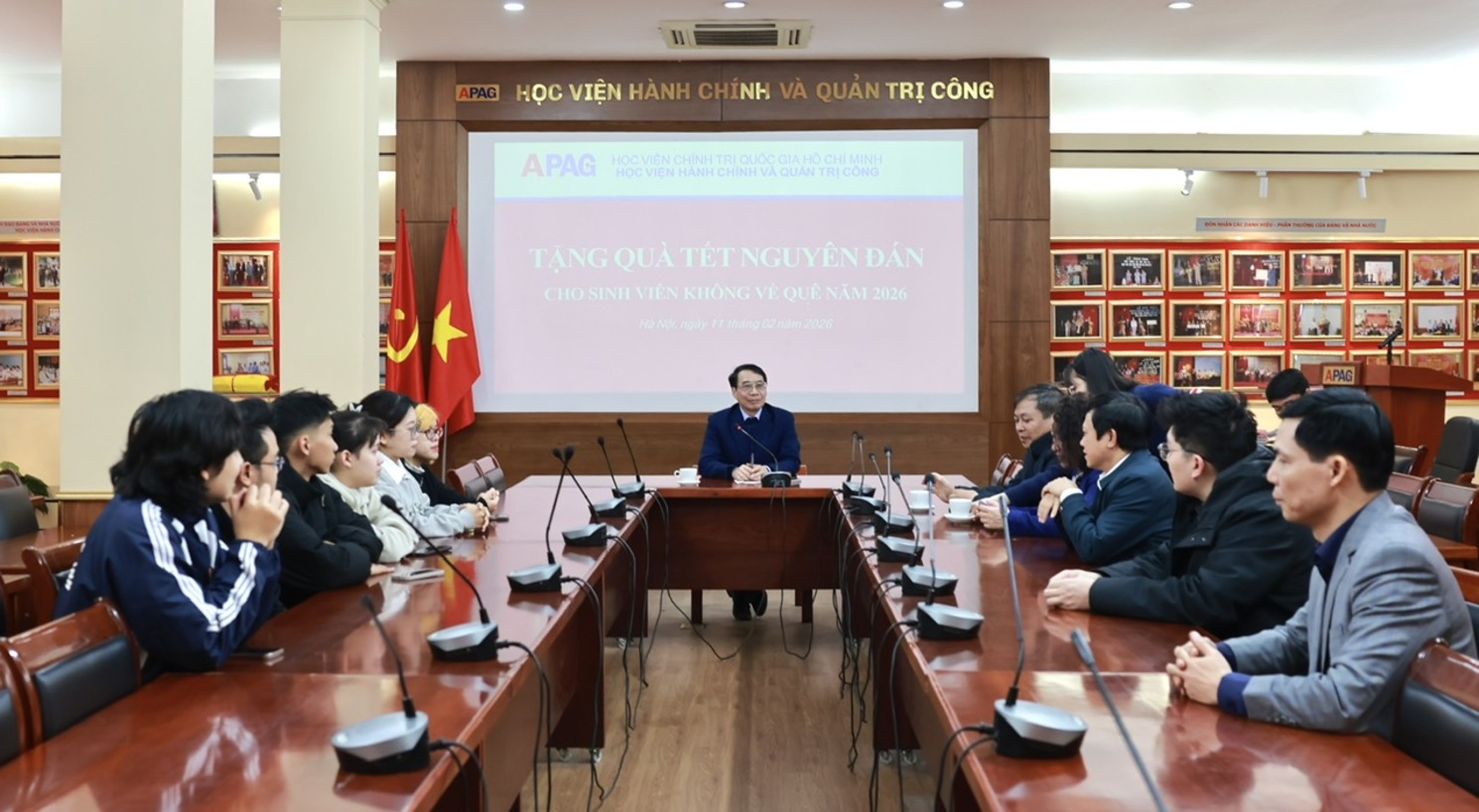 (apag.edu.vn) - Sáng ngày 11/02/2026, Học viện Hành chính và Quản trị công tổ chức chương trình gặp mặt, tặng quà cho sinh viên không về quê đón Tết, thể hiện sự quan tâm sâu sắc của Lãnh đạo Học viện đối với đời sống tinh thần của người học trong những ngày đầu xuân nhân dịp Tết Nguyên đán - Bính Ngọ 2026.