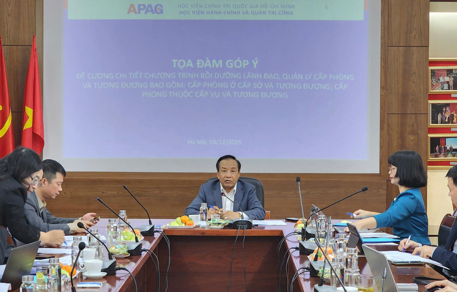 (apag.edu.vn) - Sáng ngày 19/12/2025, tại Học viện Hành chính và Quản trị công, Học viện đã tổ chức Tọa đàm góp ý đề cương chi tiết chương trình bồi dưỡng lãnh đạo, quản lý cấp phòng và tương đương, bao gồm đội ngũ lãnh đạo, quản lý cấp phòng ở cấp cơ sở và lãnh đạo, quản lý cấp phòng thuộc cấp vụ và tương đương. Tọa đàm được tổ chức trong khuôn khổ chuỗi hoạt động chuyên môn nhằm tiếp tục hoàn thiện chương trình đào tạo, bồi dưỡng cán bộ, công chức đáp ứng yêu cầu đổi mới quản trị nhà nước trong giai đoạn hiện nay.
