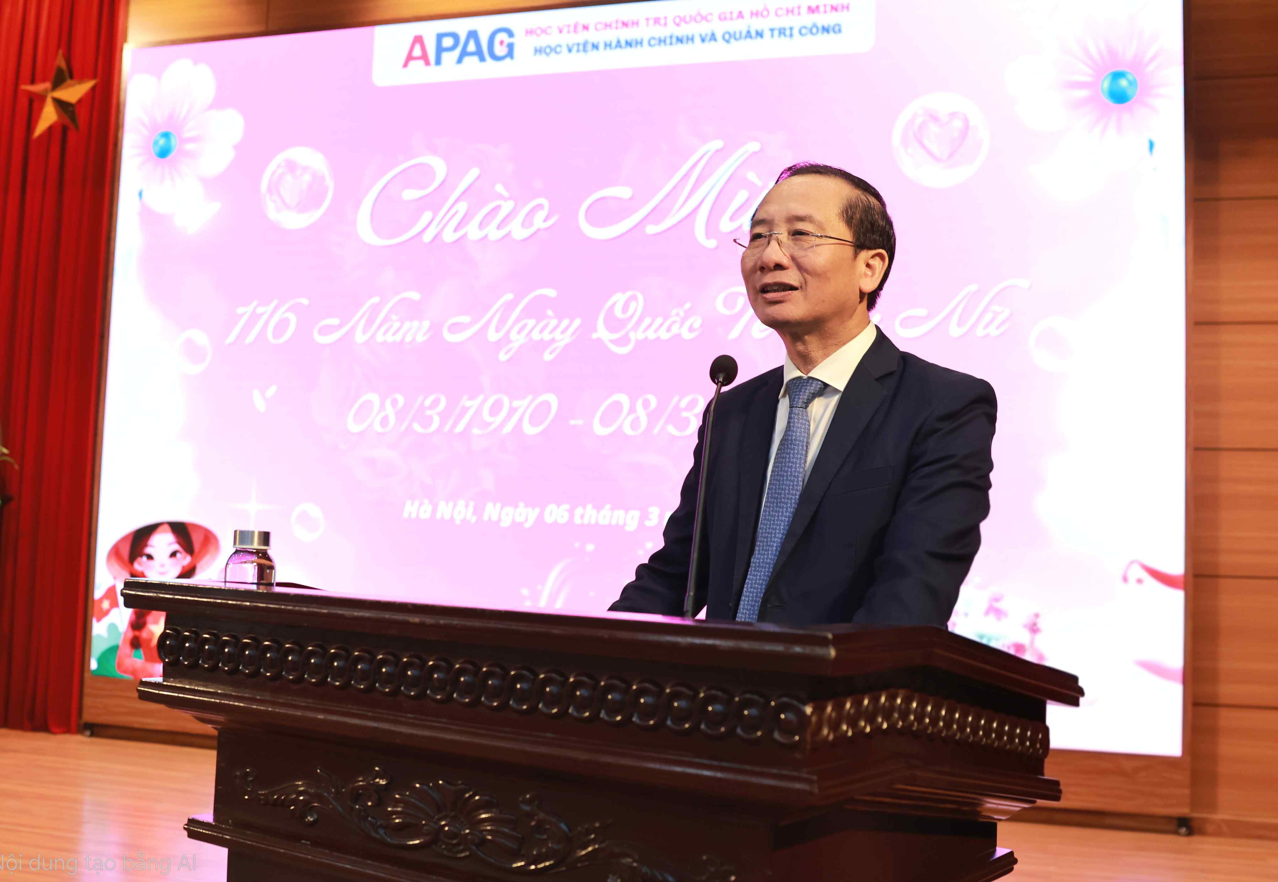 Ảnh: PGS.TS. Nguyễn Bá Chiến, Bí thư Đảng ủy, Giám đốc Học viện phát biểu chúc mừngPhát biểu tại buổi gặp mặt, PGS.TS. Nguyễn Bá Chiến bày tỏ sự tri ân và trân trọng đối với phụ nữ Việt Nam nói chung và các chị em phụ nữ của Học viện Hành chính và Quản trị công nói riêng. Trong bối cảnh nhiệm vụ phát triển đất nước và yêu cầu đổi mới quản trị ngày càng cao, vai trò của phụ nữ trong các lĩnh vực giảng dạy, nghiên cứu, tham mưu và phục vụ tại Học viện ngày càng quan trọng, đòi hỏi tinh thần trách nhiệm, sự đổi mới và sáng tạo trong công việc. Giám đốc Học viện ghi nhận và trân trọng những đóng góp của các nữ viên chức, người lao động, từ đội ngũ giảng viên, cán bộ tham mưu đến các chị em làm công việc phục vụ, mỗi vị trí đều có giá trị và đóng góp thiết thực cho sự phát triển chung của Học viện. Thay mặt Đảng ủy, Ban Giám đốc Học viện và toàn thể nam giới trong Học viện, PGS.TS. Nguyễn Bá Chiến gửi lời chúc mừng, tri ân và chúc các chị em phụ nữ đang công tác tại Hà Nội, Đắk Lắk, Đà Nẵng và Phân hiệu Thành phố Hồ Chí Minh luôn mạnh khỏe, hạnh phúc, có nhiều niềm vui trong công việc và cuộc sống. Học viện sẽ tiếp tục nỗ lực nâng cao đời sống vật chất và tinh thần cho viên chức, người lao động nói chung và phụ nữ của Học viện nói riêng.