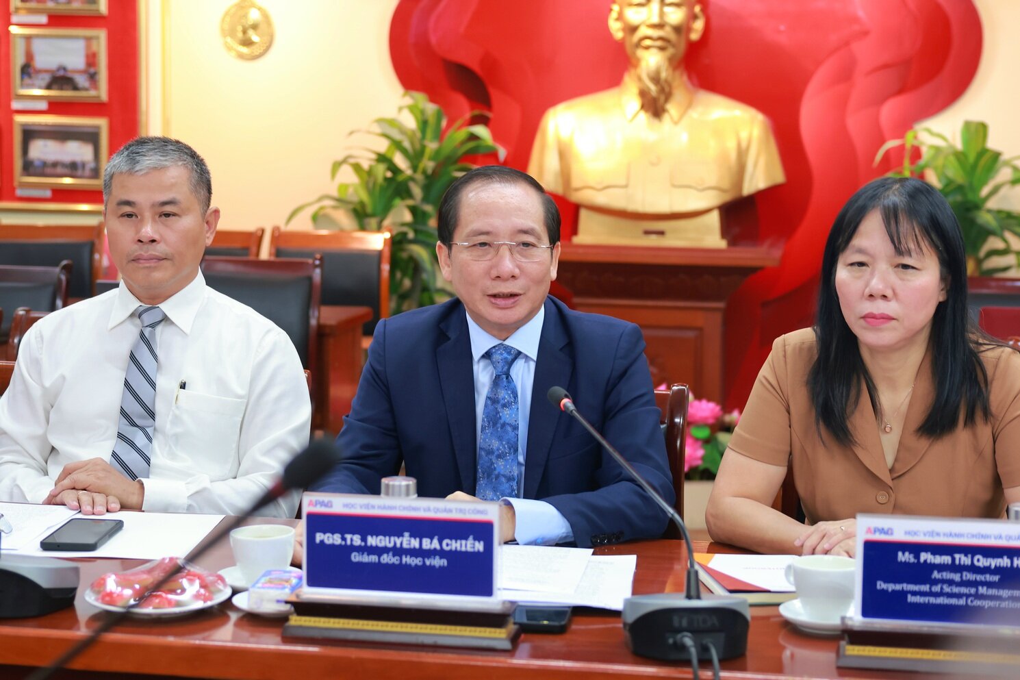 Về phía Học viện, tham dự có PGS.TS. Nguyễn Bá Chiến, Giám đốc Học viện; TS. Bùi Phương Đình, Phó Giám đốc Học viện; ThS. Phạm Thị Quỳnh Hoa, Quyền Trưởng Ban Quản lý khoa học và Hợp tác quốc tế.