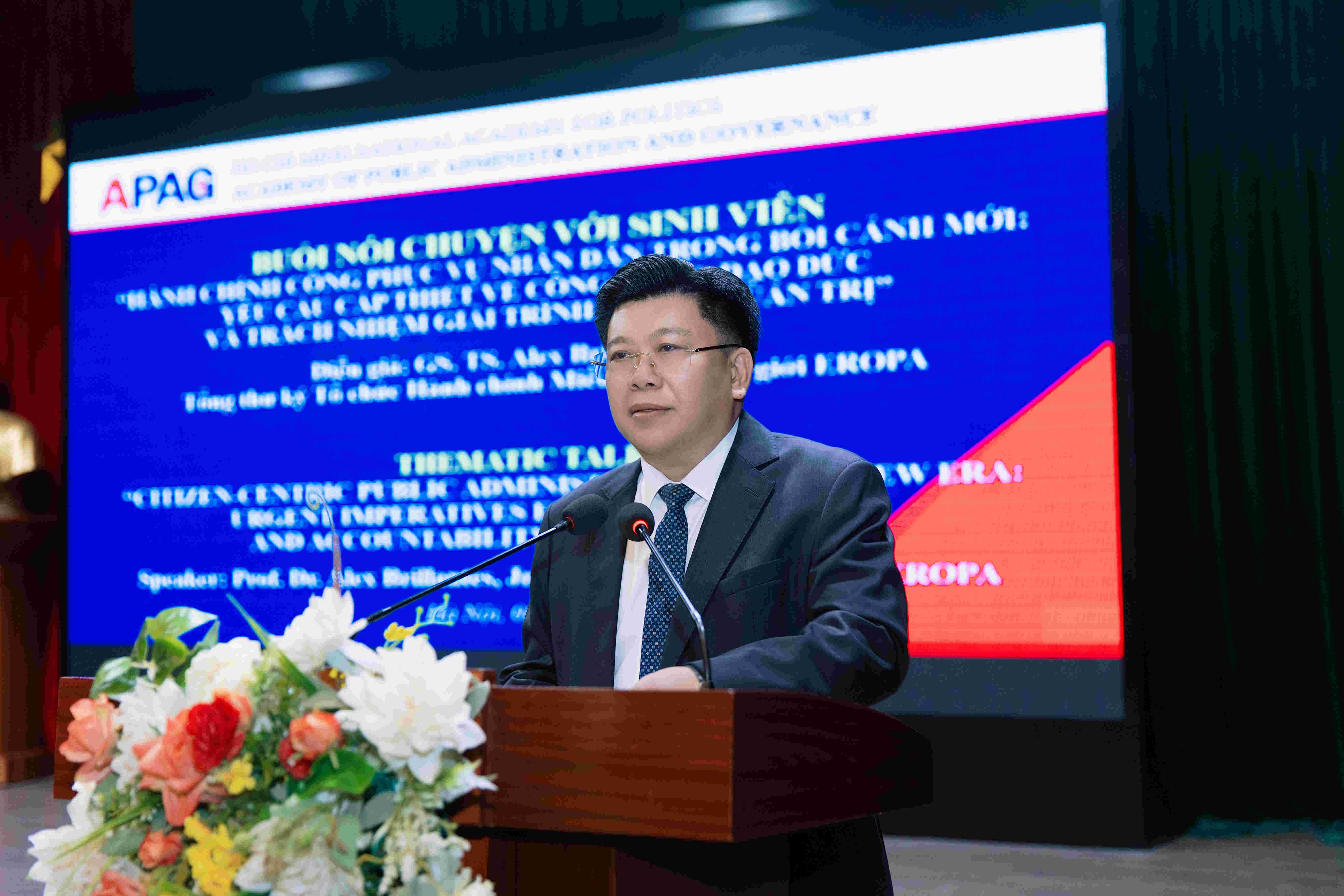 (apag.edu.vn) - Chiều ngày 08/4/2026, tại Hà Nội, Học viện Hành chính và Quản trị công tổ chức buổi nói chuyện chuyên đề với chủ đề “Hành chính công phục vụ nhân dân trong bối cảnh mới: yêu cầu cấp thiết về công bằng, đạo đức và trách nhiệm giải trình trong quản trị”. Diễn giả buổi nói chuyện là Giáo sư Alex Brillantes - Tổng Thư ký Tổ chức Hành chính các nước Miền Đông thế giới (EROPA), học giả uy tín trong lĩnh vực hành chính và quản trị công khu vực châu Á - Thái Bình Dương.