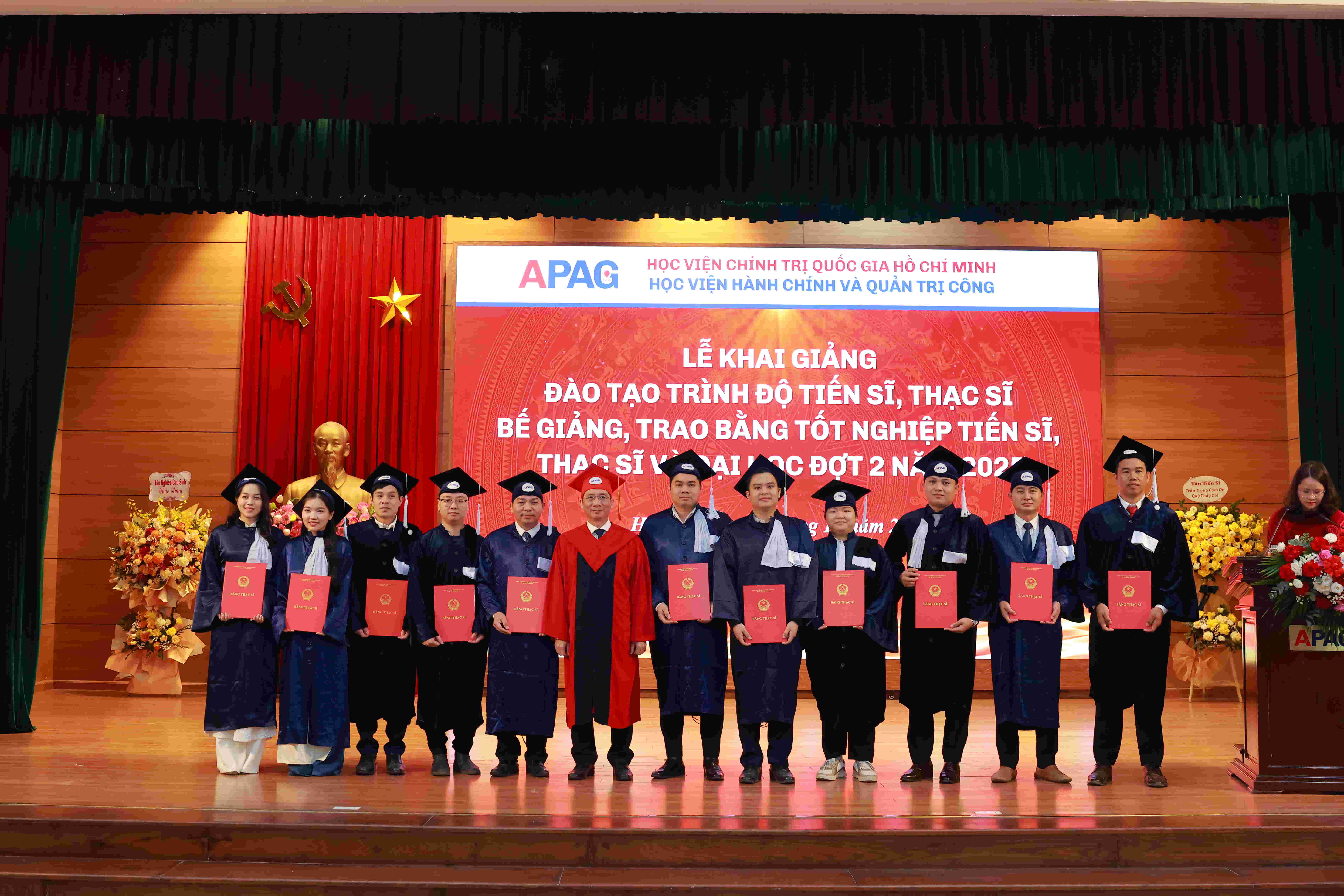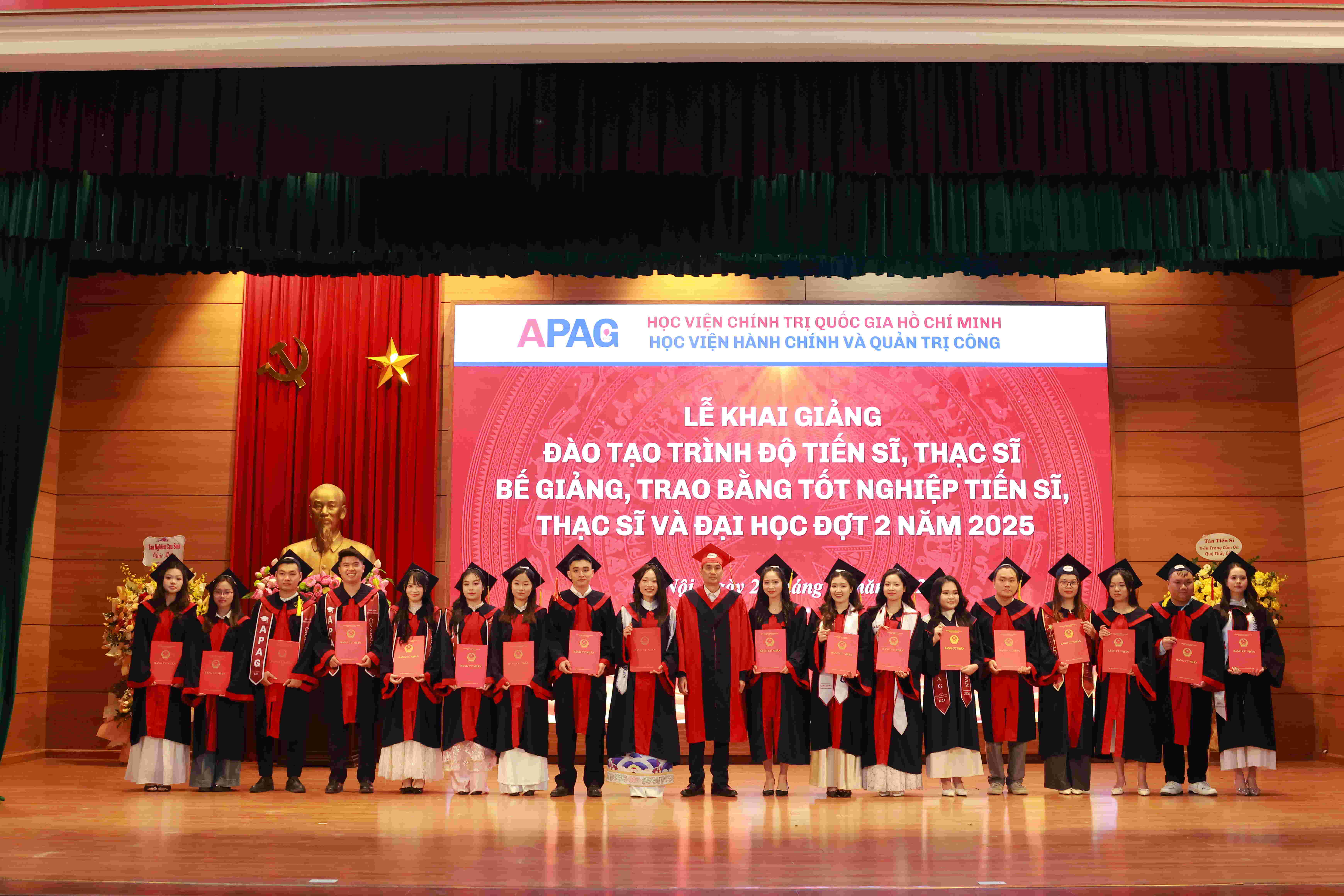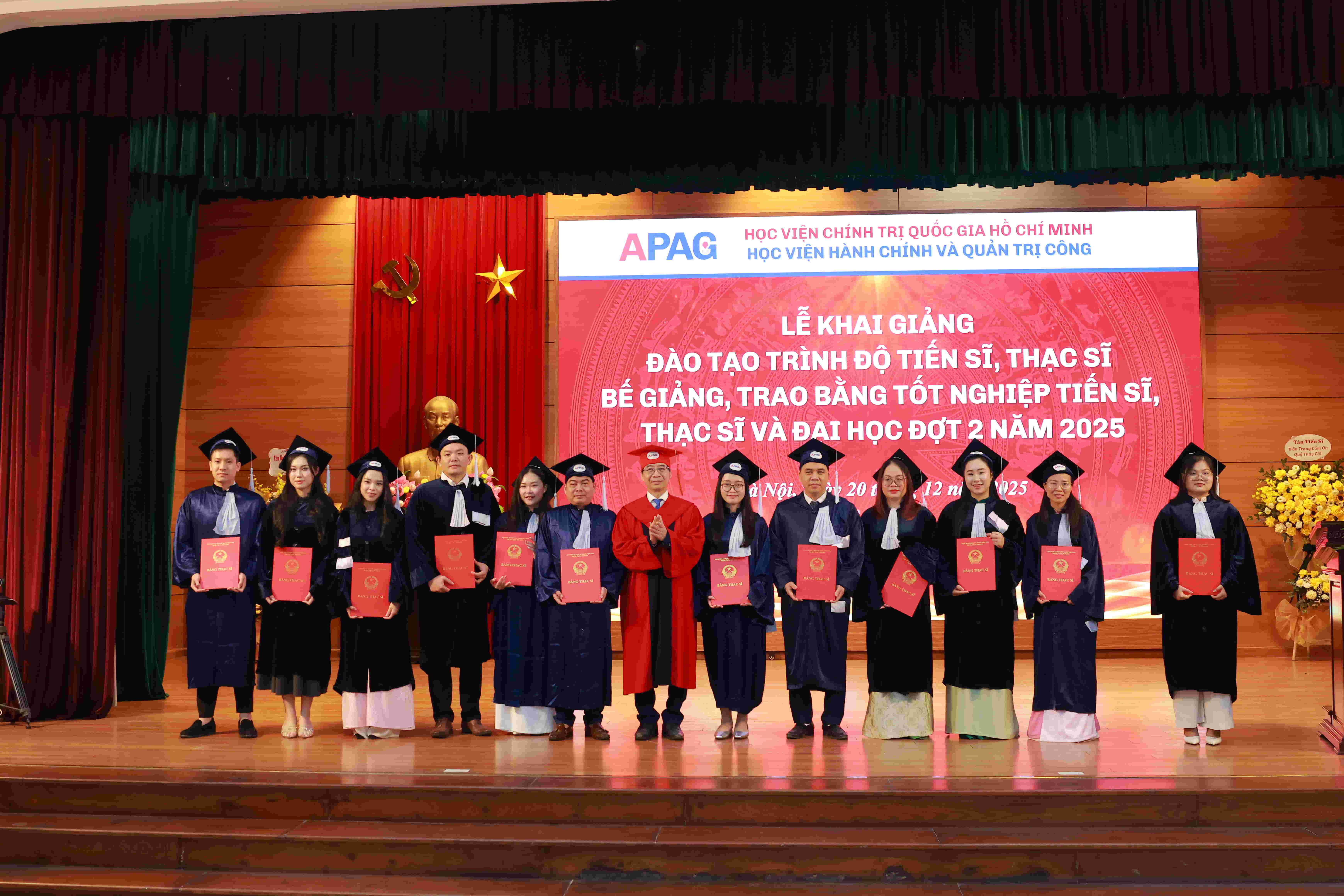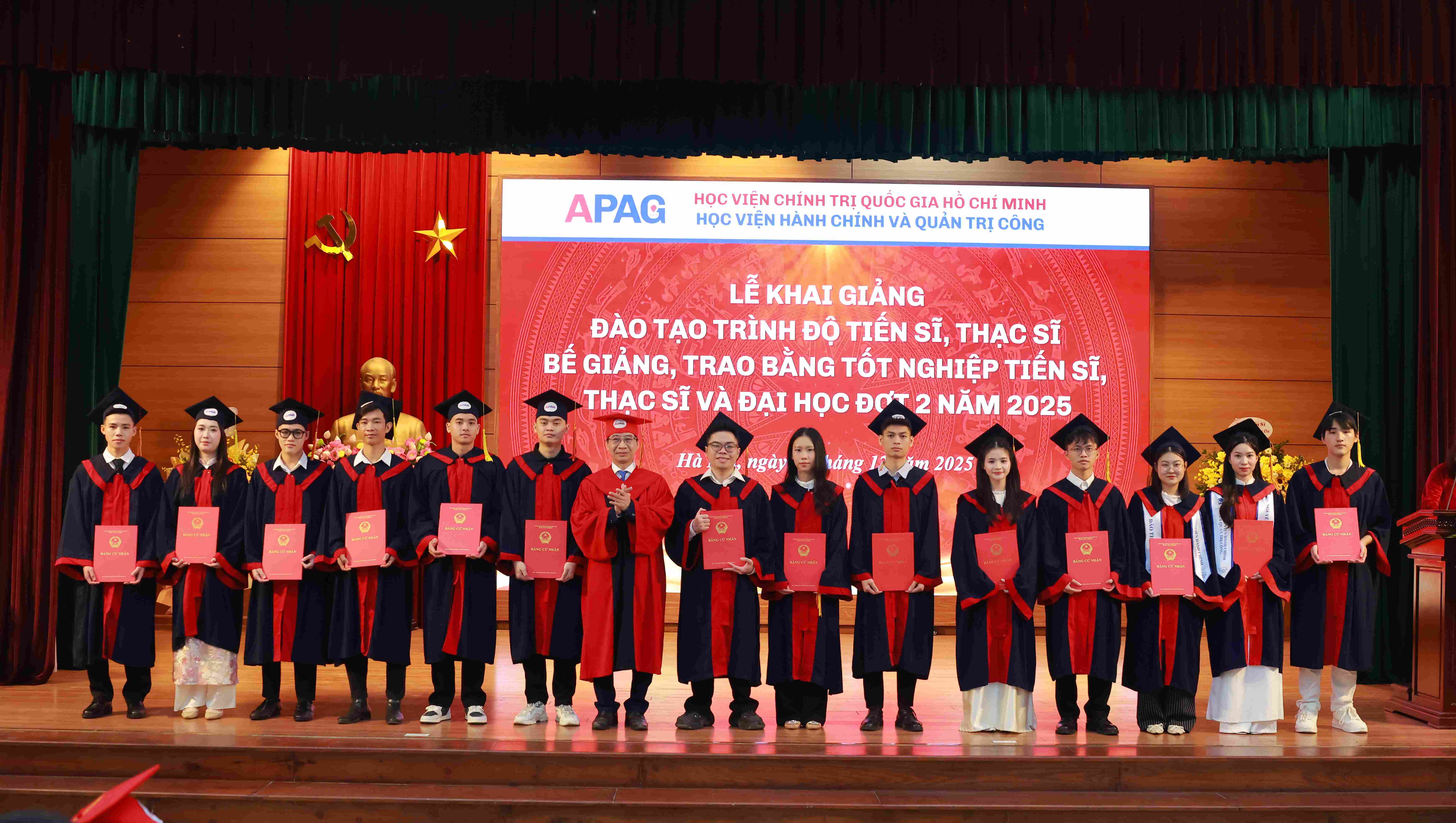 (apag.edu.vn) - Sáng ngày 20/12/2025, trong không khí trang trọng, phấn khởi và đầy ý nghĩa, Học viện Hành chính và Quản trị công trang trọng tổ chức Lễ Khai giảng đào tạo trình độ tiến sĩ, thạc sĩ và Bế giảng, trao bằng tốt nghiệp tiến sĩ, thạc sĩ, đại học (đợt 2) năm 2025. Đây là sự kiện có ý nghĩa đặc biệt, đánh dấu những mốc son quan trọng trong hành trình học tập, nghiên cứu và trưởng thành của các thế hệ học viên, sinh viên, nghiên cứu sinh của Học viện.