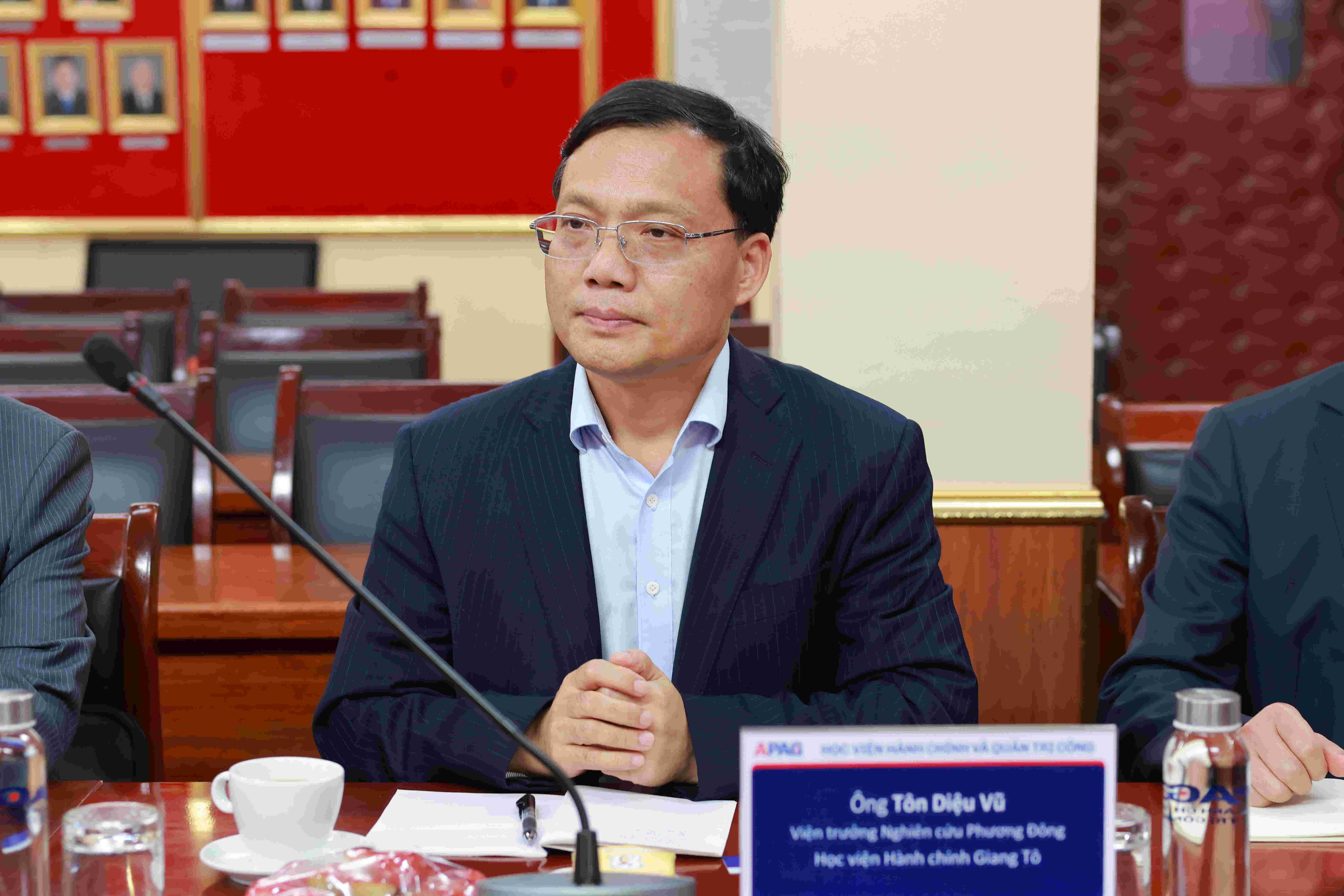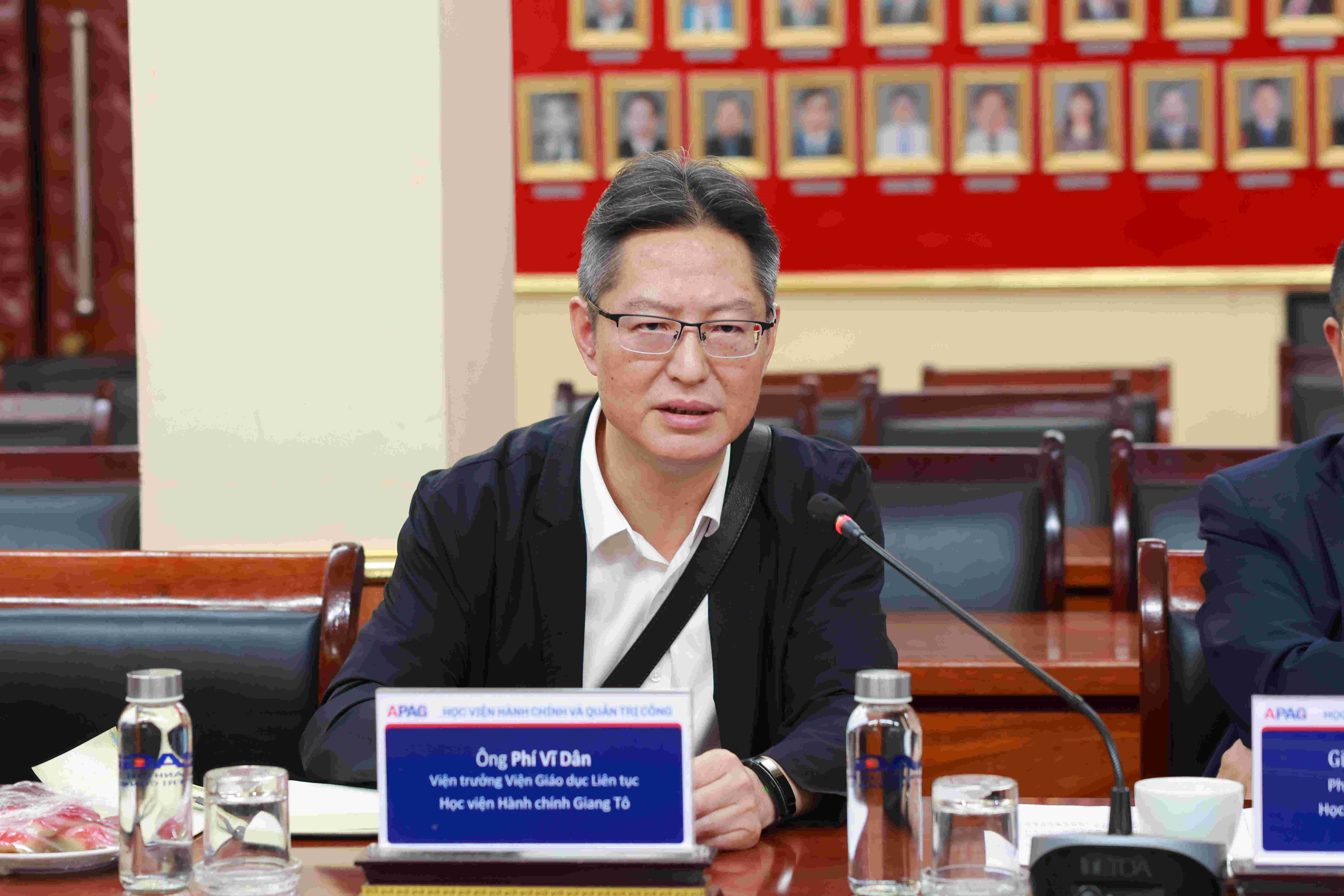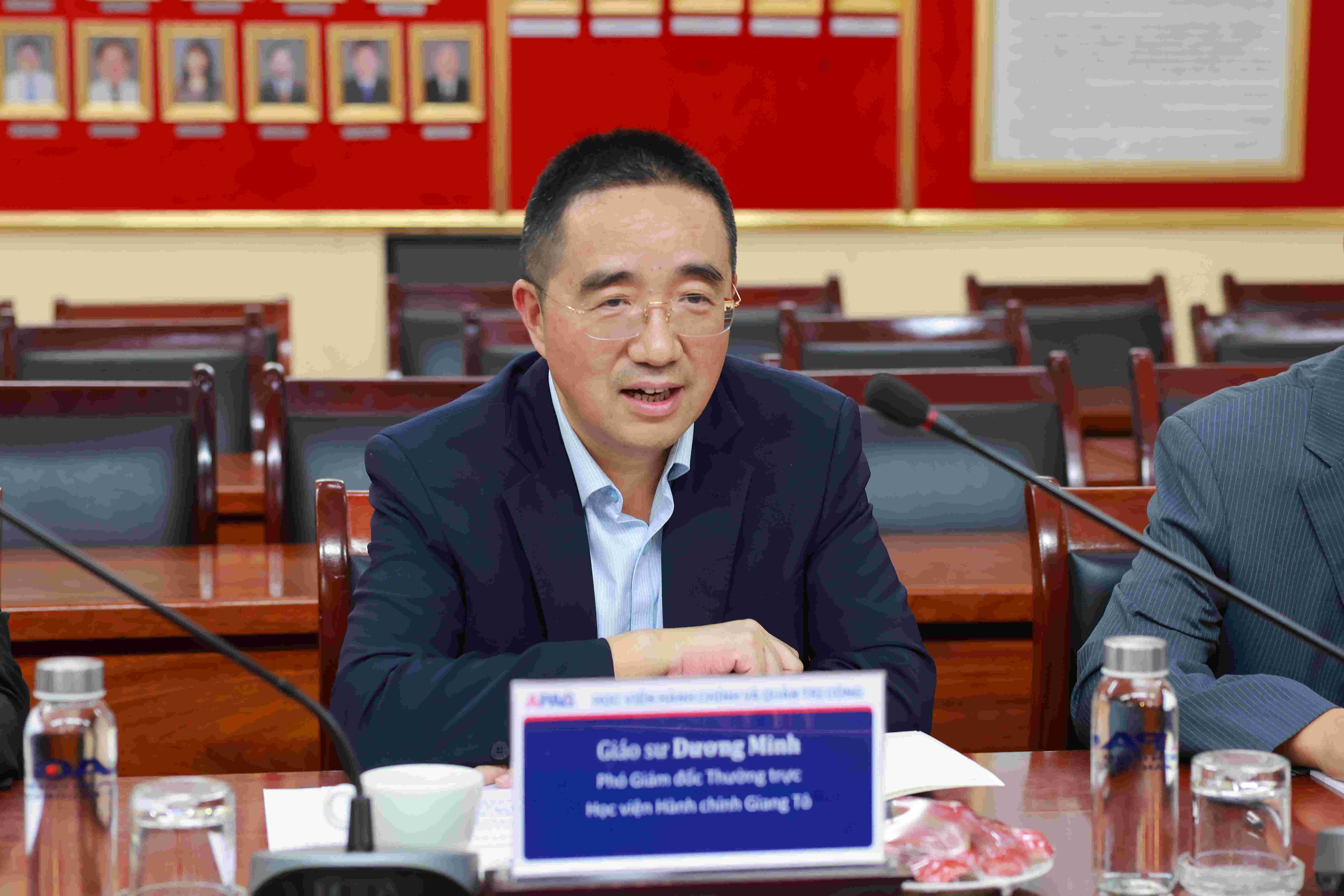 Thay mặt Đoàn công tác, Giáo sư Dương Minh - Phó Giám đốc Thường trực Học viện Hành chính Giang Tô bày tỏ lời cảm ơn sâu sắc tới Ban Giám đốc Học viện Hành chính và Quản trị công vì sự đón tiếp trọng thị, chu đáo và thân tình. Ông đánh giá cao những kết quả mà Học viện đã đạt được trong đổi mới nội dung, phương pháp đào tạo và hoạt động nghiên cứu khoa học, đồng thời khẳng định mong muốn tăng cường hợp tác giữa hai bên thông qua các chương trình trao đổi học thuật, giao lưu giảng viên - học viên và phối hợp nghiên cứu chuyên đề chung trong tương lai.
