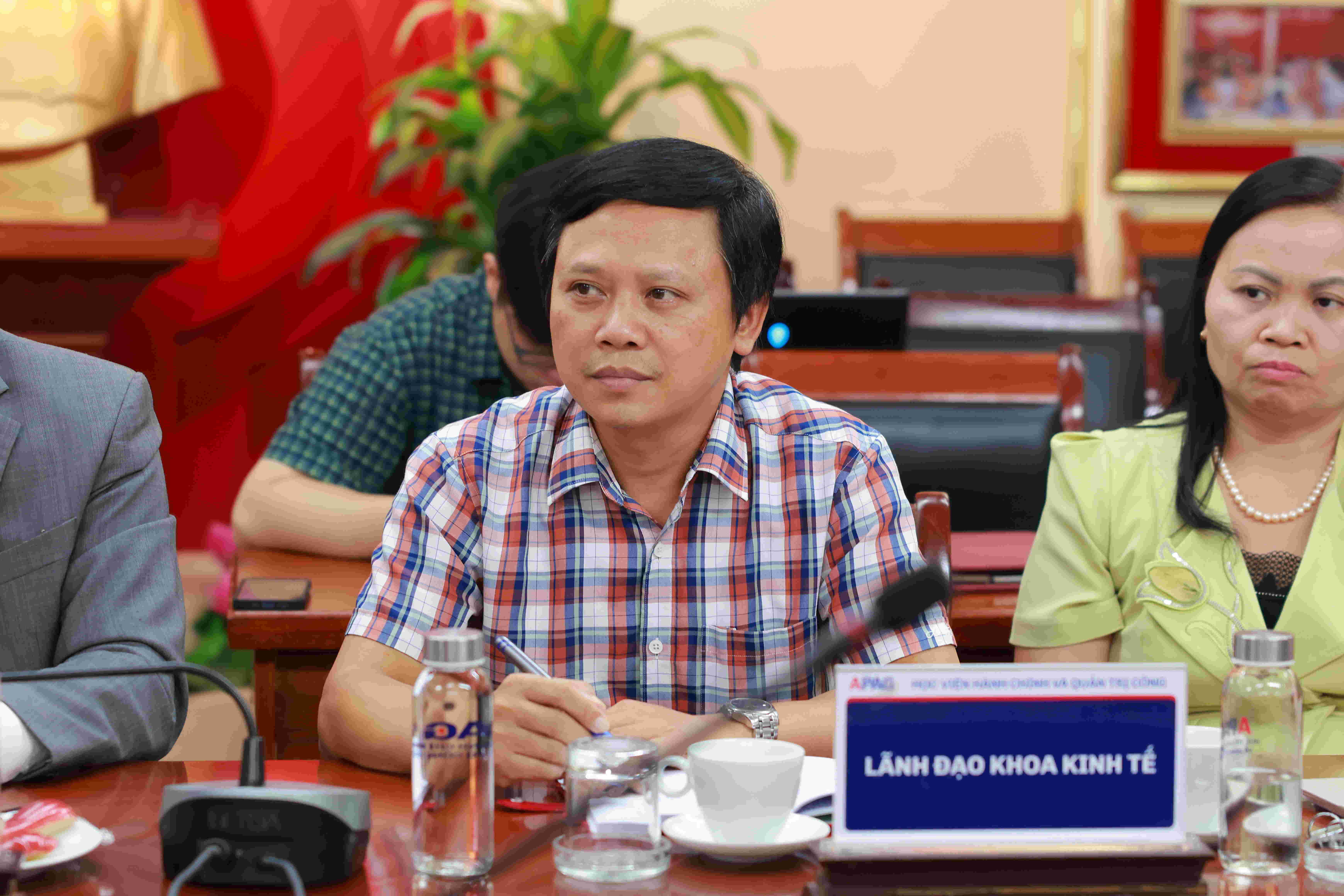 Về phía Học viện Hành chính và Quản trị công, tham dự buổi làm việc có:TS. Bùi Phương Đình, Phó Giám đốc Học viện; PGS.TS. Nguyễn Thị Thu Hà, Trưởng khoa, Khoa Khoa học liên - Ngoại ngữ - Tin học; TS. Phạm Văn Đại, Phó Trưởng khoa, Khoa Kinh tế; ThS. Phạm Thị Quỳnh Hoa, Quyền Trưởng ban, Ban Quản lý khoa học và Hợp tác quốc tế; ThS. Lê Thị Tuyết, Phó Trưởng ban, Ban Quản lý khoa học và Hợp tác quốc tế.