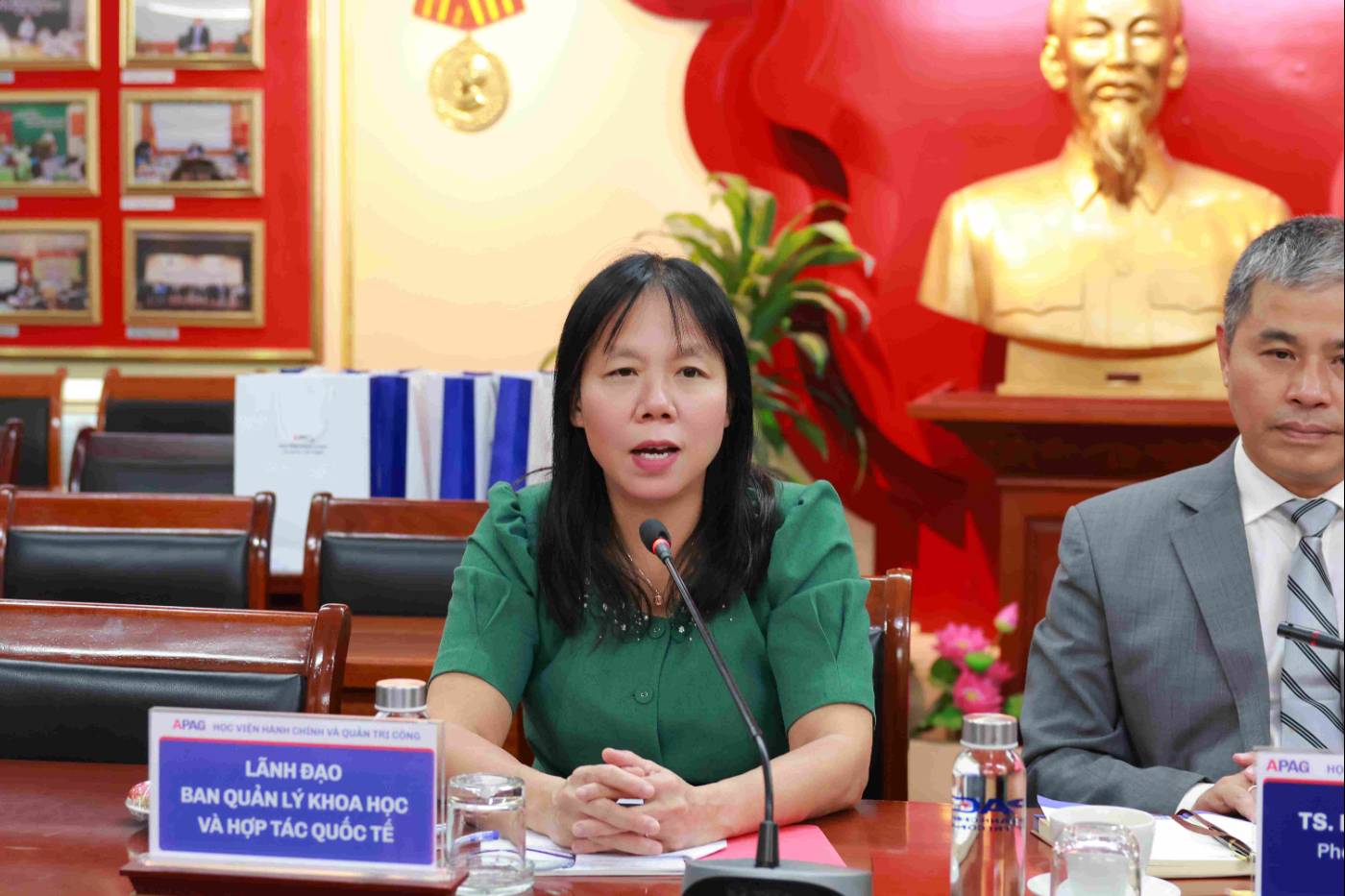 ThS. Phạm Thị Quỳnh Hoa, Quyền Trưởng ban, Ban Quản lý khoa học và Hợp tác quốc tế phát biểu tại buổi làm việc.Buổi làm việc khép lại trong bầu không khí thân mật, hiểu biết và hợp tác, thể hiện tinh thần hữu nghị, đoàn kết giữa hai Học viện, đồng thời mở ra triển vọng hợp tác sâu rộng và hiệu quả trong giai đoạn mới, góp phần thúc đẩy mối quan hệ hợp tác về giáo dục - đào tạo và nghiên cứu hành chính công giữa Việt Nam và Trung Quốc ngày càng phát triển bền vững.
