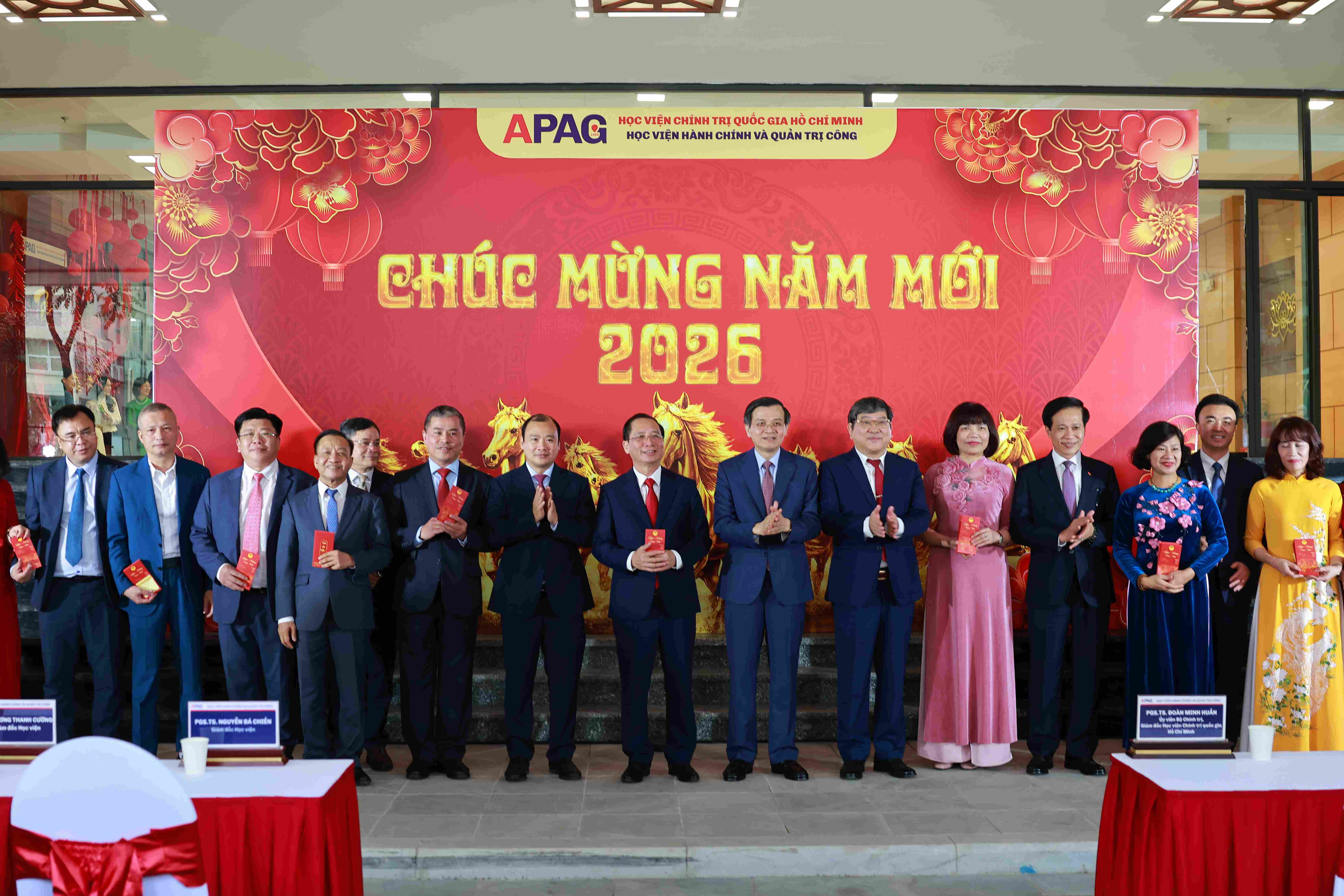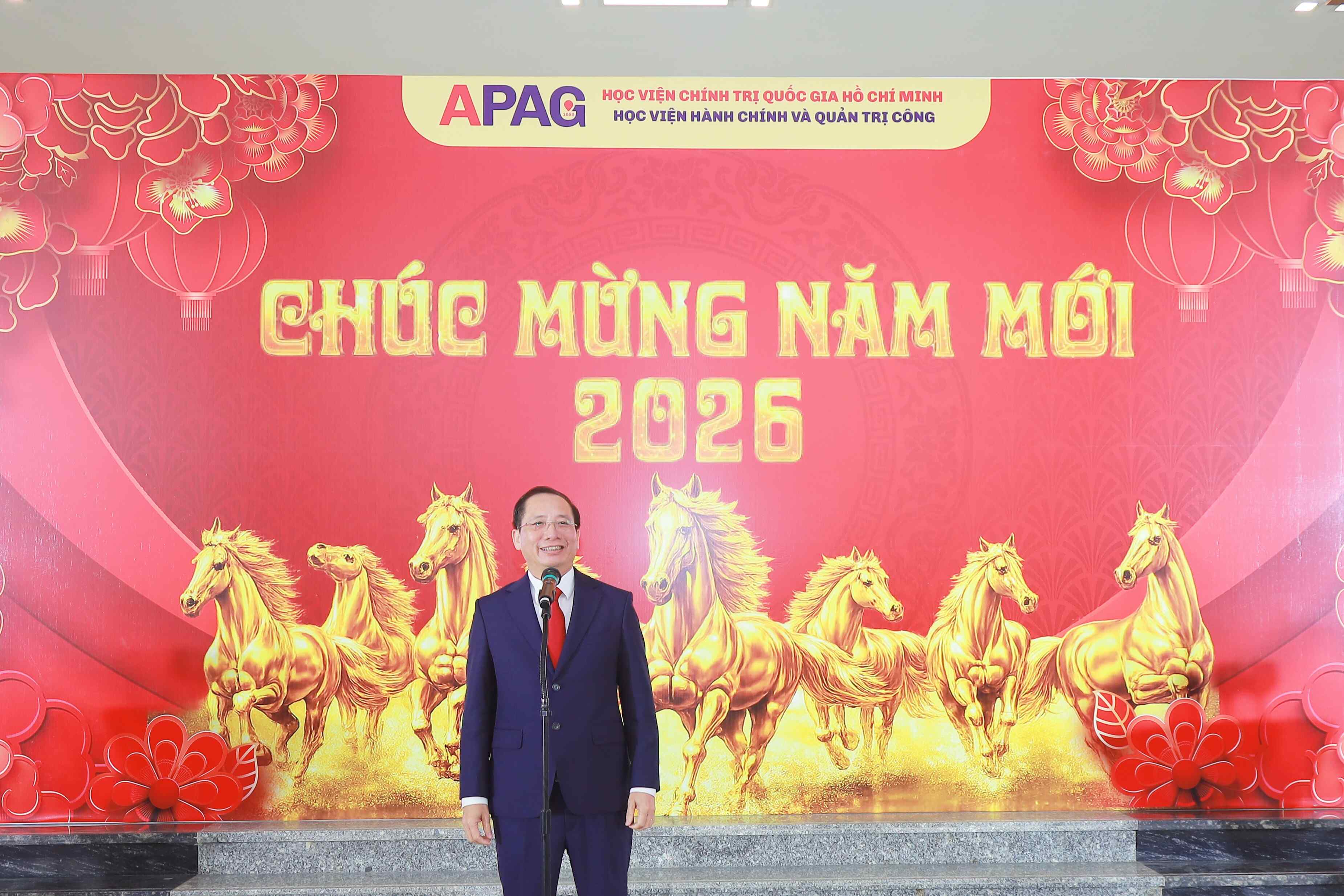 Năm mới Bính Ngọ 2026 với nhiều cơ hội và kỳ vọng mới, trước những yêu cầu và khát vọng của đất nước, PGS.TS. Đoàn Minh Huấn đề nghị toàn thể cán bộ, viên chức, người lao động Học viện Hành chính và Quản trị công phát huy tinh thần trách nhiệm, bắt tay ngay vào triển khai công việc, hoàn thành tốt các nhiệm vụ được giao. Tập trung cụ thể hóa và triển khai thực hiện Nghị quyết Đại hội XIV của Đảng; Nghị quyết Đại hội Đảng bộ Học viện Chính trị quốc gia Hồ Chí Minh; Đại hội Đảng bộ Học viện Hành chính và Quản trị công nhiệm kỳ 2025-2030. Thực hiện chủ đề năm học 2025-2026: “Đoàn kết - Kỷ cương - Nêu gương - Đột phá - Phát triển”; hoàn thành Chiến lược phát triển Học viện đến năm 2030, tầm nhìn 2045; tiếp tục đổi mới, nâng cao chất lượng đào tạo, bồi dưỡng, nghiên cứu khoa học và hợp tác quốc tế.