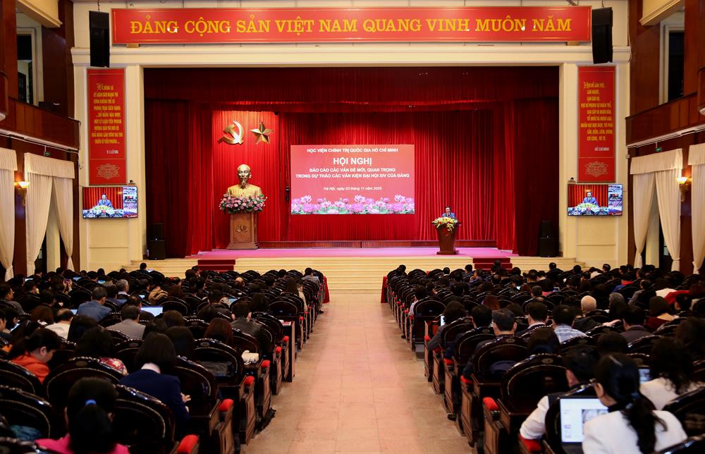 GS.TS. Nguyễn Xuân Thắng báo cáo tại Hội nghịTại Hội nghị, GS.TS. Nguyễn Xuân Thắng, Ủy viên Bộ Chính trị, Giám đốc Học viện, Chủ tịch Hội đồng Lý luận Trung ương, Tổ trưởng Tổ Biên tập Văn kiện Đại hội XIV của Đảng đã phổ biến, quán triệt những điểm mới về chủ đề, kết cấu của Dự thảo Văn kiện và 18 vấn đề mới, quan trọng của Dự thảo Báo cáo chính trị trình Đại hội XIV của Đảng.