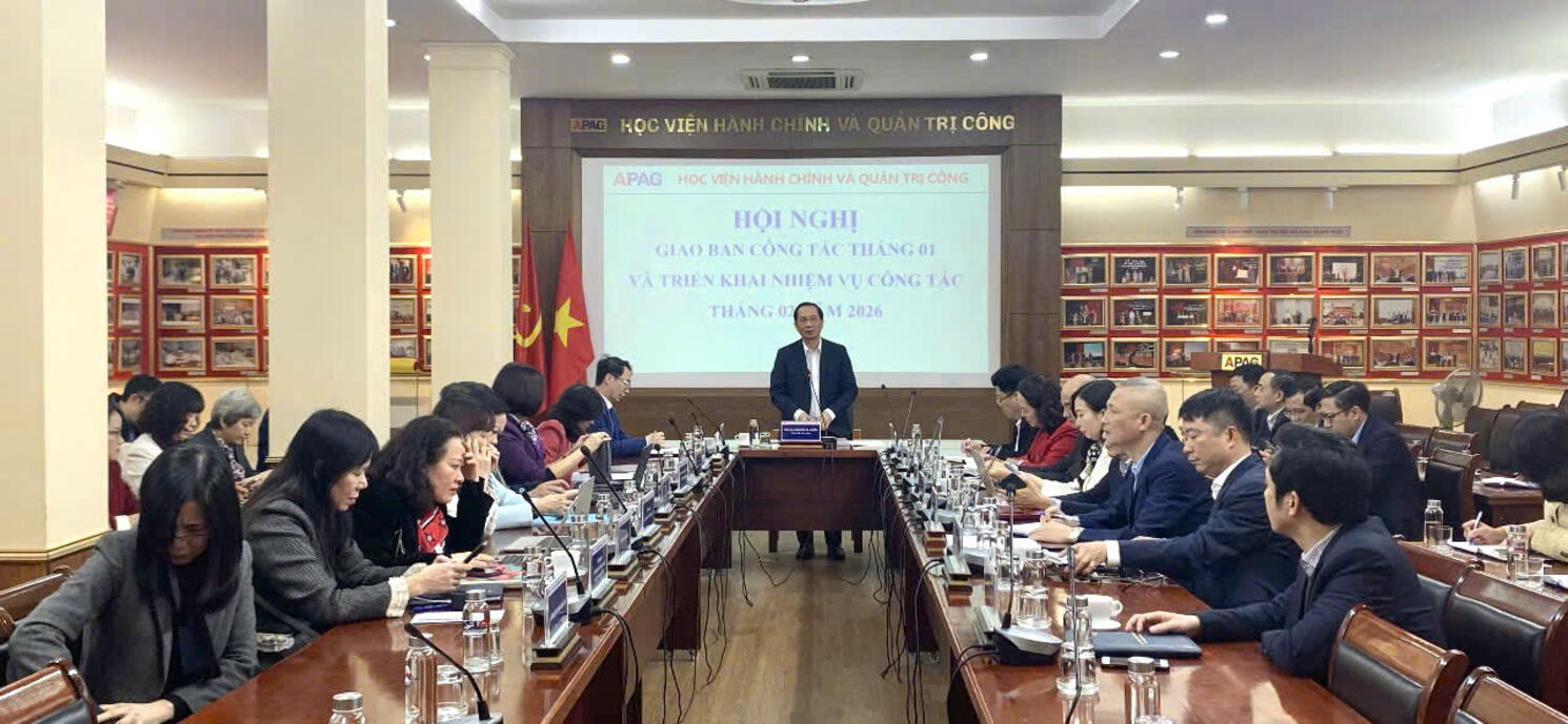 (apag.edu.vn) – Chiều ngày 28/01/2026, tại Trụ sở chính Học viện, Học viện Hành chính và Quản trị công tổ chức Hội nghị giao ban công tác tháng 01 và triển khai nhiệm vụ công tác tháng 02 năm 2026. PGS.TS. Nguyễn Bá Chiến, Giám đốc Học viện chủ trì Hội nghị.