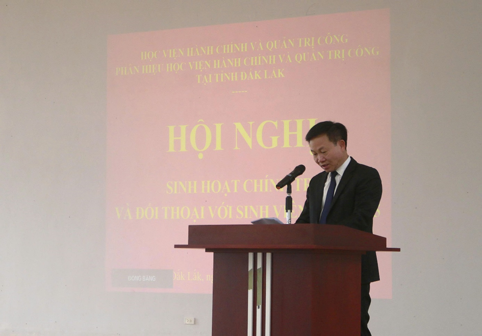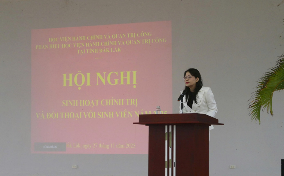 Ngày 27/11/2025, tại Hội trường lớn, Phân hiệu Học viện Hành chính và Quản trị công tại tỉnh Đắk Lắk đã tổ chức thành công “Hội nghị sinh hoạt chính trị và đối thoại giữa lãnh đạo Phân hiệu với sinh viên năm 2025”. Đây là hoạt động thường niên của Phân hiệu nhằm phát huy dân chủ trong Nhà trường, đảm bảo kênh thông tin hai chiều giữa sinh viên với lãnh đạo Nhà trường về những vấn đề mà sinh viên quan tâm liên quan đến chương trình đào tạo, phương pháp giảng dạy, cơ sở vật chất, chế độ chính sách, hoạt động Đoàn - Hội cũng như định hướng phát triển trong thời gian tới.