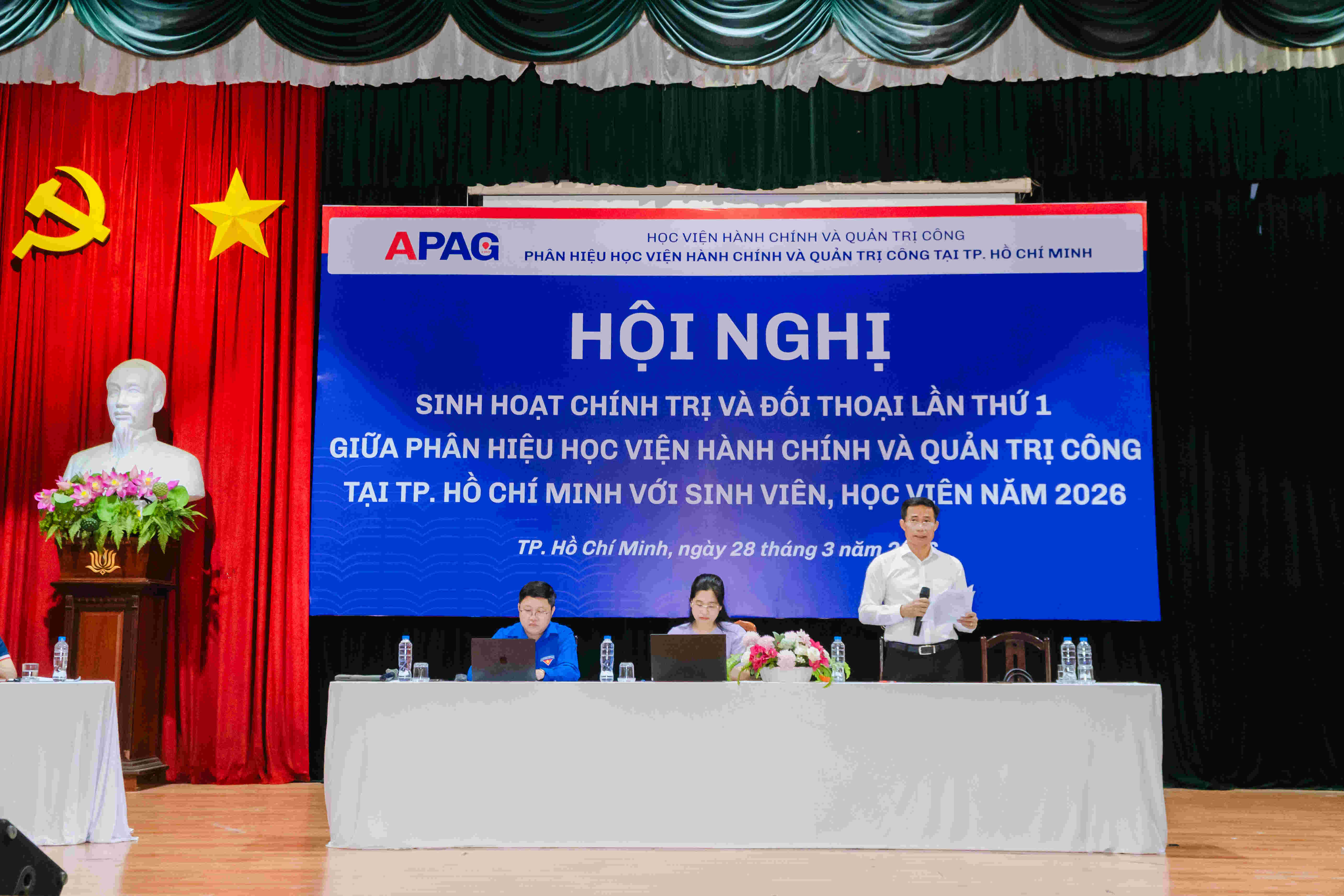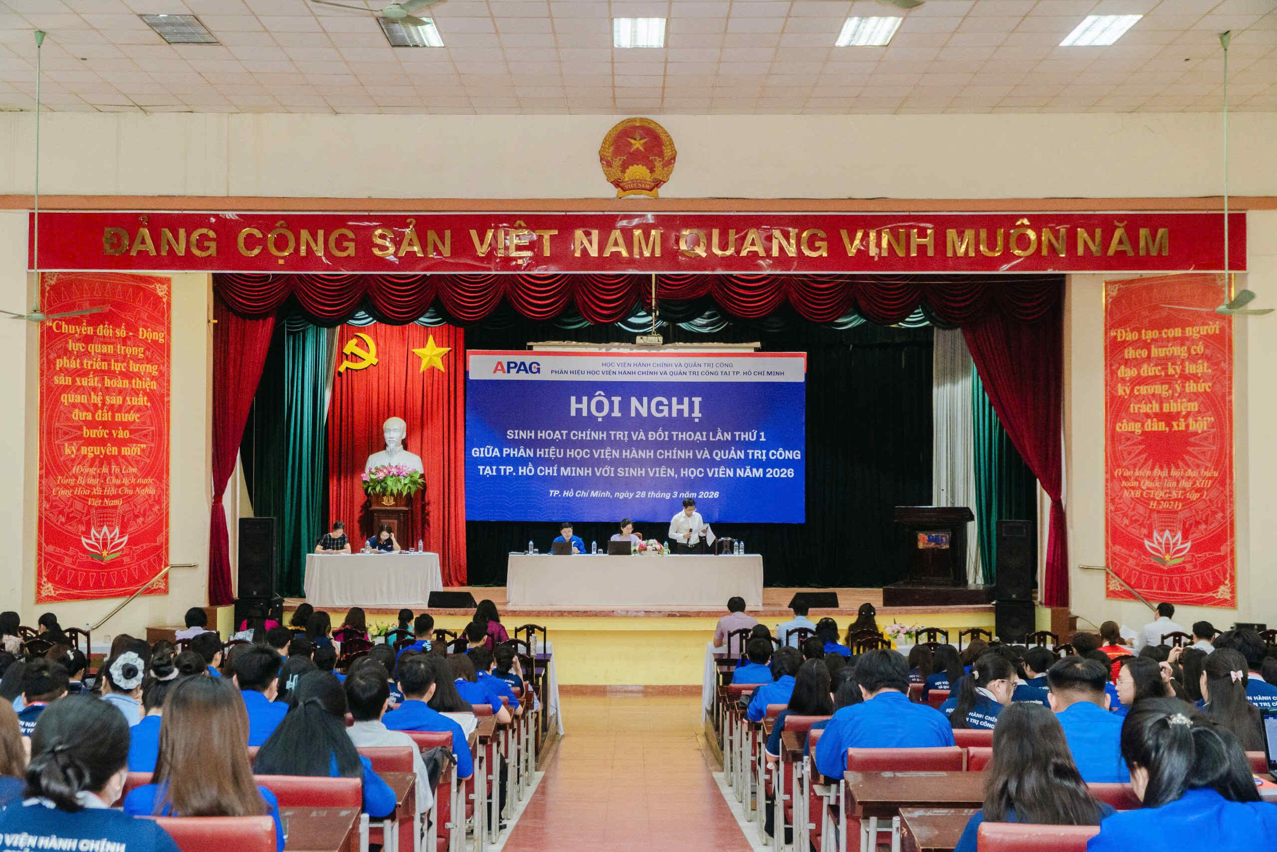 (apag.edu.vn) - Sáng ngày 28/3/2026, Phân hiệu Học viện Hành chính và Quản trị công tại TP. Hồ Chí Minh tổ chức Hội nghị sinh hoạt chính trị và đối thoại lần thứ 1 giữa Phân hiệu Học viện hành chính và Quản trị công tại TP. Hồ Chí Minh với sinh viên, học viên năm 2026. Đây là hoạt động được tổ chức định kỳ hai lần mỗi năm, thể hiện sự quan tâm của Phân hiệu trong việc tạo dựng diễn đàn đối thoại cởi mở, lắng nghe ý kiến sinh viên nhằm xây dựng môi trường giáo dục ngày càng chất lượng và hiệu quả.