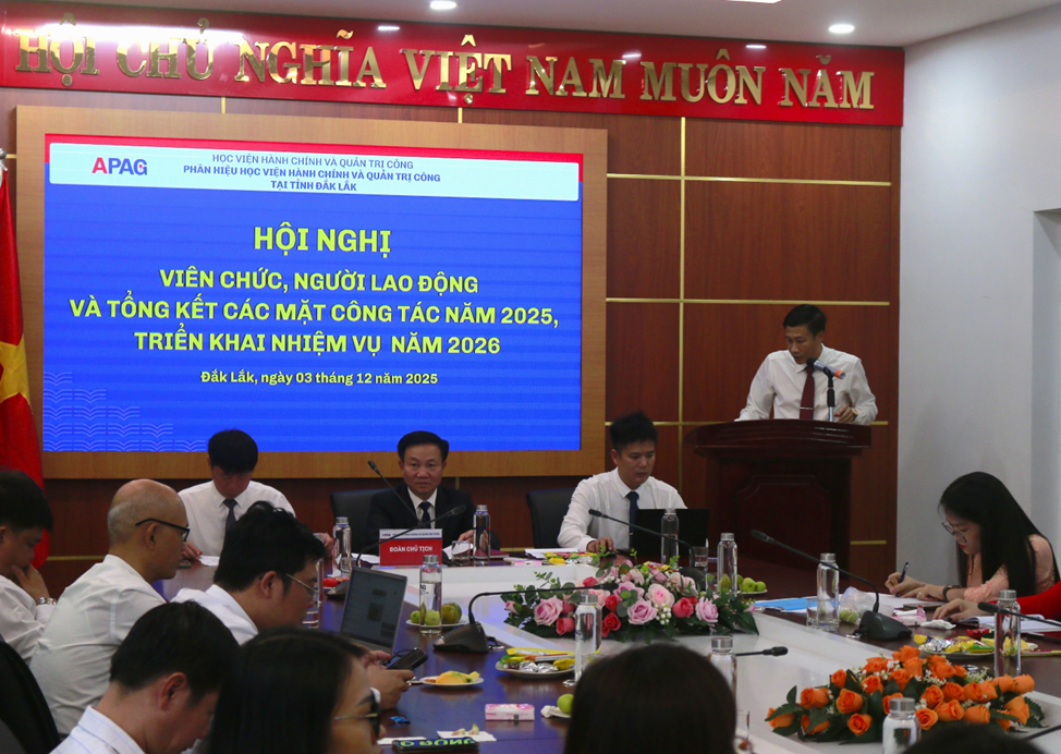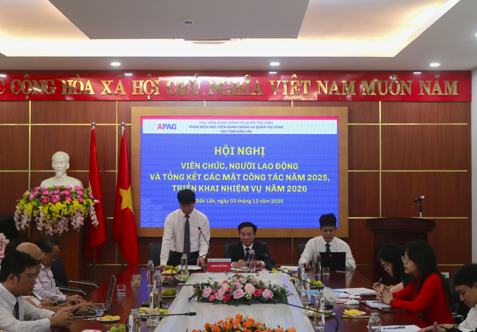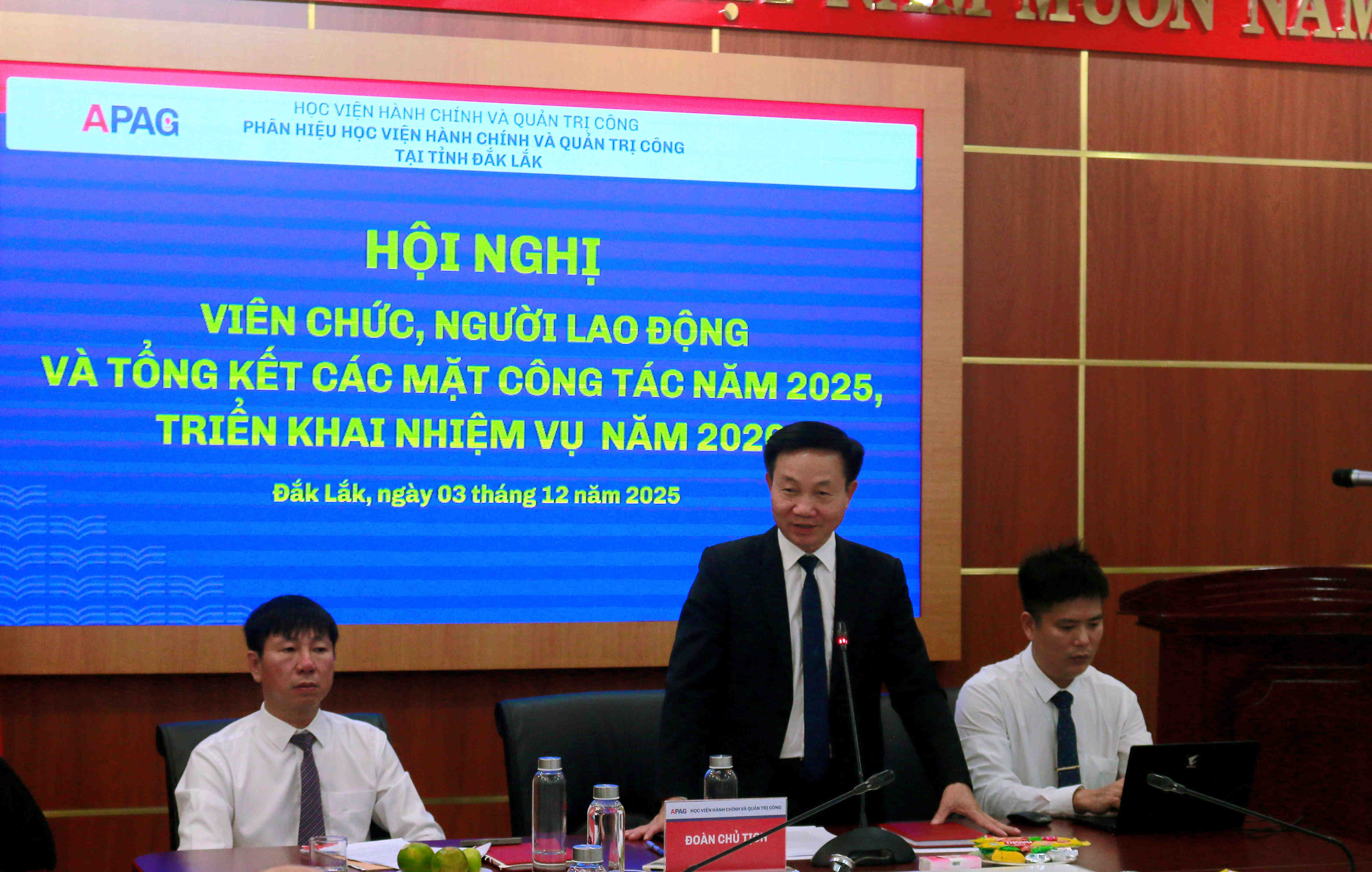 Chiều ngày 03/12/2025, Phân hiệu Học viện Hành chính và Quản trị công tại tỉnh Đắk Lắk đã tổ chức hội nghị viên chức, người lao động và tổng kết các mặt công tác năm 2025, triển khai nhiệm vụ năm 2026.