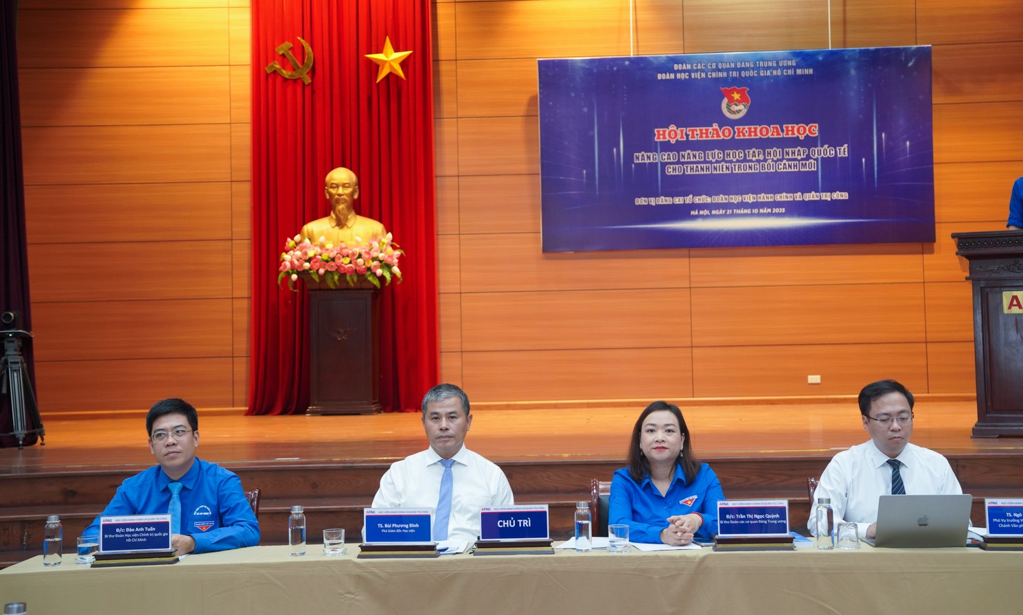 Đoàn chủ trì Hội thảo gồm: TS. Bùi Phương Đình - Ủy viên Ban Thường vụ Đảng ủy, Phó Giám đốc Học viện Hành chính và Quản trị công; TS. Ngô Ngân Hà - Phó Vụ trưởng Vụ Tổ chức cán bộ, Chánh Văn phòng Đề án 587 Học viện Chính trị quốc gia Hồ Chí Minh; đồng chí Trần Thị Ngọc Quỳnh - Bí thư Đoàn các cơ quan Đảng Trung ương; đồng chí Đào Anh Tuấn - Ủy viên Ban Chấp hành Trung ương, Bí thư Đoàn TNCS Hồ Chí Minh Học viện Chính trị quốc gia Hồ Chí Minh.