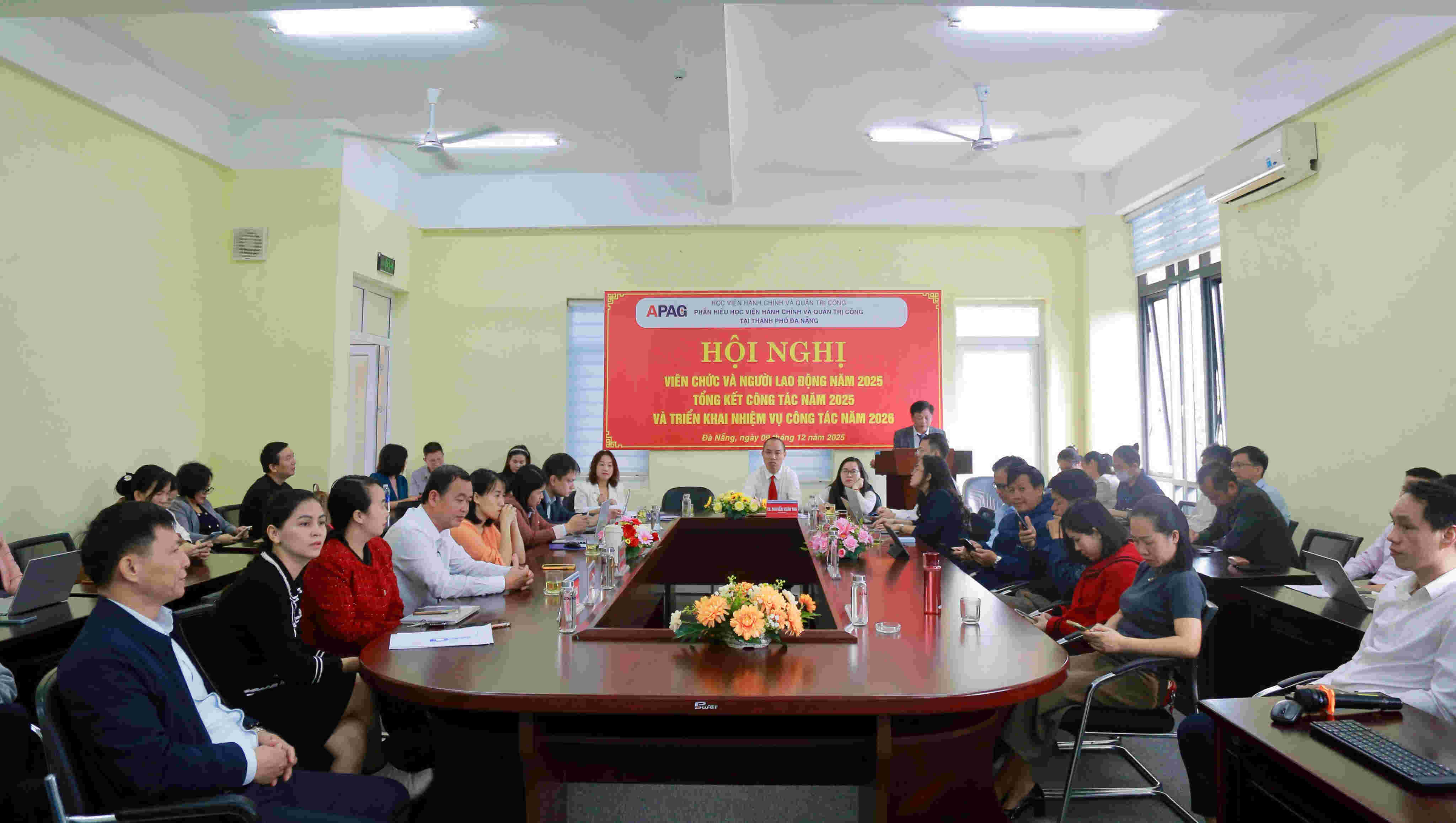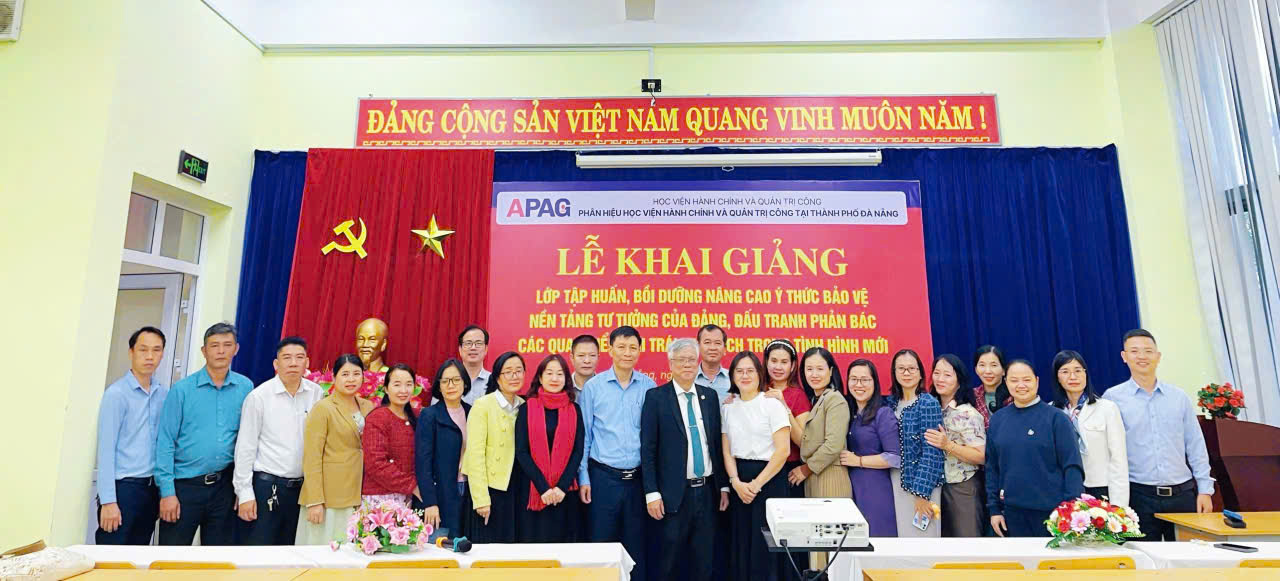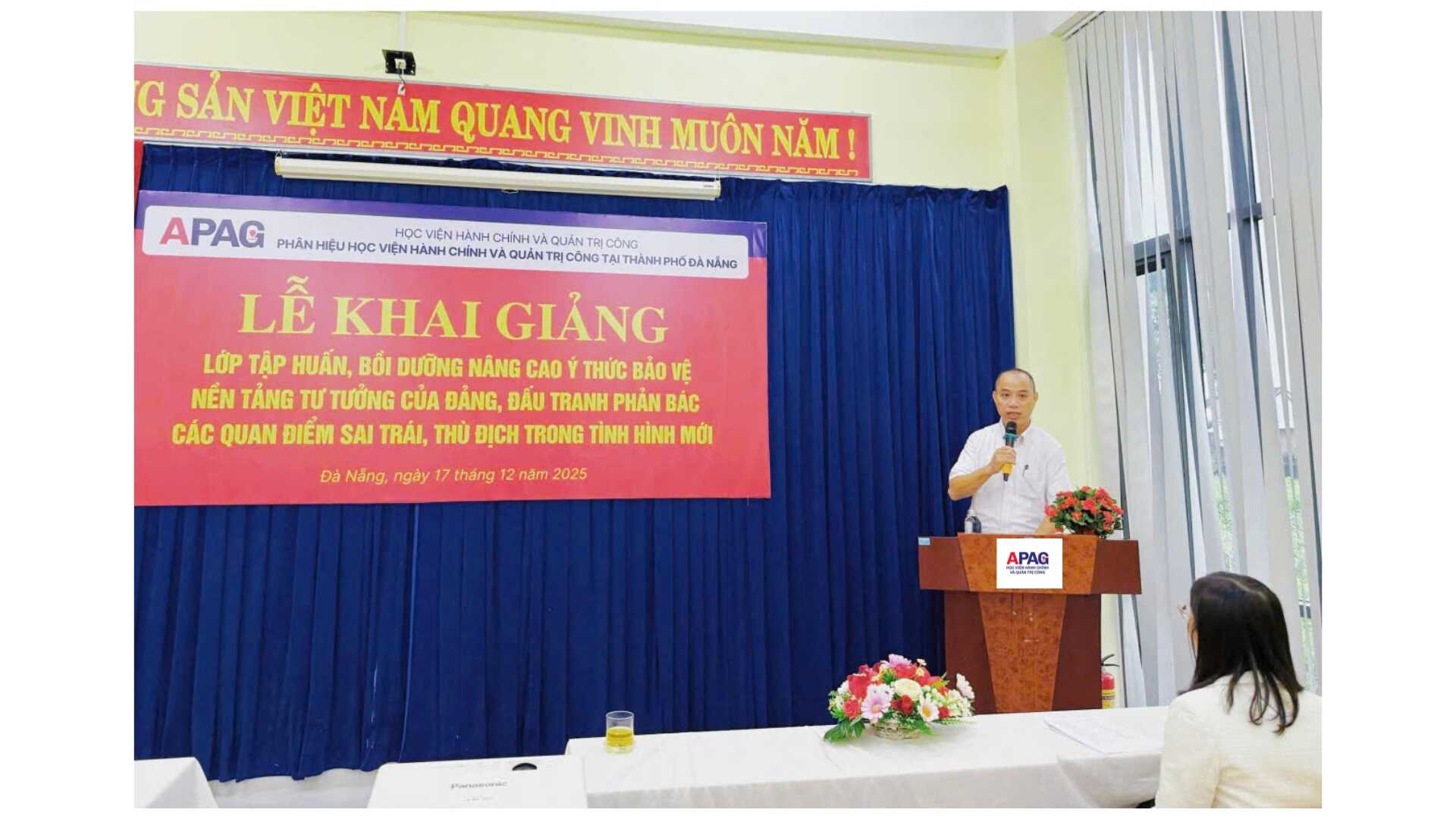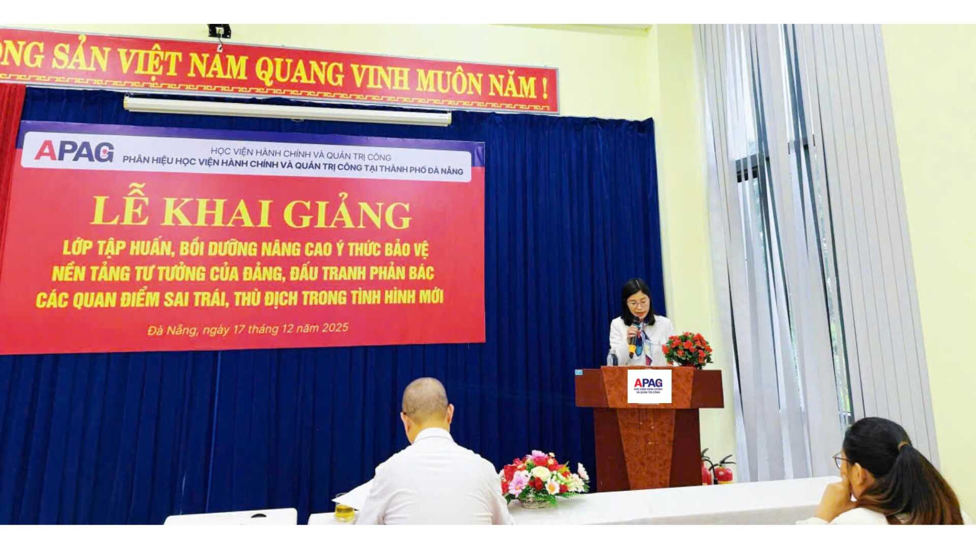 (apag.edu.vn) - Sáng ngày 17/12/2025, tại phòng B.105, Phân hiệu Học viện Hành chính và Quản trị công tại thành phố Đà Nẵng tổ chức Lễ Khai giảng Lớp tập huấn, bồi dưỡng “Nâng cao ý thức bảo vệ nền tảng tư tưởng của Đảng, đấu tranh phản bác các quan điểm sai trái, thù địch trong tình hình mới” dành cho viên chức, giảng viên Phân hiệu.
