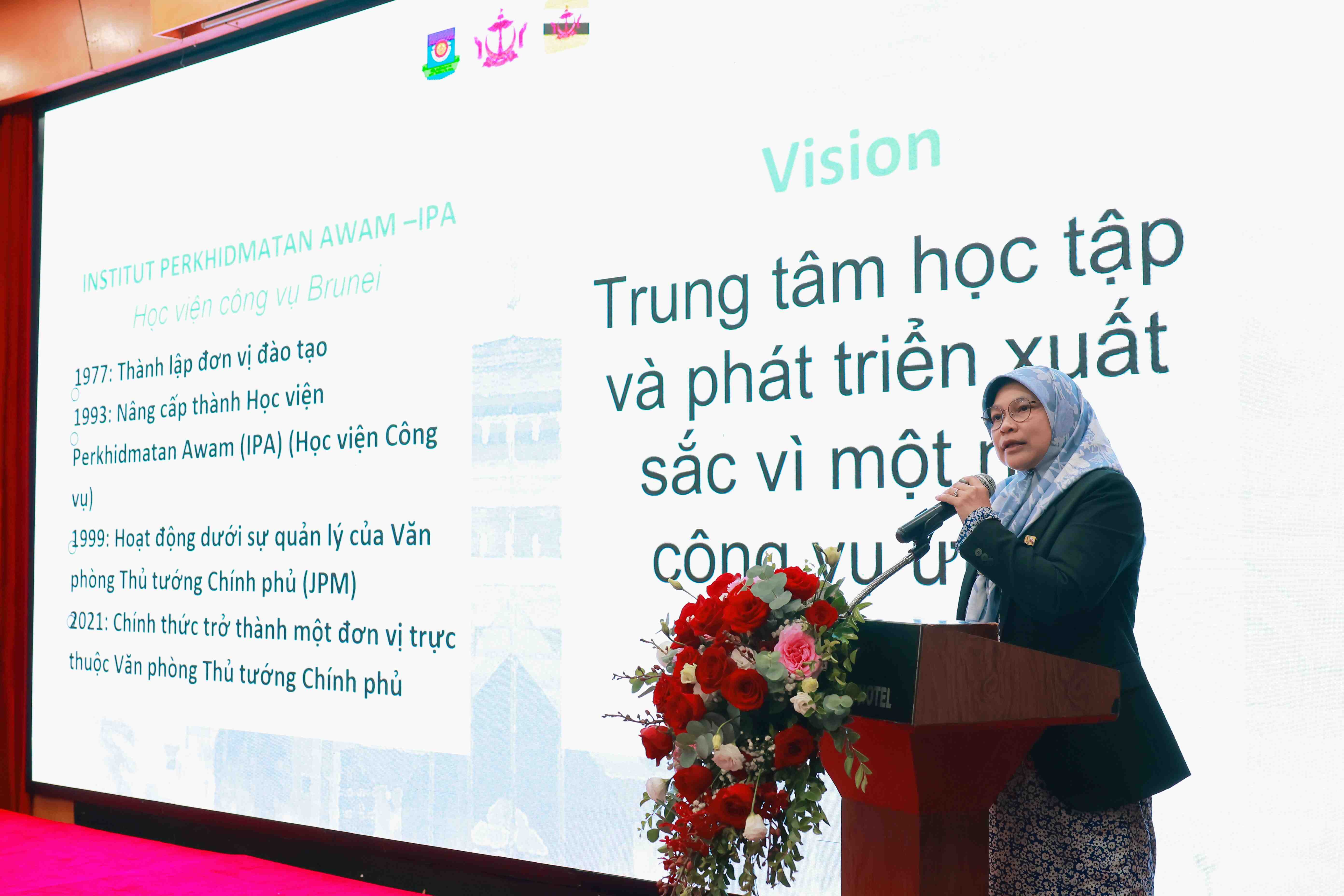 Với tham luận “Lãnh đạo đổi mới trong kỷ nguyên toàn cầu hóa và cách mạng công nghệ”, TS. Noor Maya Salleh cho rằng đổi mới sáng tạo trong khu vực công là nhiệm vụ bắt buộc nhằm tăng hiệu quả, củng cố niềm tin của người dân. Chính phủ cần xây dựng đội ngũ lãnh đạo có tầm nhìn, năng lực thích ứng và tư duy số, đồng thời thiết lập hệ sinh thái phát triển nguồn nhân lực công vụ (HRD) linh hoạt, kết nối giữa Nhà nước - doanh nghiệp - cơ sở đào tạo - xã hội. Theo TS. Salleh, thành công của quản trị công trong thời đại biến động sẽ phụ thuộc vào năng lực của lãnh đạo, khả năng dự báo trước những thay đổi phức tạp của tình hình thế giới, đồng thời lãnh đạo cần có tầm nhìn, có tư duy chiến lược, khả năng đổi mới mạnh mẽ, biến thách thức toàn cầu thành cơ hội phát triển bền vững quốc gia.