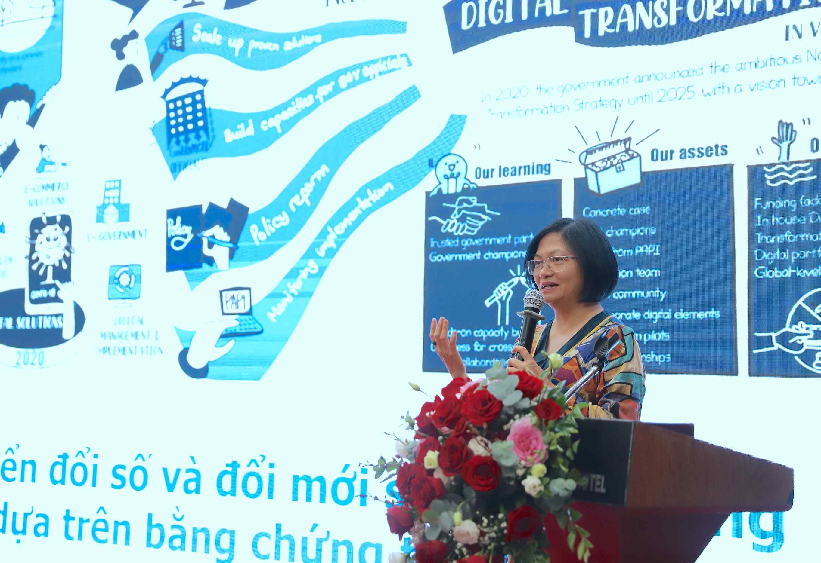 Tại Diễn đàn, bà Đỗ Thanh Huyền chia sẻ về kinh nghiệm thúc đẩy đổi mới sáng tạo và chuyển đổi số trong khu vực công dựa trên bằng chứng tại Việt Nam. Bà nhấn mạnh vai trò của PAPI - công cụ đánh giá hiệu quả quản trị và hành chính công như một nguồn dữ liệu quan trọng giúp chính quyền trung ương và địa phương cải thiện chất lượng điều hành, nâng cao tính minh bạch và trách nhiệm giải trình. Bà khẳng định thêm, đổi mới sáng tạo trong khu vực công chỉ thực sự hiệu quả khi dựa trên dữ liệu, bằng chứng và sự tham gia của người dân, qua đó thúc đẩy chuyển đổi số toàn diện, minh bạch và lấy người dân làm trung tâm trong quản trị công tại Việt Nam.