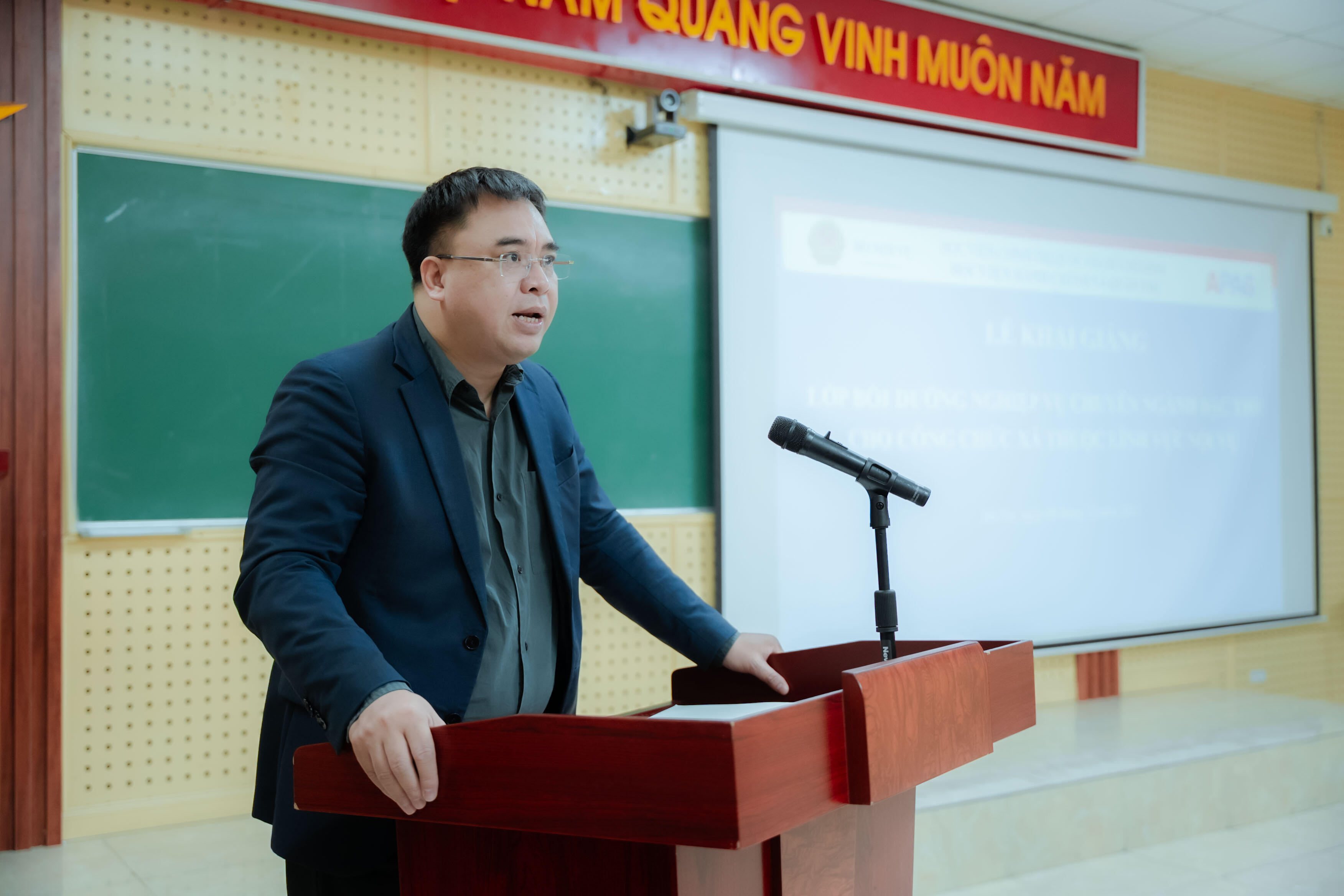 Phát biểu tại buổi lễ, GS.TS. Nguyễn Quốc Sửu, Phó Giám đốc Học viện Hành chính va Quản trị công gửi lời chúc mừng đến toàn thể học viên tham gia khóa bồi dưỡng. GS.TS. Nguyễn Quốc Sửu nhấn mạnh, đội ngũ công chức xã hiện nay đang đảm nhiệm nhiều nhiệm vụ quan trọng và ngày càng phức tạp, nhất là trong bối cảnh đổi mới sắp xếp bộ máy chính quyền địa phương theo hướng tinh gọn, hiệu lực và hiệu quả. Do đó, việc tổ chức lớp bồi dưỡng là yêu cầu cấp thiết nhằm trang bị kiến thức mới, cập nhật kỹ năng nghề nghiệp cho cán bộ, công chức tại cơ sở - những người trực tiếp tiếp xúc, giải quyết công việc cho người dân hằng ngày.