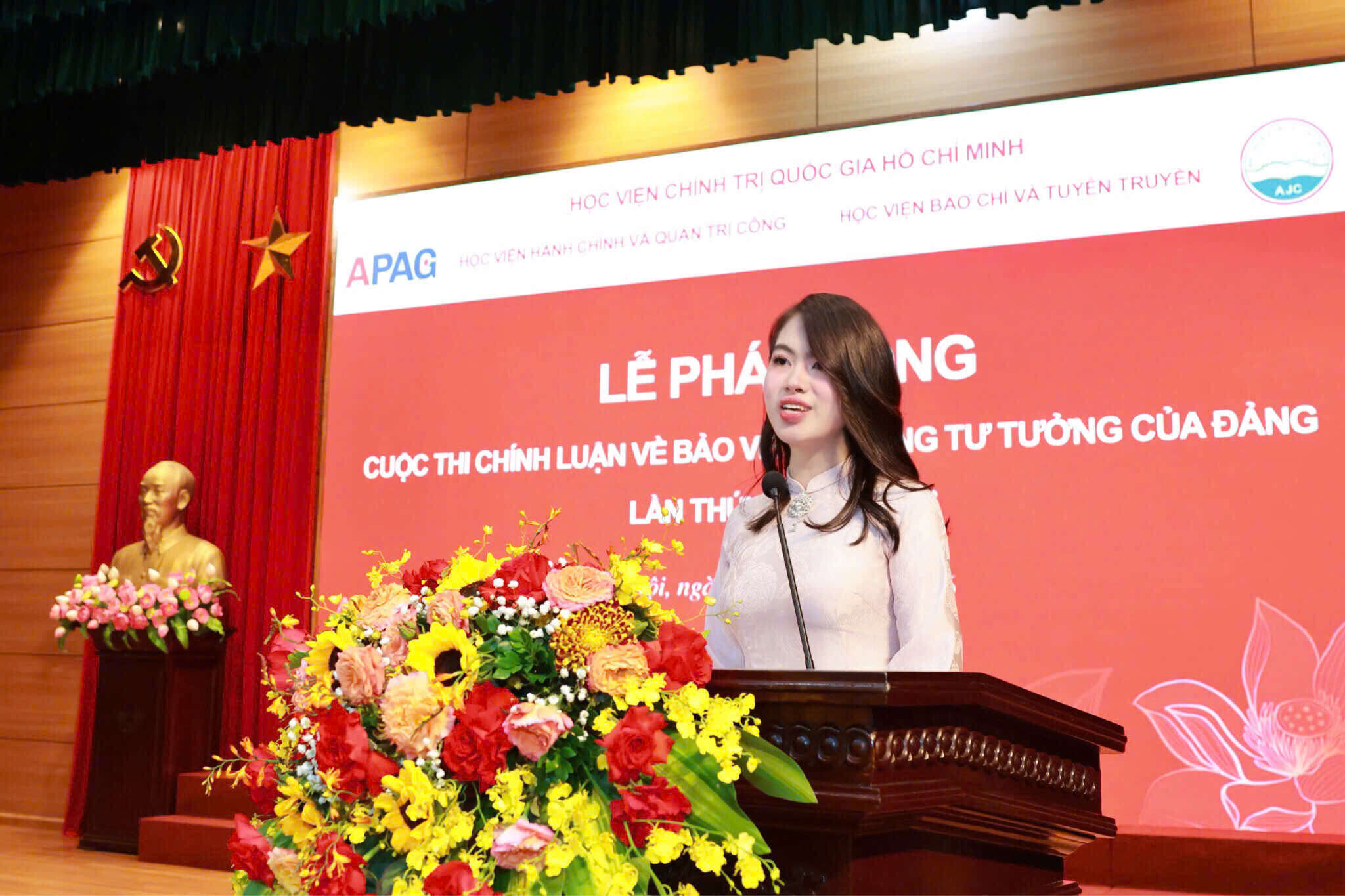 Em Nguyễn Thu Huyền Trang, sinh viên lớp Xây dựng Đảng và Chính quyền nhà nước, K23A Học viện Hành chính và Quản trị công phát biểu hưởng ứng Cuộc thi.Buổi lễ kết thúc trong không khí trang trọng, thể hiện quyết tâm của cán bộ, giảng viên và học viên, sinh viên hai Học viện trong việc tích cực tham gia và đóng góp những tác phẩm chính luận có chất lượng cho Cuộc thi năm 2026.