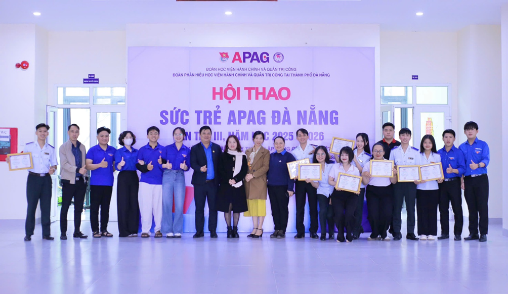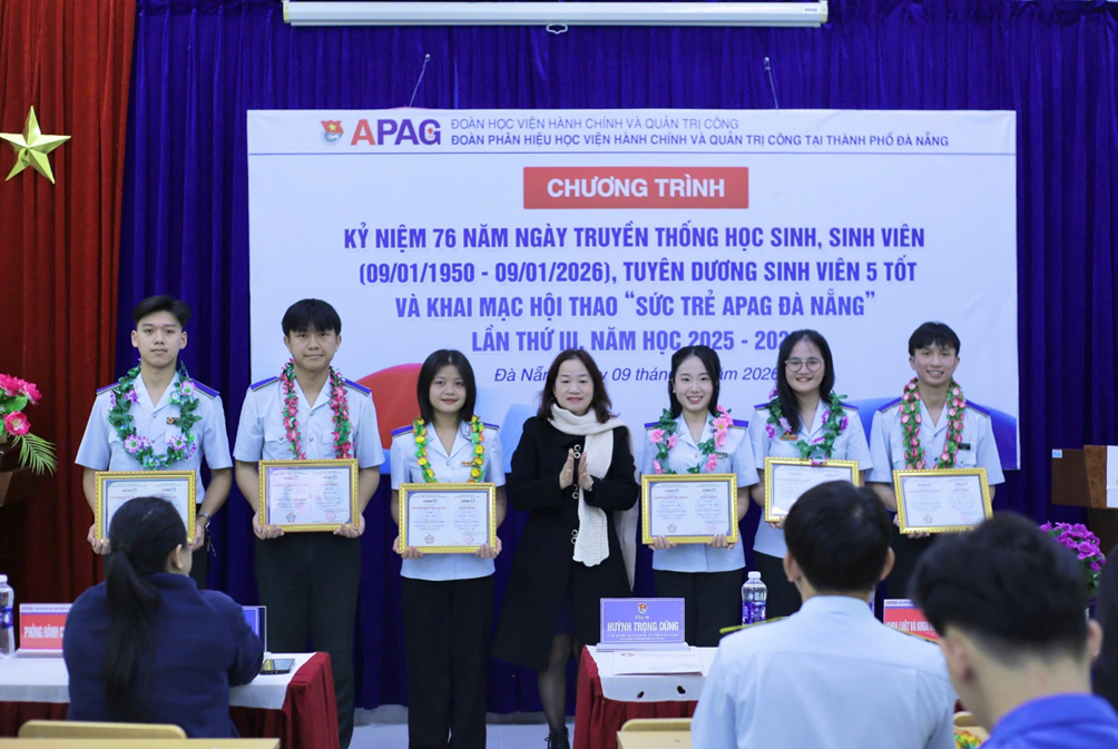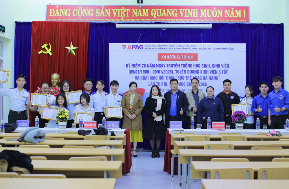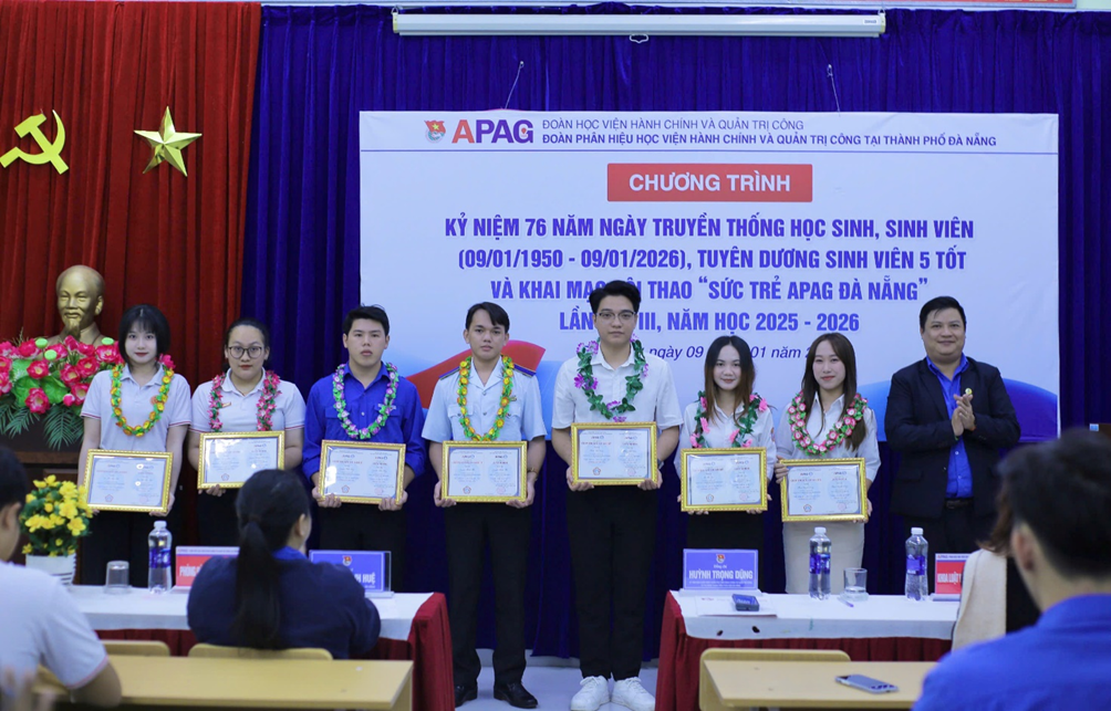 (apag.edu.vn) - Sáng ngày 09/01/2026, hòa chung không khí tuổi trẻ cả nước hướng tới kỷ niệm 76 năm Ngày truyền thống học sinh, sinh viên và Hội Sinh viên Việt Nam (09/01/1950 - 09/01/2026), Đoàn Thanh niên Phân hiệu Học viện Hành chính và Quản trị công tại TP. Đà Nẵng đã long trọng tổ chức Lễ kỷ niệm, Tuyên dương “Sinh viên 5 tốt” và Khai mạc Hội thao “Sức trẻ APAG Đà Nẵng” lần thứ III, năm học 2025 - 2026.