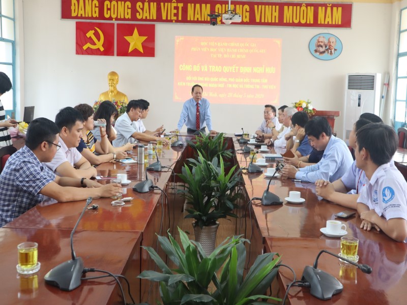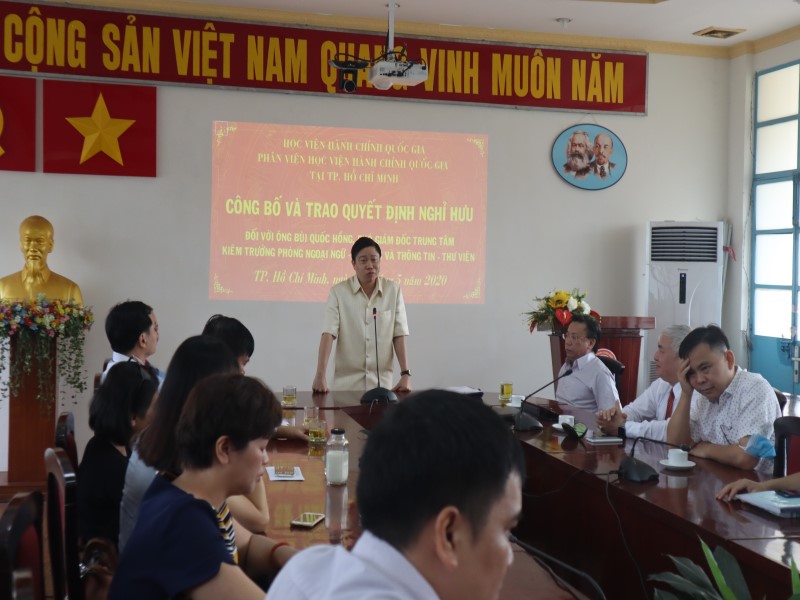 Thực hiện Quyết định số 678/QĐ-HCQG ngày 07/4/2020 của Giám đốc Học viện Hành chính Quốc gia về việc viên chức nghỉ hưu hưởng chế độ bảo hiểm xã hội từ ngày 01/6/2020 đối với ông Bùi Quốc Hồng và thừa ủy quyền của Giám đốc Học vviện Hành chính Quốc gia, sáng 28/5/2020, Phân viện Học viện tại TP. Hồ Chí Minh đã tổ chức công bố và trao Quyết định nghỉ hưu hưởng chế độ bảo hiểm xã hội cho CN Bùi Quốc Hồng – Phó Giám đốc Trung tâm kiêm Trưởng phòng Ngoại ngữ – Tin học và Thông tin – Thư viện, Phân viện Học viện tại TP. Hồ Chí Minh với sự tham dự của TS. Hà Quang Thanh – Phó Giám đốc Thường trực Phân viện Học viện tại TP. Hồ Chí Minh, PGS.TS Huỳnh Văn Thới – Phó Giám đốc Phân viện Học viện tại TP. Hồ Chí Minh, PGS.TS Nguyễn Văn Hậu – Giám đốc Trung tâm Ngoại ngữ – Tin học và Thông tin – Thư viện và lãnh đạo các đơn vị thuộc Phân viện.