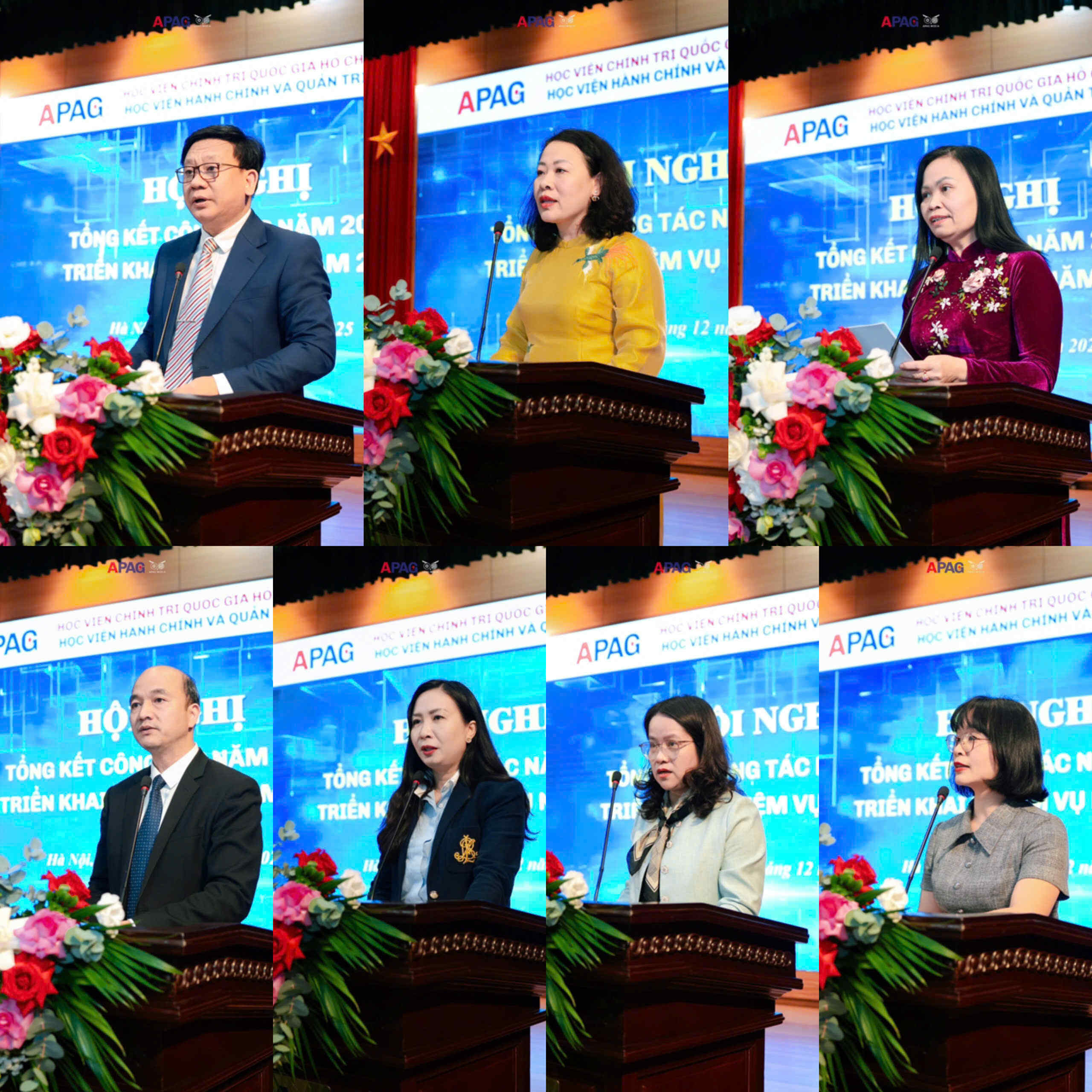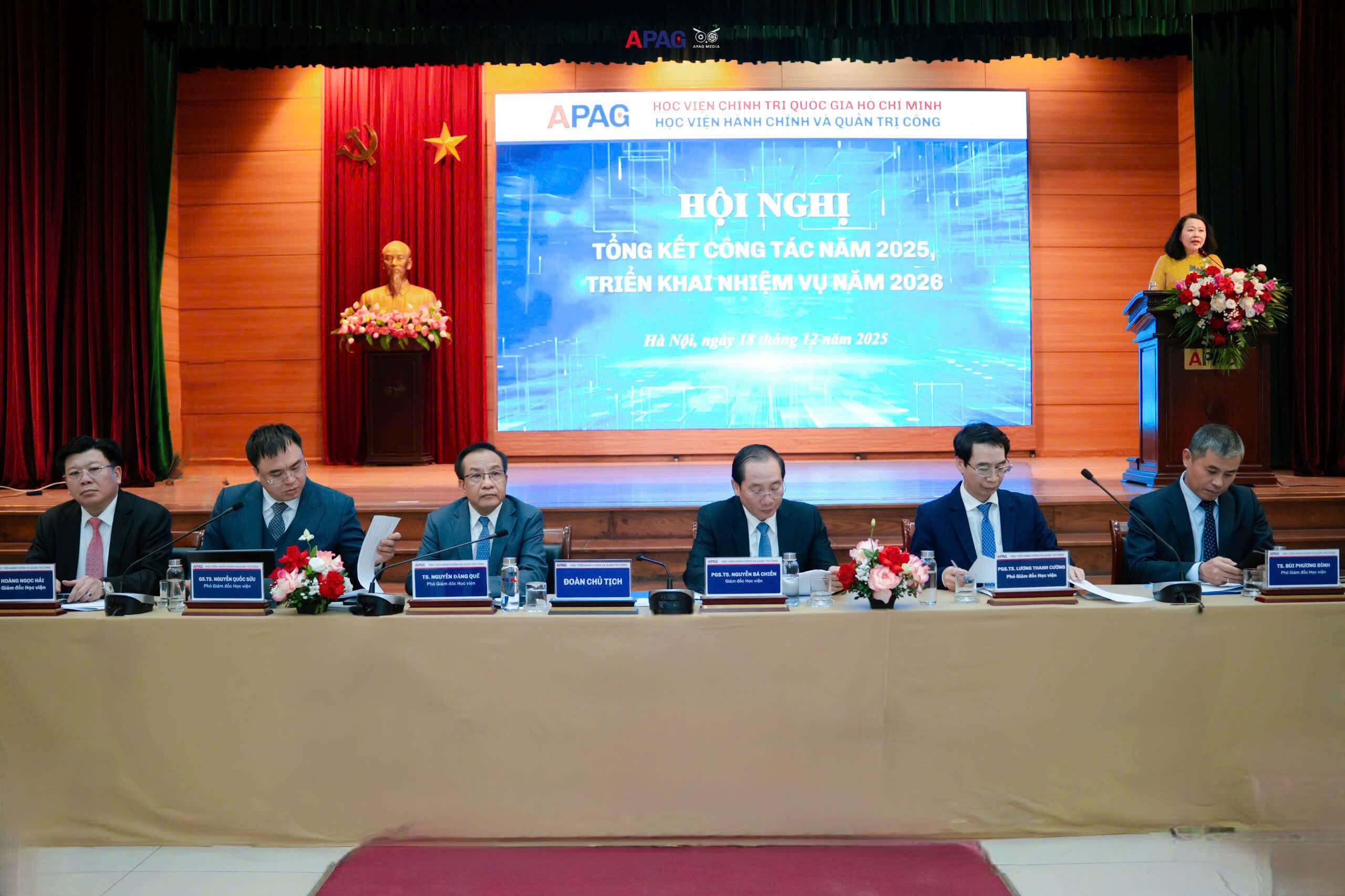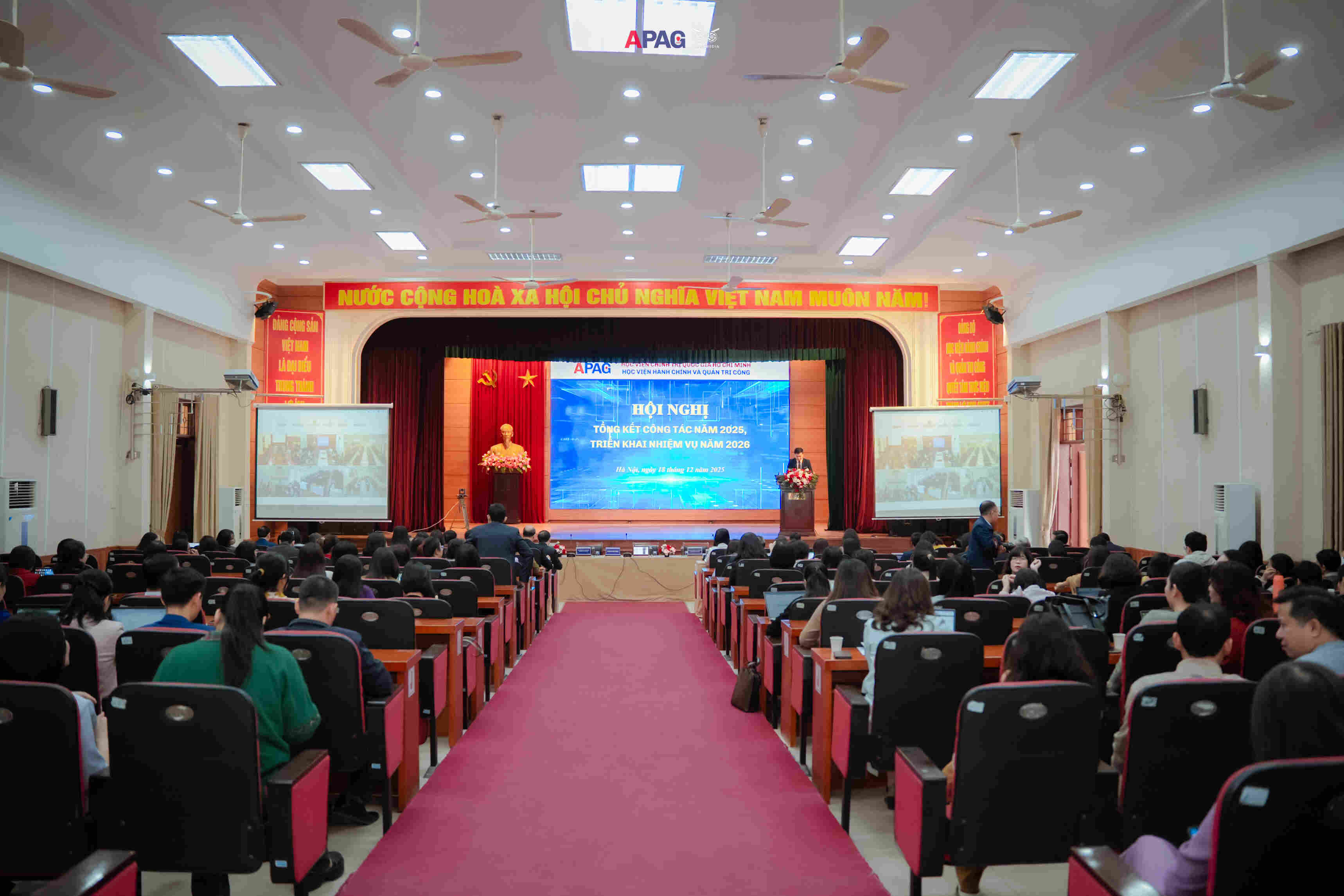 (apag.edu.vn) - Sáng ngày 18/12/2025, Học viện Hành chính và Quản trị công trang trọng tổ chức Hội nghị Tổng kết công tác năm 2025, triển khai nhiệm vụ năm 2026 với ba nội dung: Hội nghị Tổng kết công tác Đảng năm 2025, triển khai nhiệm vụ năm 2026; Hội nghị Viên chức, người lao động năm 2025; Hội nghị Tổng kết công tác năm 2025, triển khai phương hướng, nhiệm vụ năm 2026.