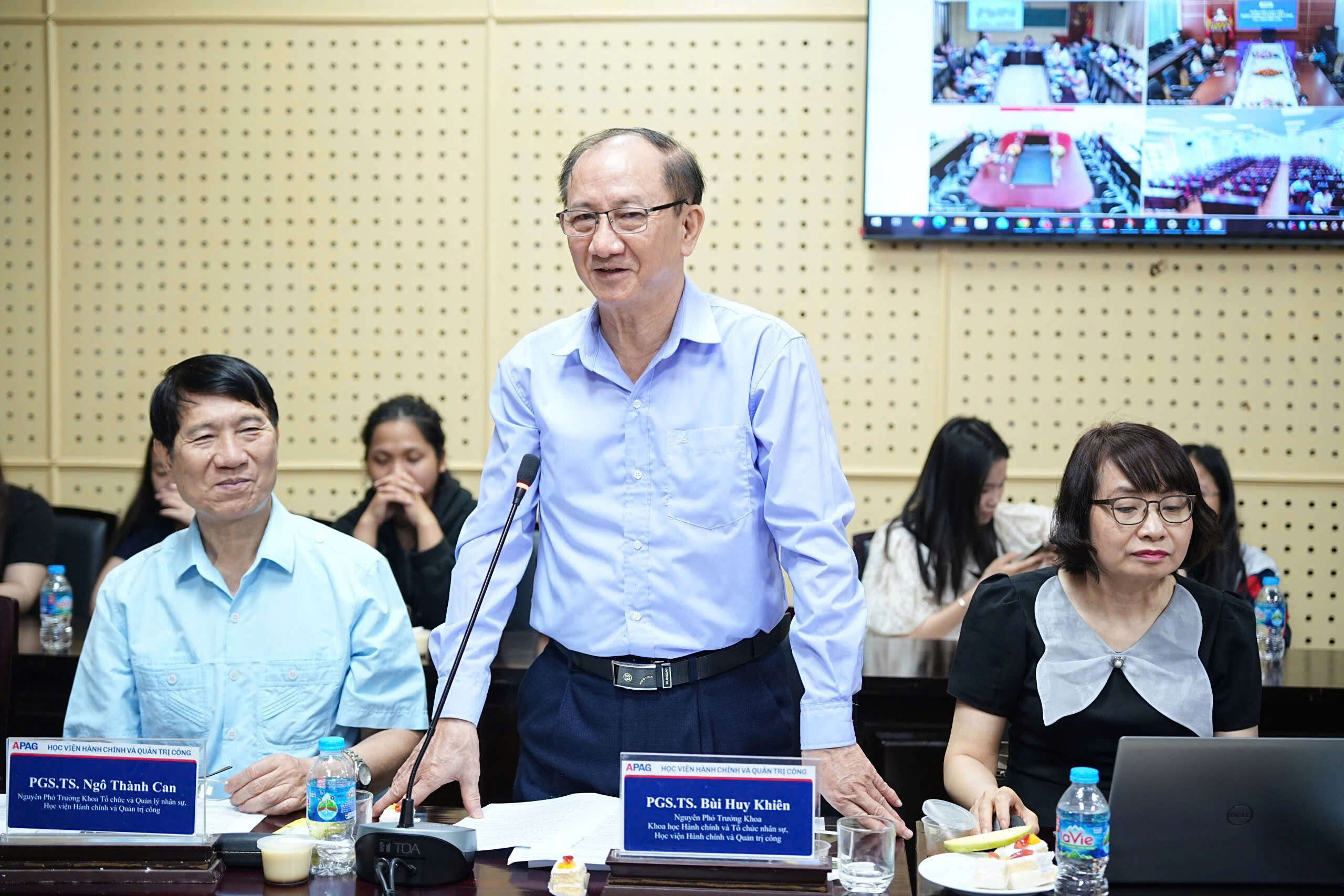 PGS.TS. Bùi Huy Khiên, nguyên Phó Trưởng khoa, Khoa Khoa học hành chính và Tổ chức nhân sự tham luận.Bên cạnh đó, Hội thảo cũng ghi nhận nhiều ý kiến trao đổi của các chuyên gia, nhà khoa học về xu hướng chuyển đổi từ quản lý hành chính sang quản trị mạng lưới, từ kiểm soát sang kiến tạo; nhấn mạnh vai trò của công nghệ, thị trường và hợp tác đa chủ thể trong nâng cao hiệu quả quản trị công. Các ý kiến cũng chỉ ra những thách thức lớn về thể chế, năng lực quản trị và cơ chế phối hợp, đồng thời đề xuất các giải pháp như đẩy mạnh chuyển đổi số, cải cách thể chế, phát triển nguồn nhân lực và thúc đẩy quản trị mở.