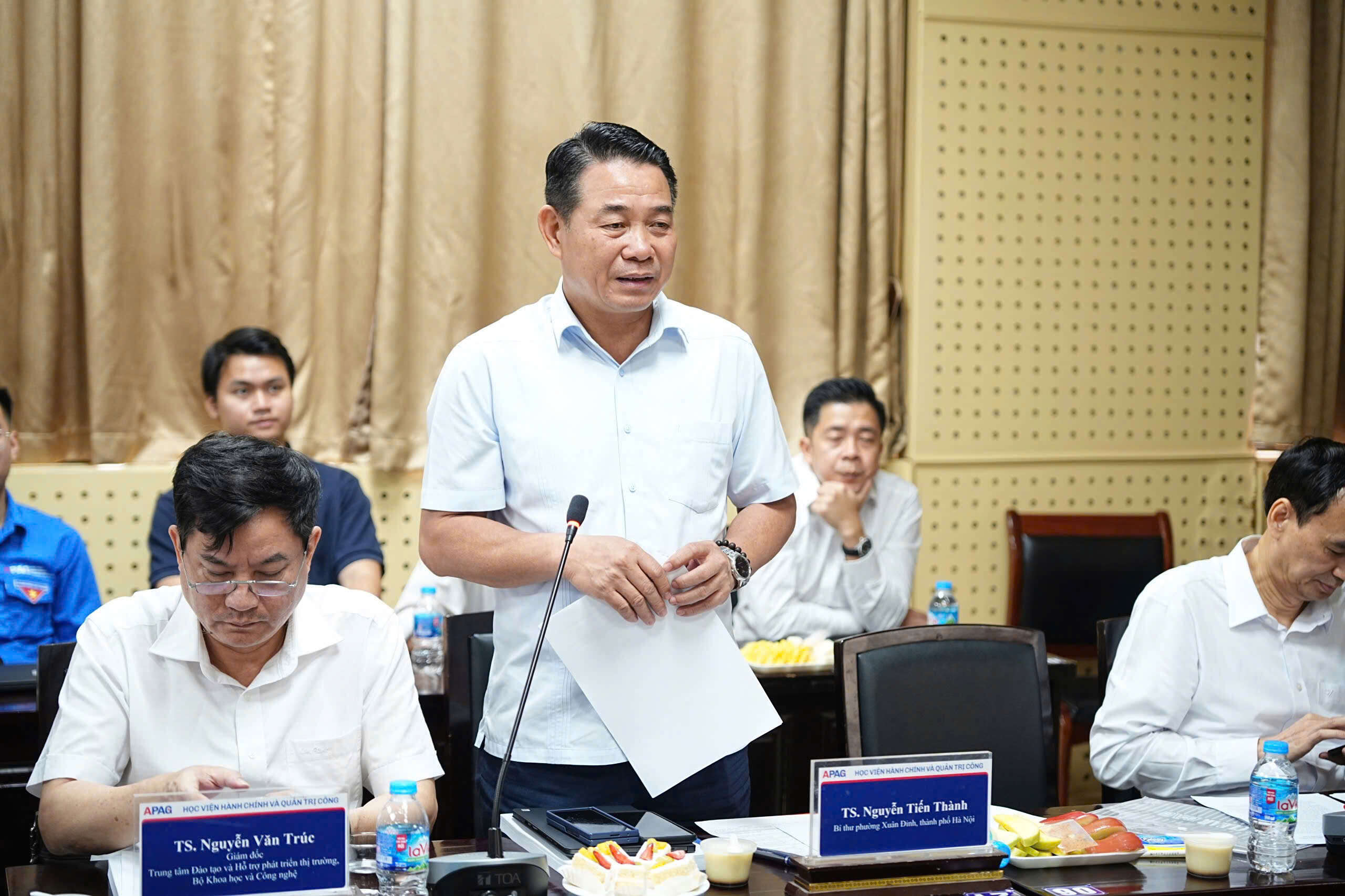 TS. Nguyễn Tiến Thành, Bí thư phường Xuân Đỉnh, TP. Hà Nội tham luận tại Hội thảo.Từ góc nhìn thực tiễn địa phương, TS. Nguyễn Tiến Thành chia sẻ kinh nghiệm của TP. Hà Nội trong việc chuyển đổi sang mô hình quản trị kiến tạo và thông minh, nổi bật là việc áp dụng các công cụ quản trị hiện đại như OKR, KPI, cùng với việc lấy mức độ hài lòng của người dân làm thước đo hiệu quả.