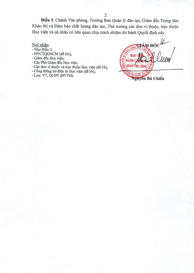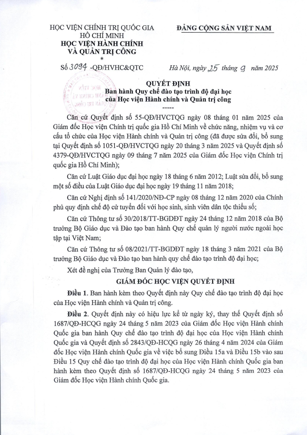 Quyết định số 3094-QĐ/HVHC&QTC ngày 25/9/2025 của Giám đốc Học viện Hành chính và Quản trị công ban hành Quy chế đào tạo trình độ đại học của Học viện Hành chính và Quản trị công