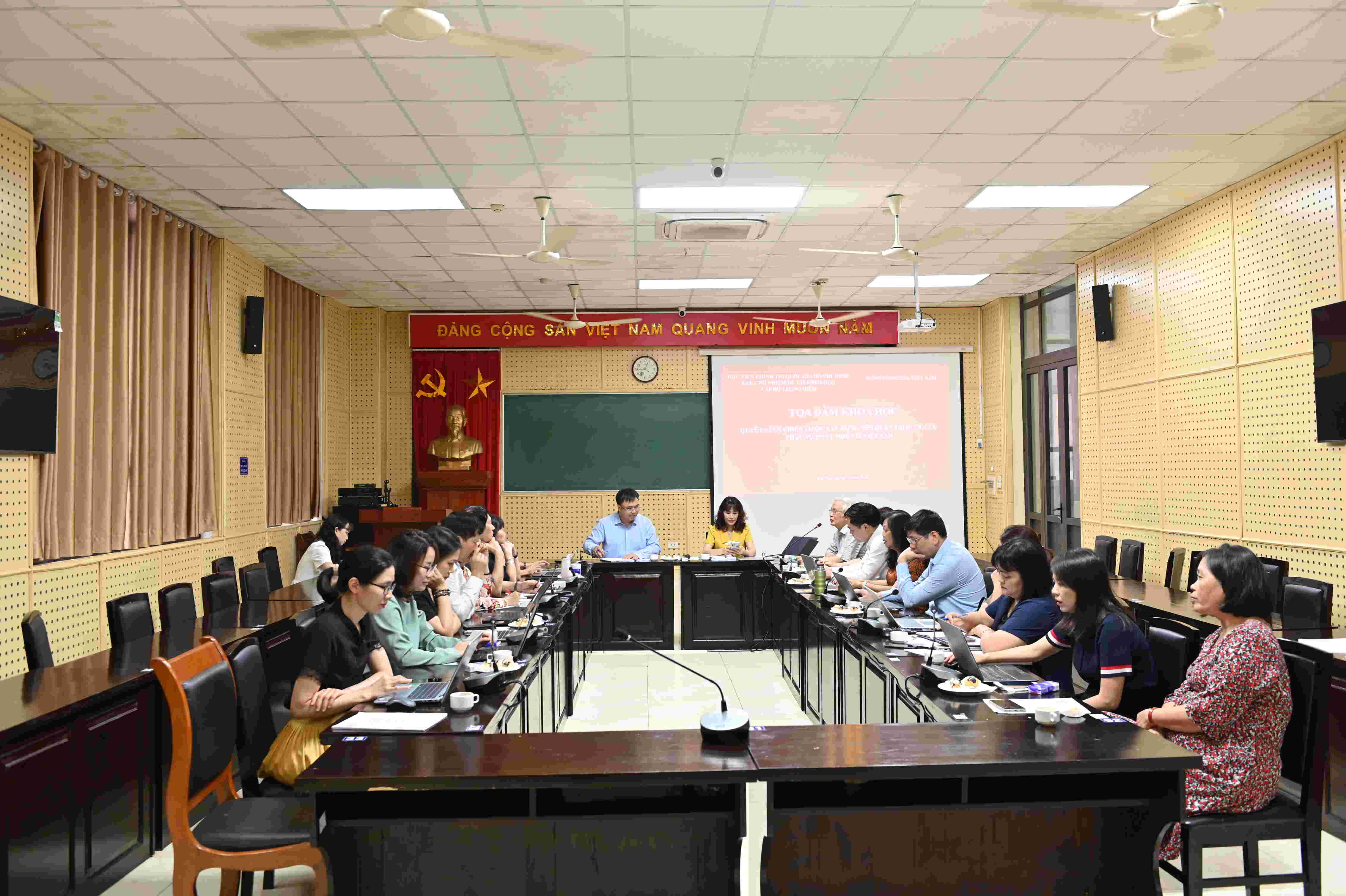 Quang cảnh Tọa đàm.Tọa đàm do GS.TS. Nguyễn Quốc Sửu, Trợ lý đồng chí Đoàn Minh Huấn - Ủy viên Bộ Chính trị, Giám đốc Học viện Chính trị quốc gia Hồ Chí Minh và PGS.TS. Hoàng Mai, Trưởng khoa Quản trị Nhân lực, Học viện Hành chính và Quản trị công đồng chủ trì.