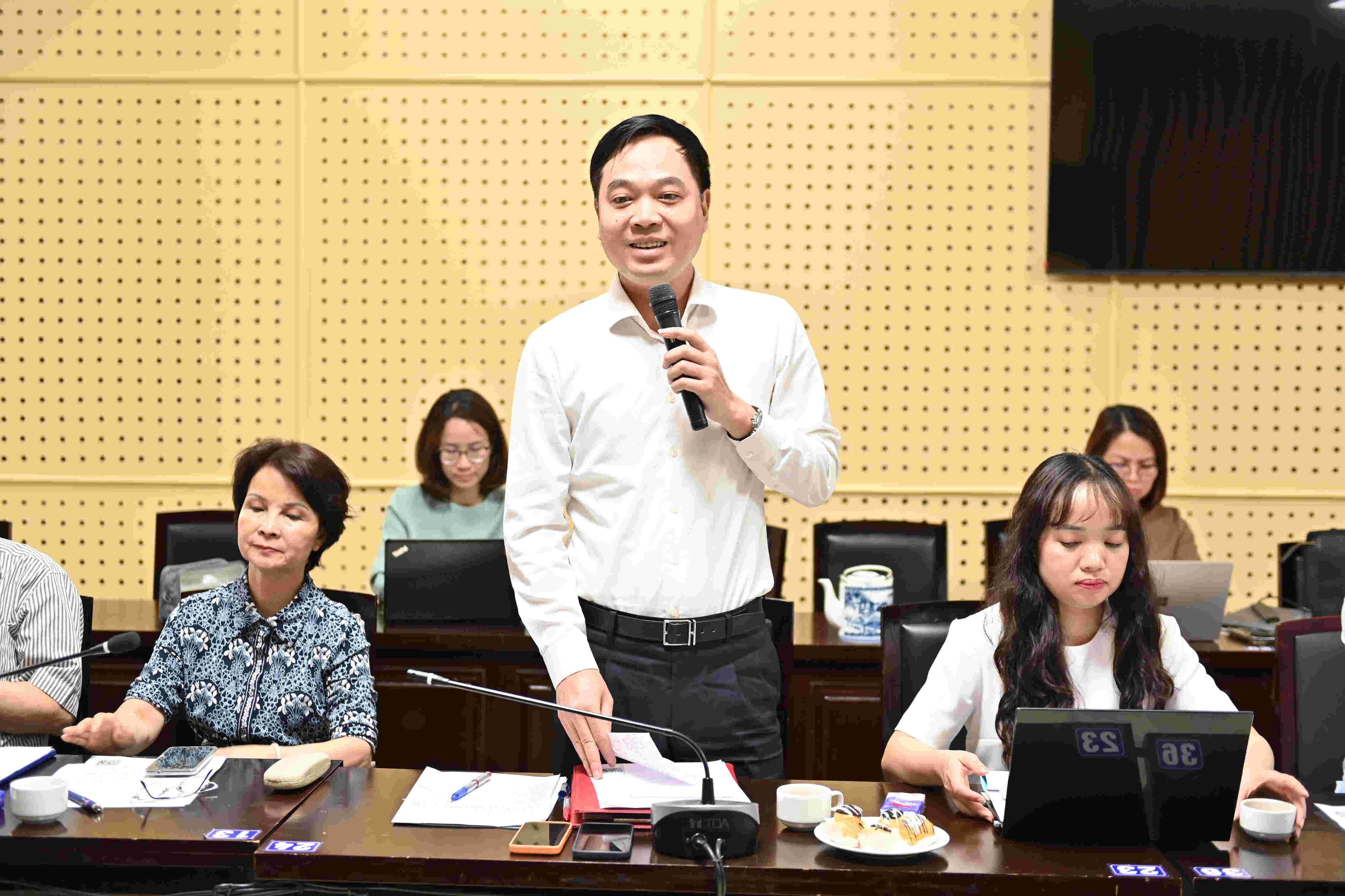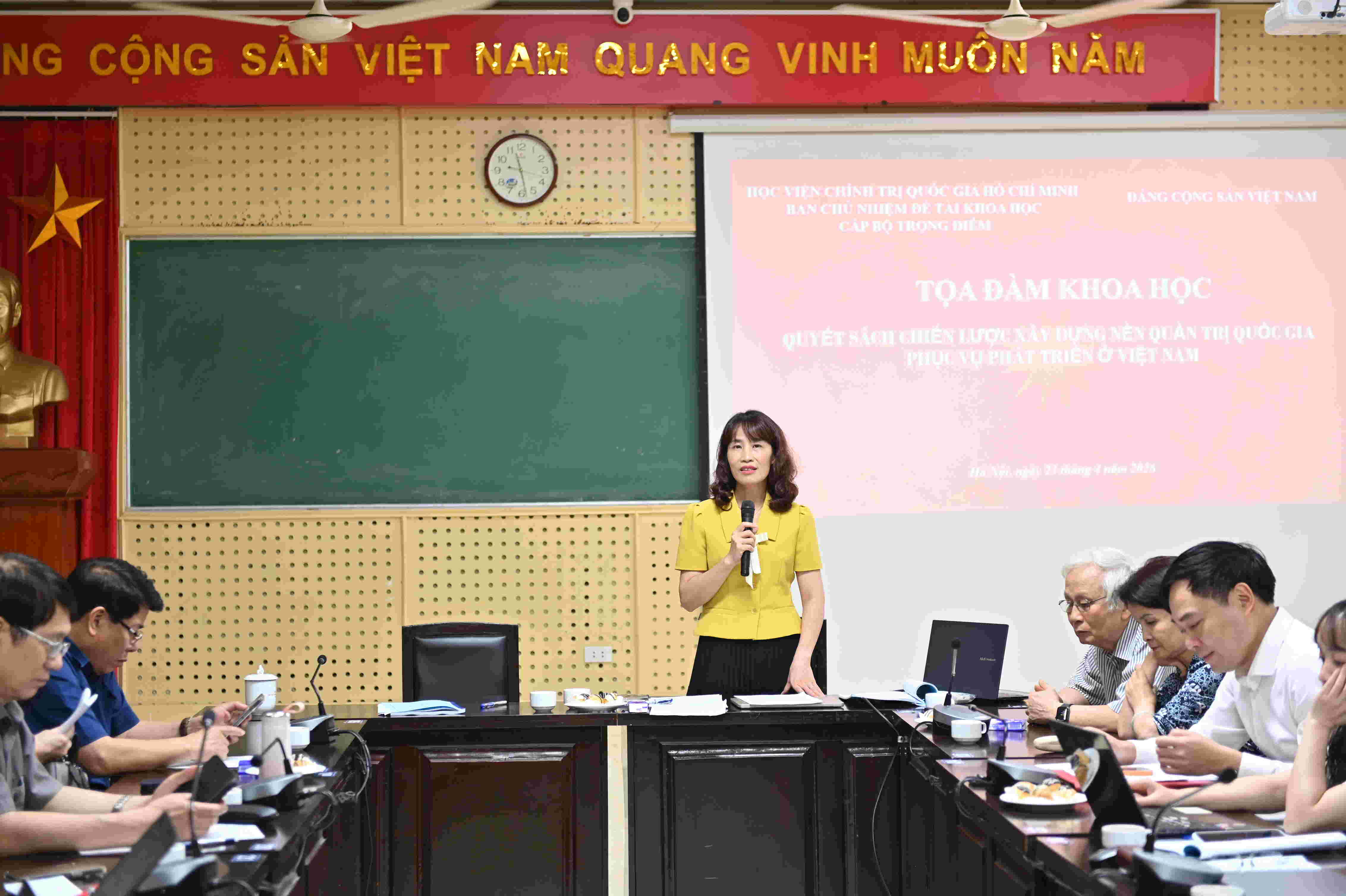 PGS.TS. Hoàng Mai, Trưởng khoa, Khoa Quản trị Nhân lực, Học viện Hành chính và Quản trị công phát biểu kết luận Tọa đàmPhát biểu kết luận, PGS.TS. Hoàng Mai, Trưởng khoa, Khoa Quản trị Nhân lực, Học viện Hành chính và Quản trị công, trân trọng cảm ơn các chuyên gia, nhà khoa học đã đóng góp nhiều ý kiến sâu sắc, tâm huyết để Ban Chủ nhiệm đề tài tiếp tục hoàn thiện nghiên cứu.