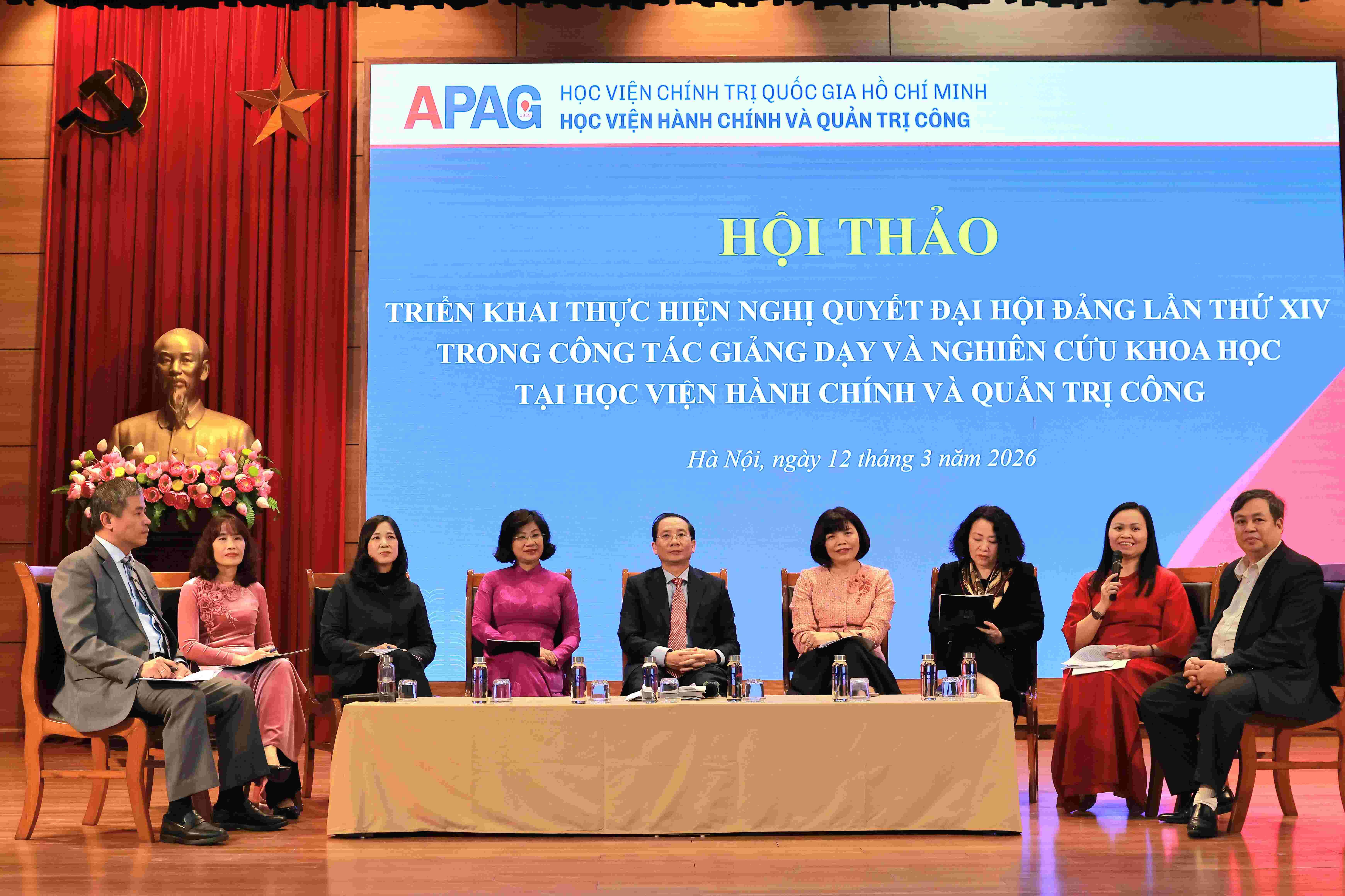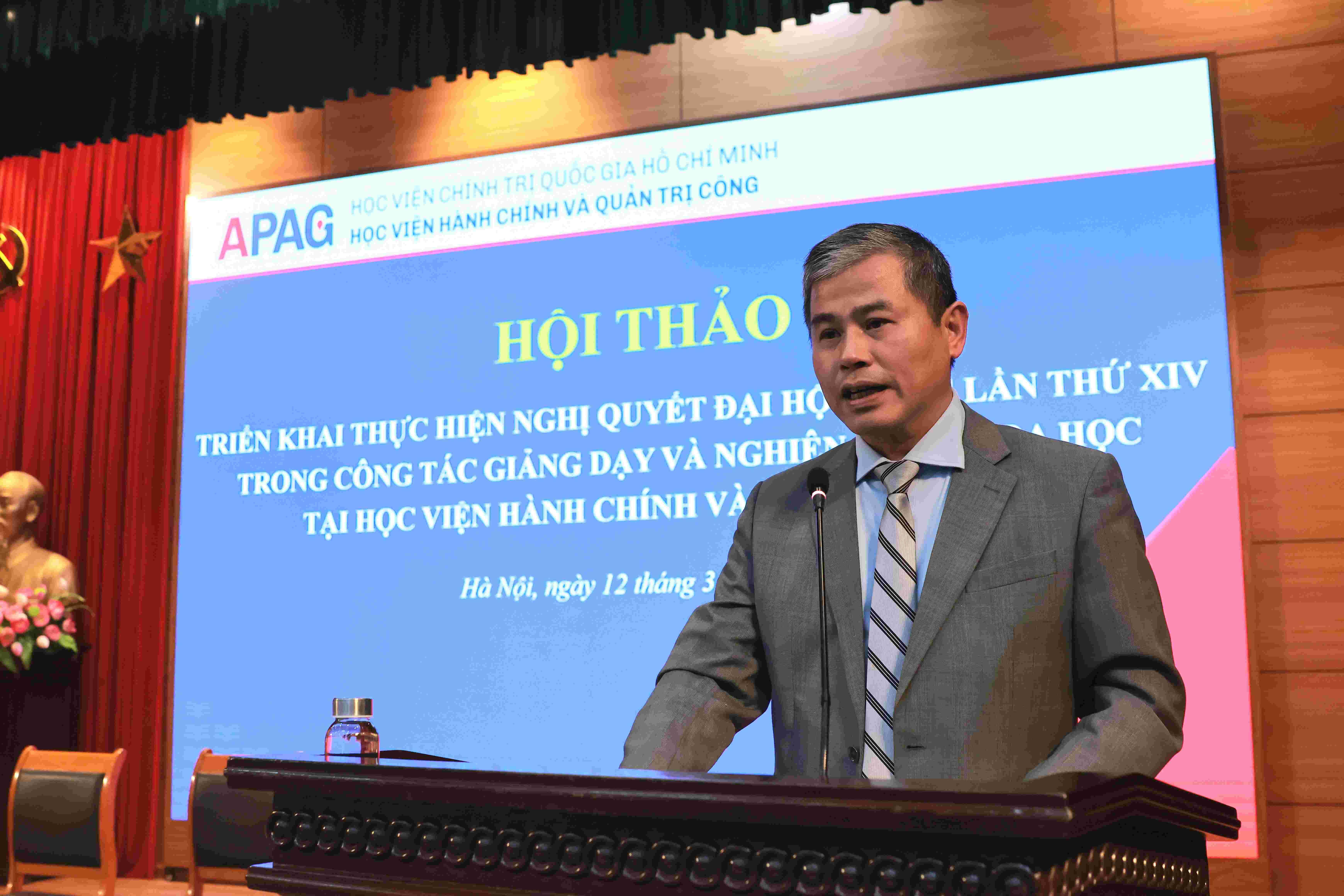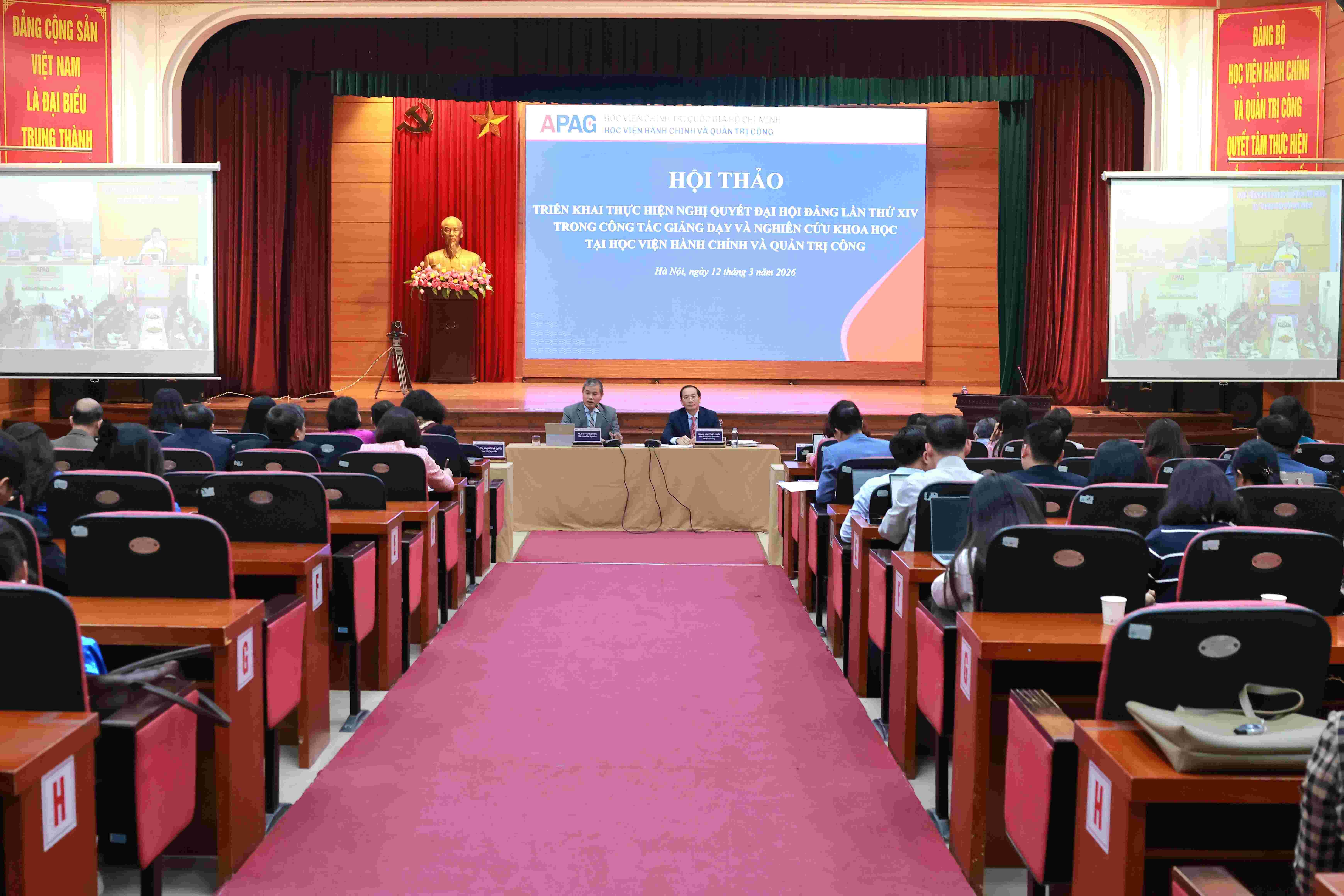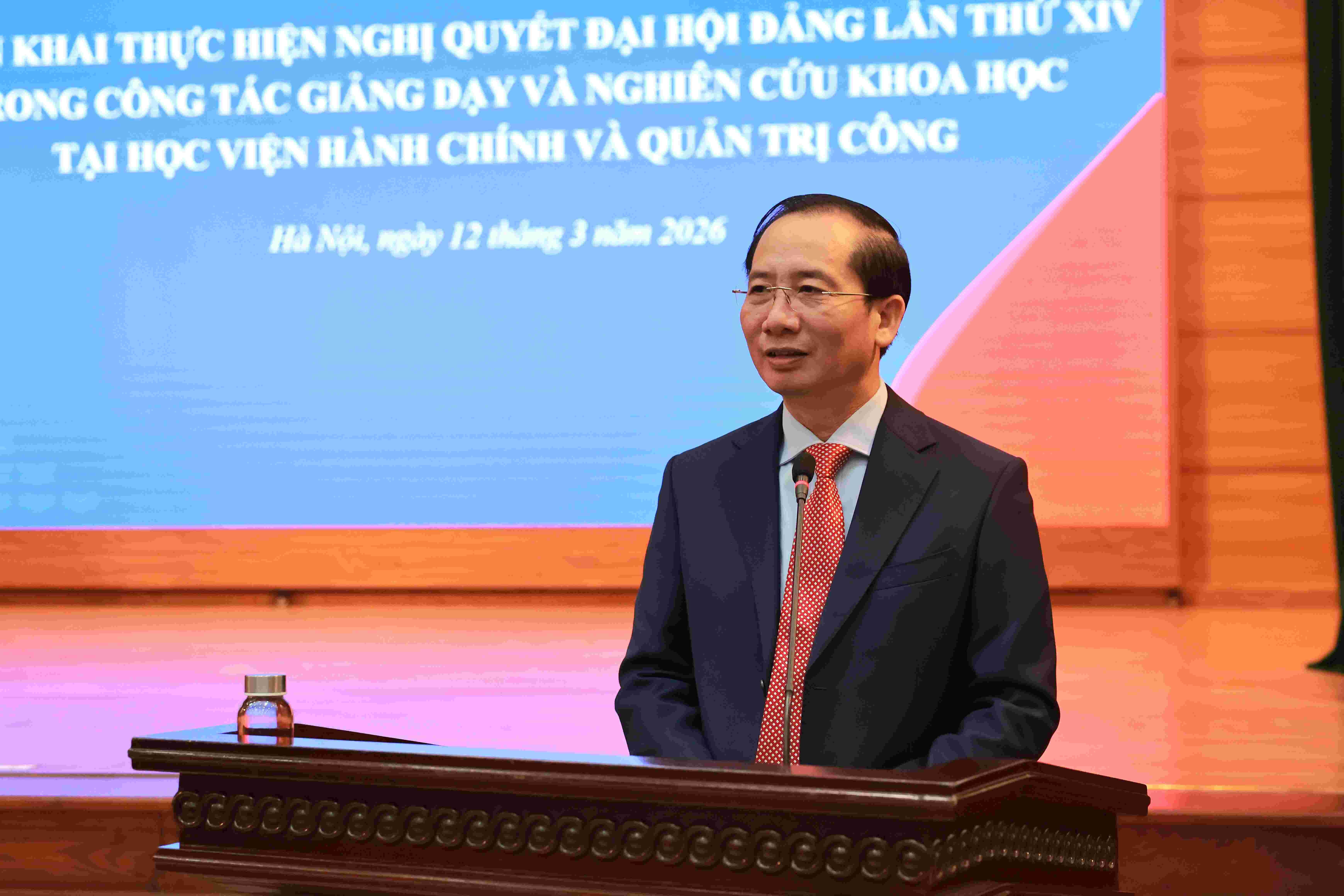 On March 12, 2026, in Hanoi, the Academy of Public Administration and Governance organized a Scientific Conference with the theme: "Implementing the Resolution of the 14th National Party Congress in teaching and scientific research at the Academy of Public Administration and Governance." The conference was held in an in-person format combined with online broadcasting, connecting with the Branch Campuses of the Academy. The conference was co-chaired by Assoc. Prof. Dr. Nguyen Ba Chien and Dr. Bui Phuong Dinh.