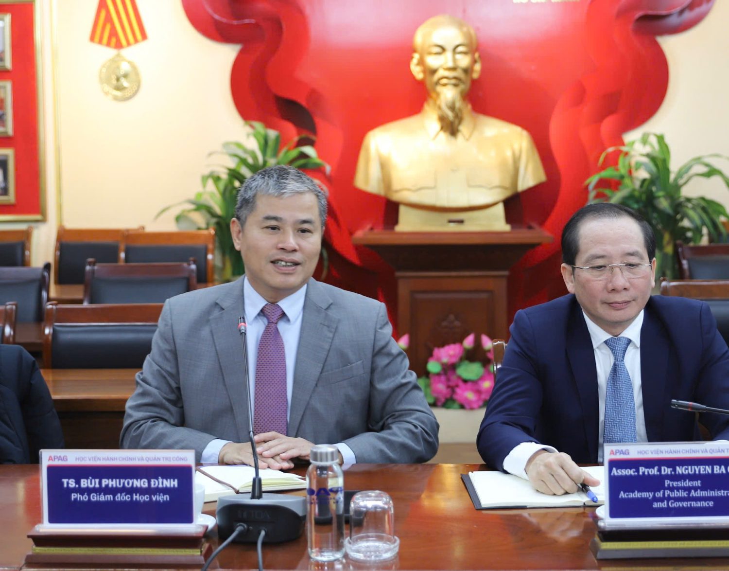 Representing the Academy of Public Administration and Governance were: Assoc. Prof. Dr. Nguyen Ba Chien, APAG President; Dr. Bui Phuong Dinh, APAG Vice President; Ms. Pham Thi Quynh Hoa, MSc, Acting Director of the Department of Scientific Management and International Cooperation; Dr. Nguyen Huy Hoang, Director of the Department of Personnel and Organization; Assoc. Prof. Dr. Dang Khac Anh, Dean of the Faculty of Social Management and Development; Dr. Ta Thi Huong, Vice Dean of the Faculty of Social Management and Development; alongside officials from the Department of Scientific Management and International Cooperation.