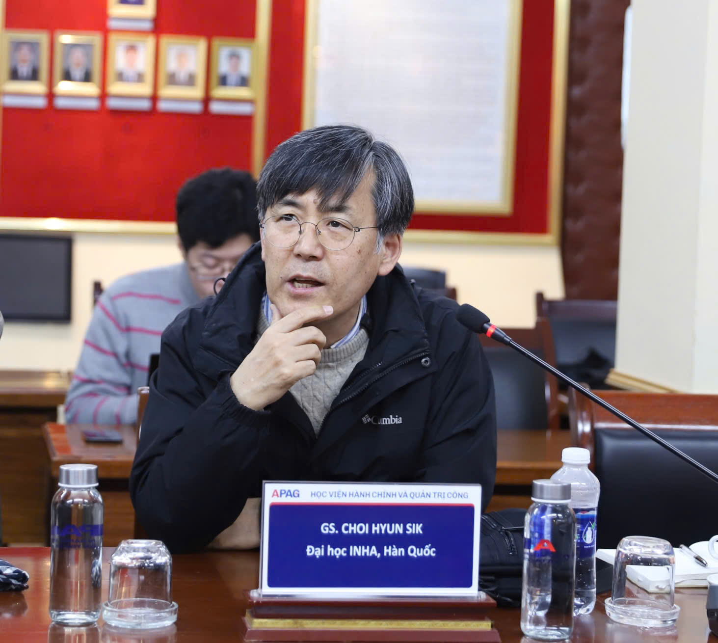 Delivering his remarks at the meeting, Assoc. Prof. Dr. Nguyen Ba Chien extended a warm welcome to the expert delegation from Inha University regarding their visit and working session at APAG. He acknowledged and highly valued the traditional, substantive, and increasingly effective cooperative relationship maintained by both parties in recent years. The APAG President emphasized that academic exchanges, international conferences, staff training, and research surveys have significantly contributed to enhancing the capacity for teaching, research, and international engagement of the Academy’s officials and lecturers. On this foundation, Assoc. Prof. Dr. Nguyen Ba Chien expressed a desire for both sides to further deepen their cooperation, particularly in joint training, faculty and student exchange, collaborative scientific research, and knowledge transfer pertaining to public governance, digital transformation, and sustainable development.