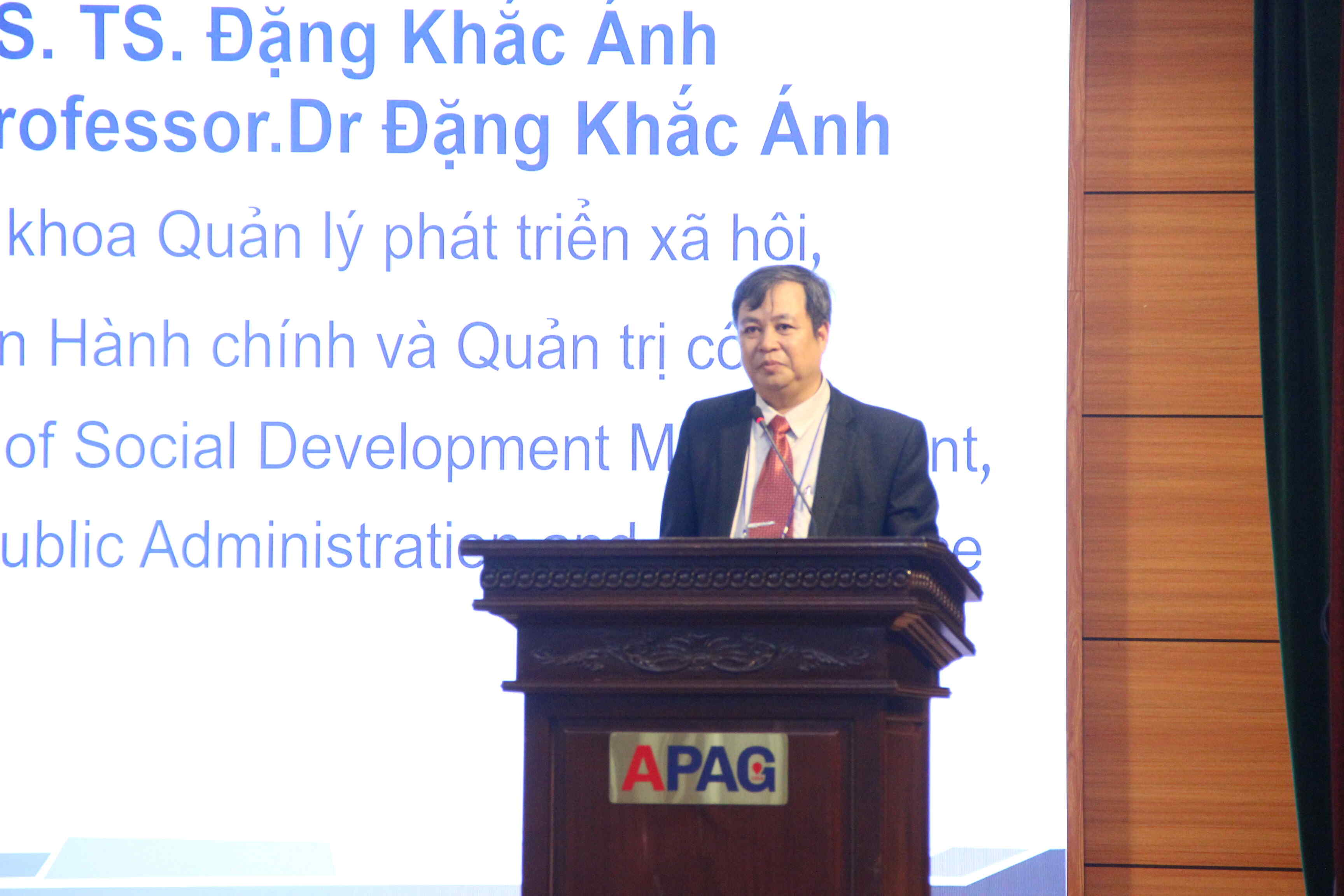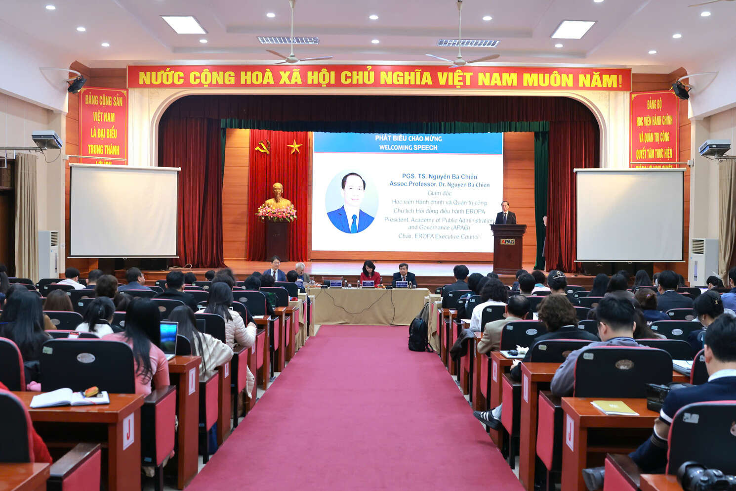 From the Academy of Public Administration and Governance (APAG) were: Assoc. Prof. Dr. Nguyen Ba Chien, President of the Academy; Assoc. Prof. Dr. Luong Thanh Cuong, Vice President of the Academy; Dr. Bui Phuong Dinh, Vice President of the Academy; Assoc. Prof. Dr. Dang Khac Anh, Dean of the Faculty of Social Development Management; Ms. Pham Thi Quynh Hoa, Acting Director of the Department of Science Management and International Cooperation; leaders of various faculties, departments, and units under and affiliated with the Academy; along with a large number of lecturers, fellows, and students.