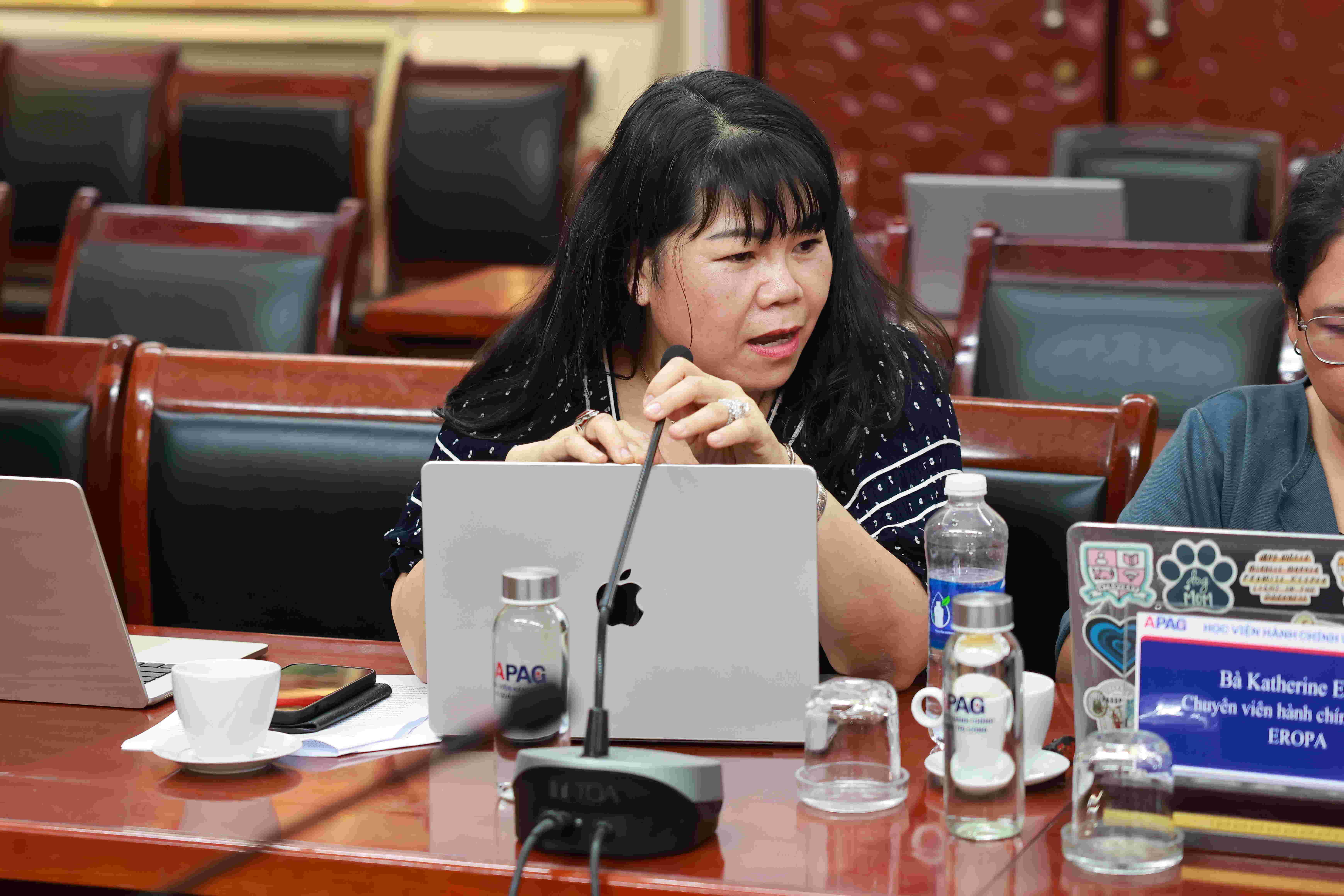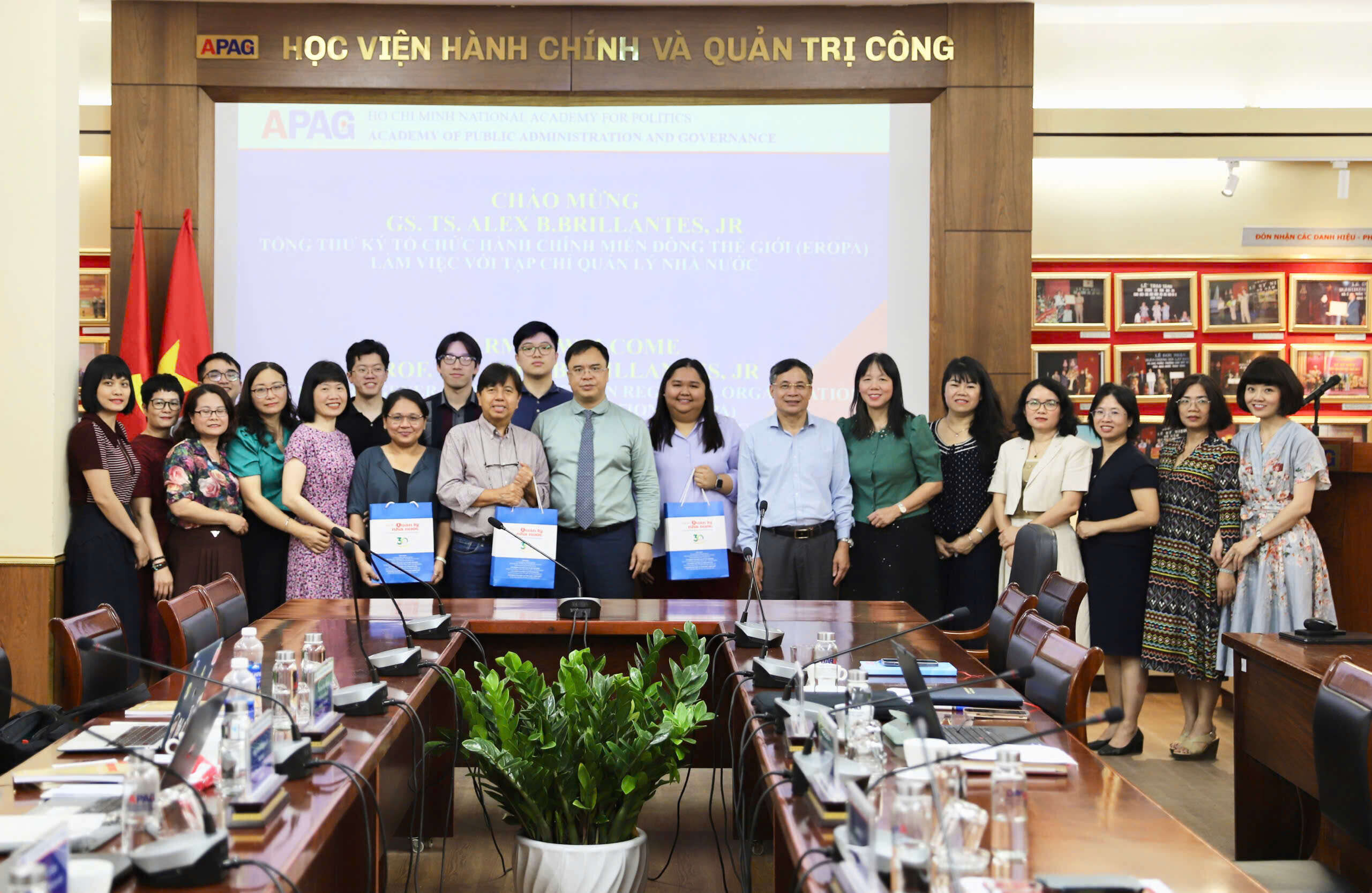 Attending the working session, on the EROPA side were: Prof. Dr. Alex Brillantes Jr., Secretary-General of EROPA; Ms. Kartherine Ederm, Senior Administrative Officer; Ms. Ainna Shariz Comia, Senior Researcher, EROPA Office Manager. On the Academy's side were: Dr. Nguyen Quang Vinh, Editor-in-Chief of the Journal of State Management; MA. Pham Thi Quynh Hoa, Acting Director of the Department of Scientific Management and International Cooperation; Dr. Le Thi Hoa, Deputy Editor-in-Chief of the Journal of State Management; along with officials and editors of the Journal and the Department of Scientific Management and International Cooperation.
