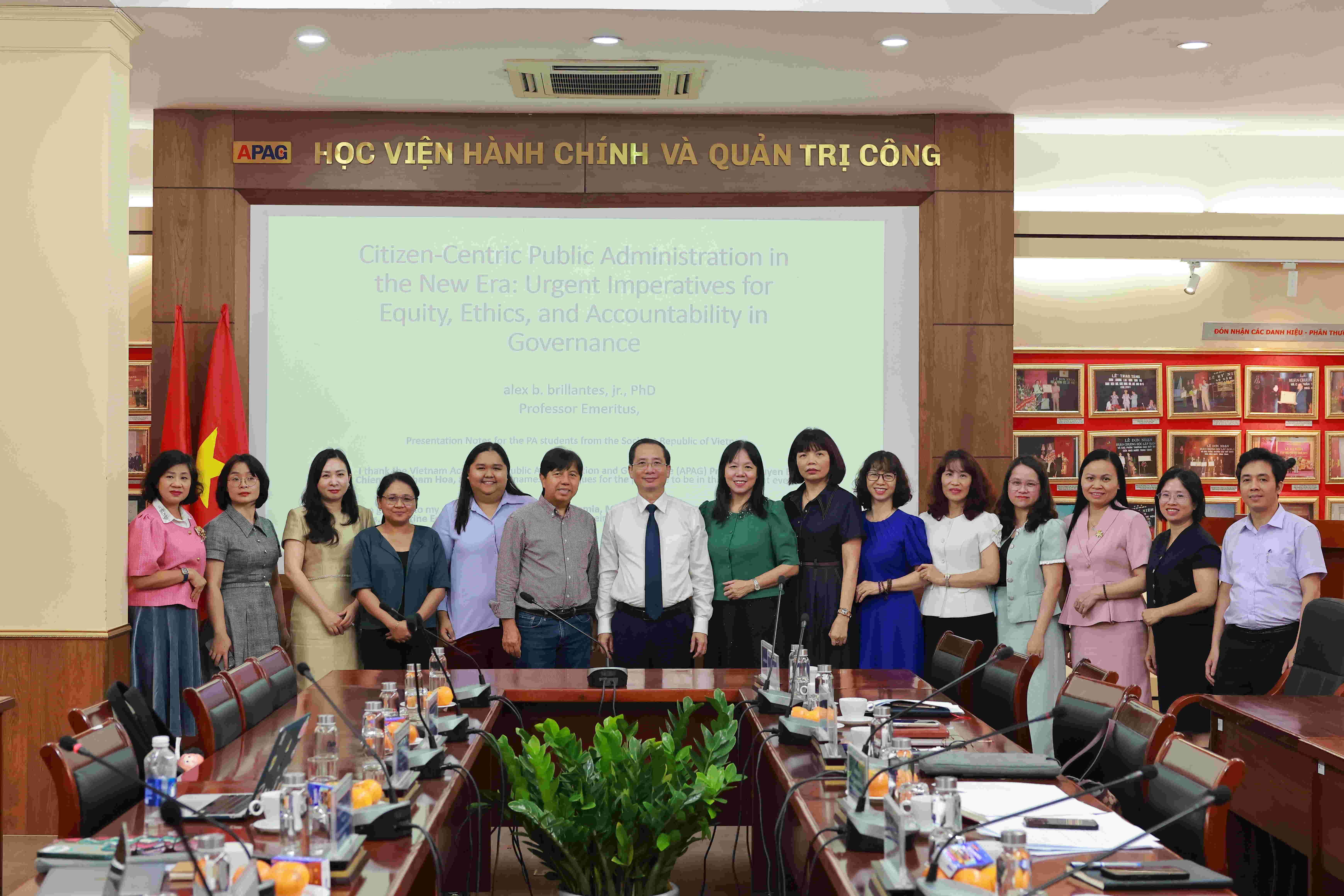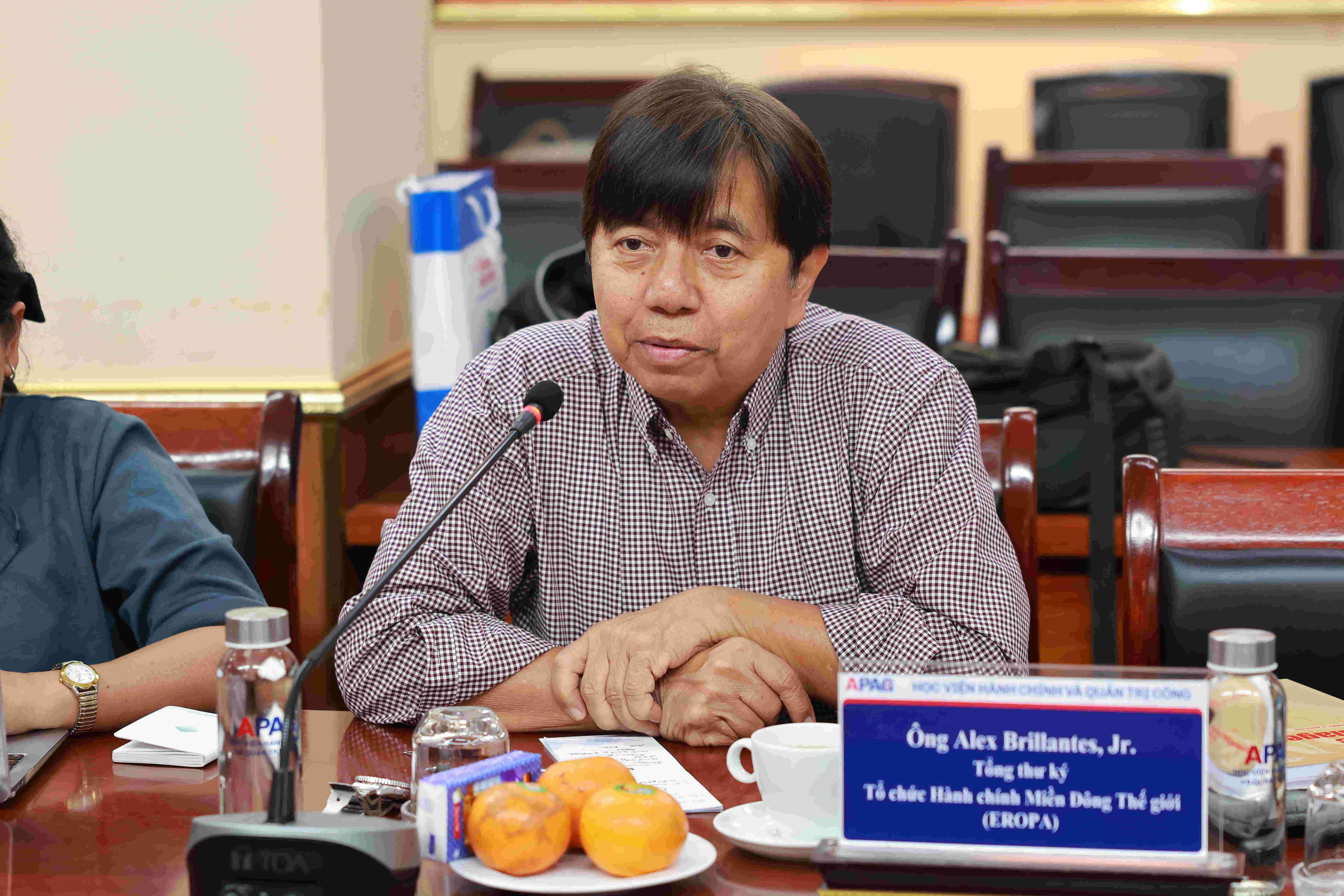 Exchanging views at the working session, Dr. Alex Brillantes Jr. respectfully thanked the thoughtful reception of Assoc. Prof. Dr. Nguyen Ba Chien and the collective leadership and lecturers of the Academy. The EROPA Secretary-General stated that in the previous working program with the Journal of State Management, the two sides had effective discussions, especially in developing a roadmap to integrate the Journal into the Scopus system, including improving the publication process, enhancing article quality, and expanding the international scholar network.