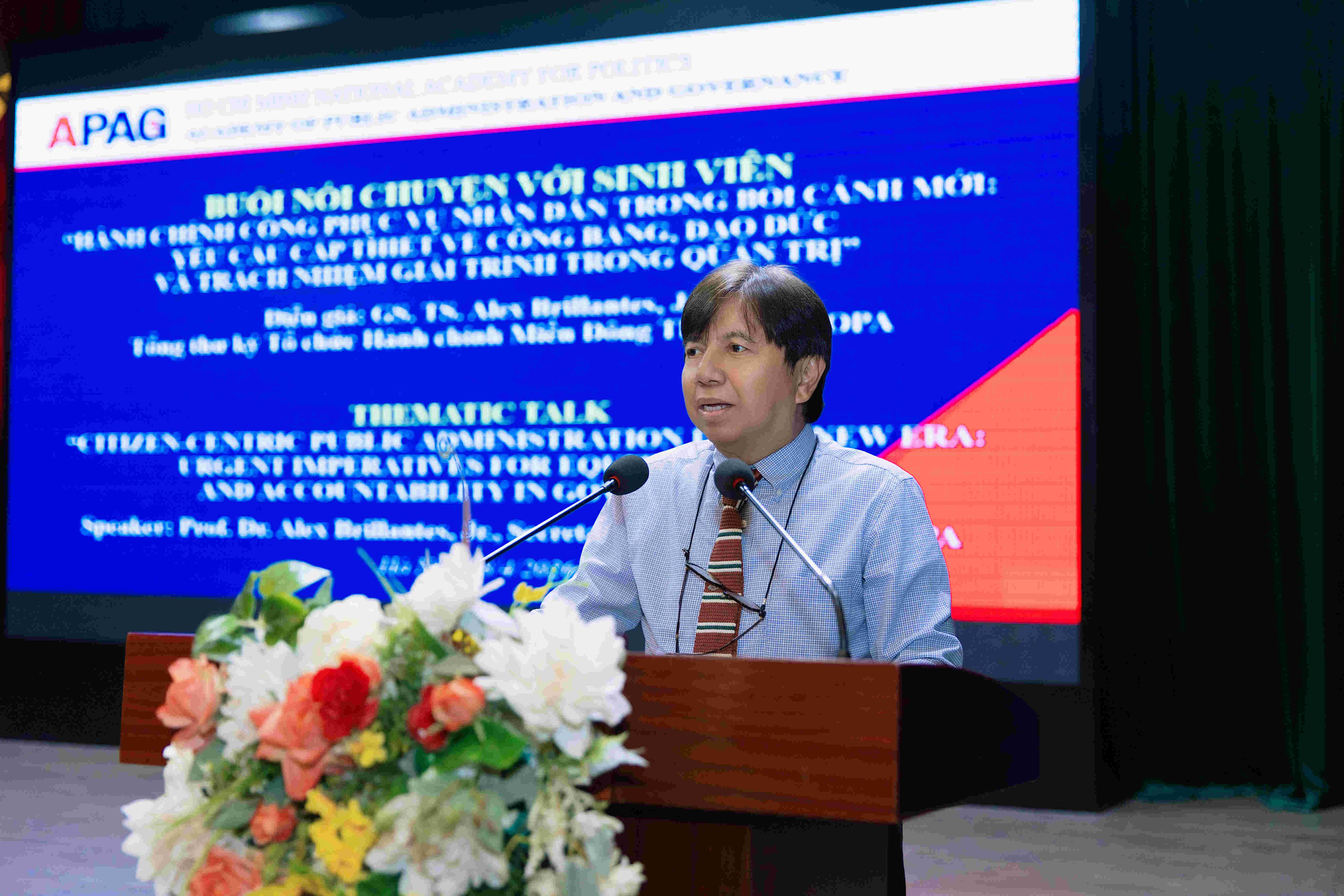 On April 8, 2026, in Hanoi, the Academy of Public Administration and Governance organized a thematic talk titled "Public administration serving the people in the new context: Urgent requirements for equity, ethics, and accountability in governance." The speaker of the talk was Professor Alex Brillantes, Secretary-General of the Eastern Regional Organization for Public Administration (EROPA), a prestigious scholar in the field of public administration and governance in the Asia-Pacific region