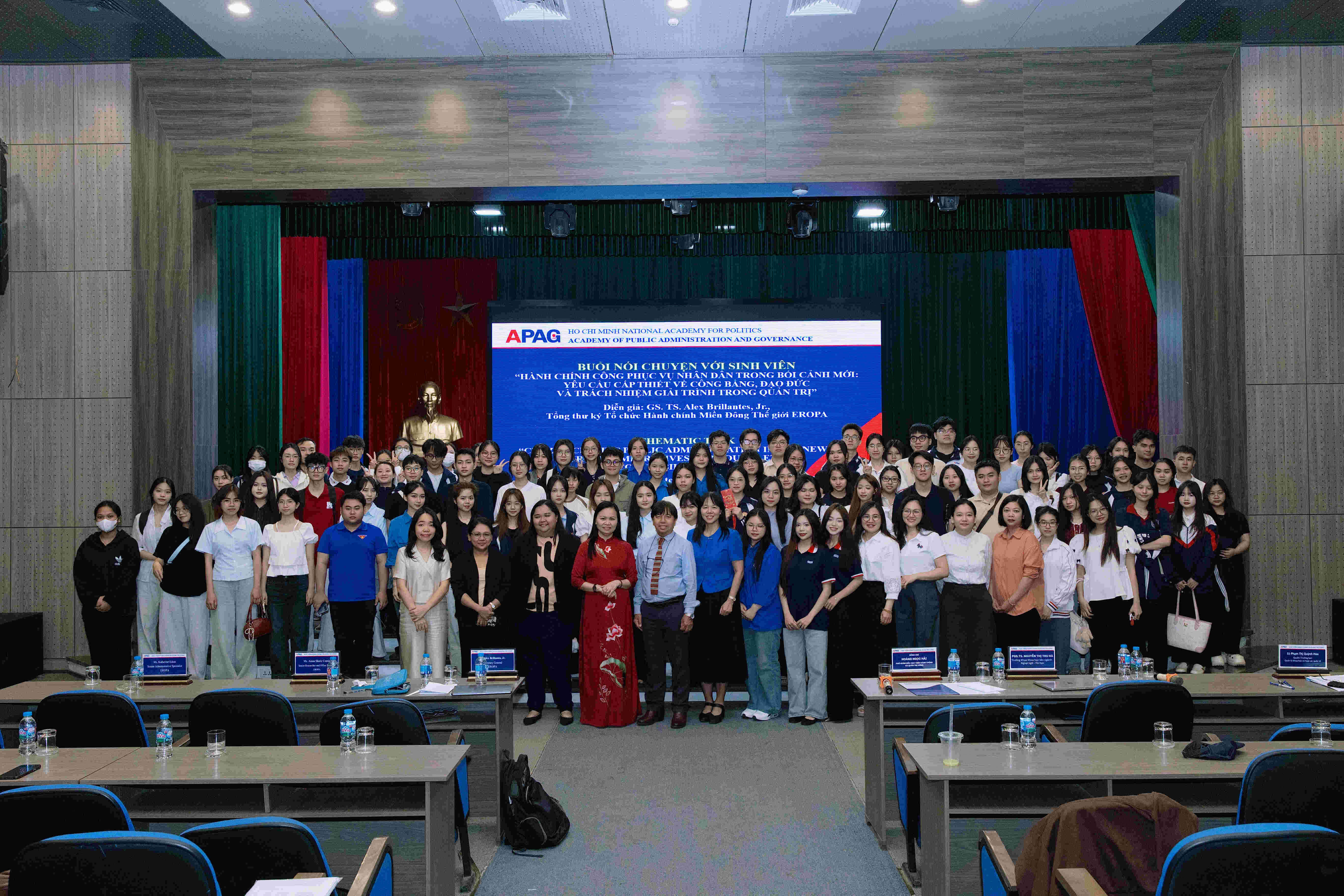 Students interacting with the speakerMany students expressed their interest in balancing management efficiency and ensuring social equity, as well as how to ensure citizens' voices—especially those of disadvantaged groups—are fully reflected in the policymaking process. Professor Alex Brillantes directly answered the questions and encouraged students to proactively learn from international experiences, but with a selective adaptation suited to Vietnam's specific conditions.