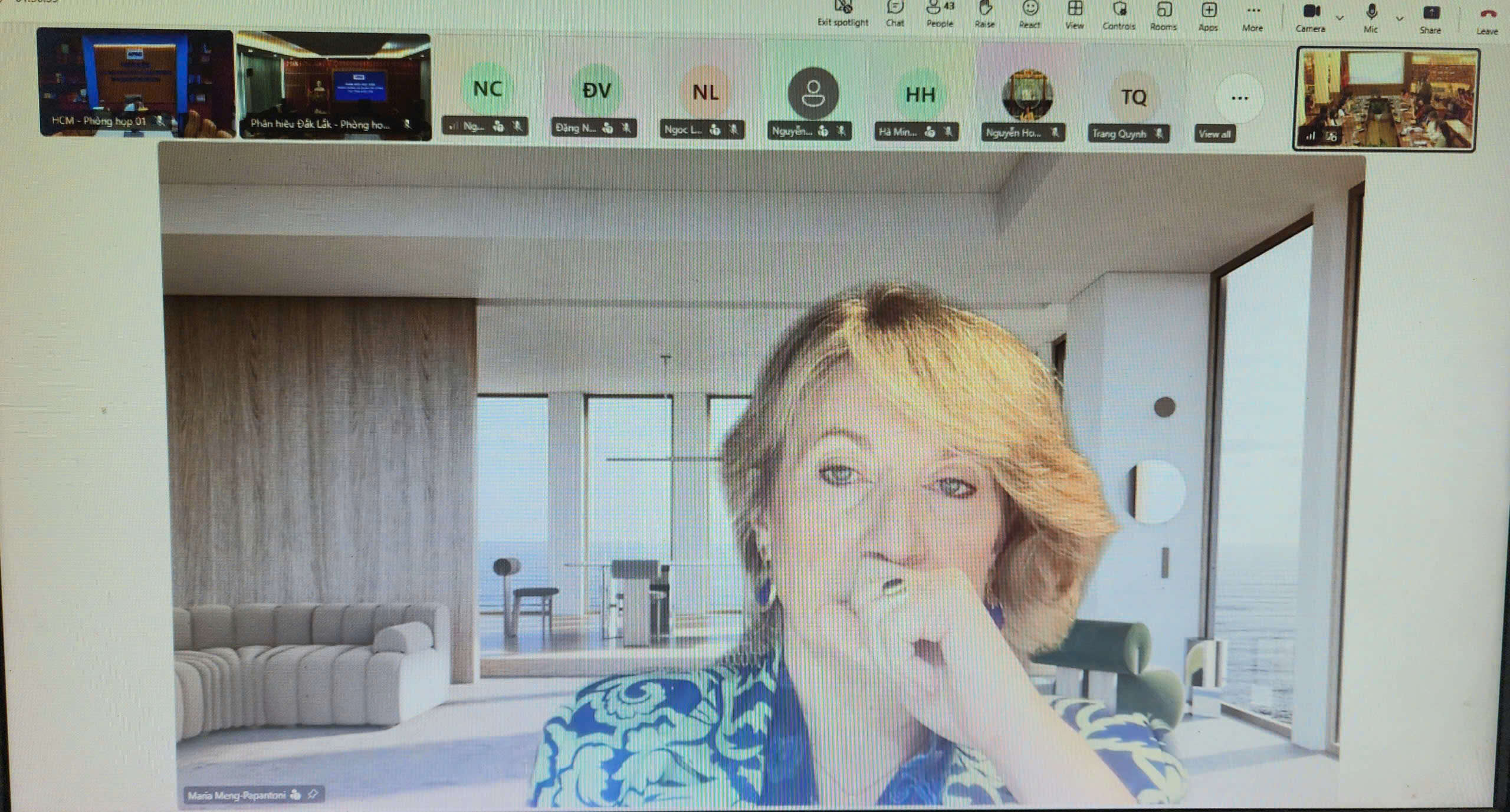 Giáo sư Maria Meng-Papantoni trình bày chia sẻ tại chương trình (trực tuyến)Phiên thảo luận diễn ra sôi nổi, tập trung vào các vấn đề mang tính thời sự như: đổi mới chương trình đào tạo pháp luật trong bối cảnh chuyển đổi số; yêu cầu tích hợp các kỹ năng liên ngành vào chương trình giảng dạy; vai trò của trí tuệ nhân tạo trong hỗ trợ hoạt động pháp lý; cũng như thách thức trong việc cân bằng giữa tính ổn định của pháp luật và yêu cầu thích ứng với các biến động nhanh của xã hội.