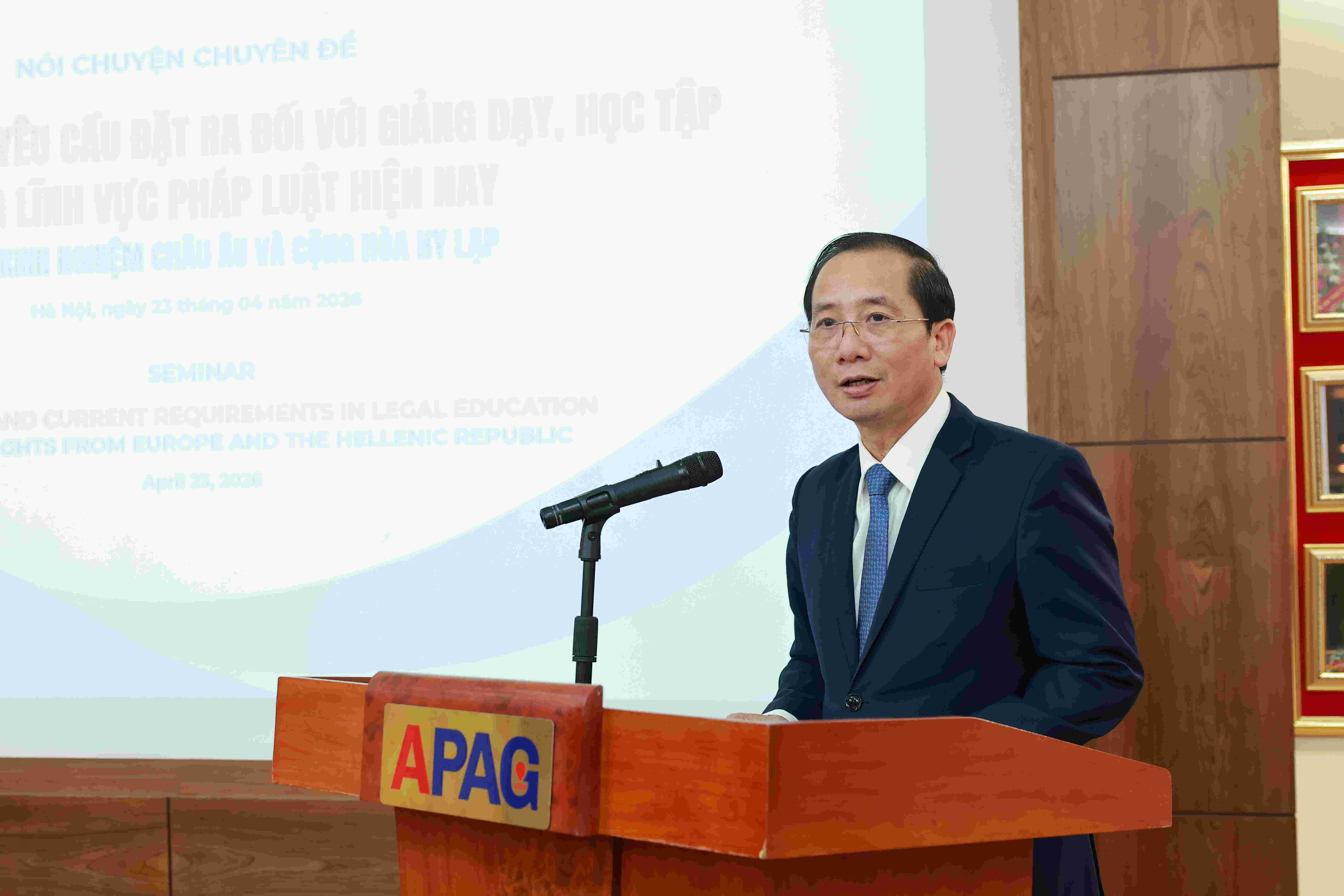 (apag.edu.vn) - Chiều ngày 23/4/2026, tại Hà Nội, Học viện Hành chính và Quản trị công tổ chức buổi nói chuyện chuyên đề với chủ đề “Sự phát triển và yêu cầu đặt ra đối với giảng dạy, học tập trong lĩnh vực pháp luật hiện nay: chia sẻ kinh nghiệm châu Âu và Cộng hòa Hy Lạp”. PGS.TS. Nguyễn Bá Chiến, Bí thư Đảng ủy, Giám đốc Học viện dự và phát biểu khai mạc.