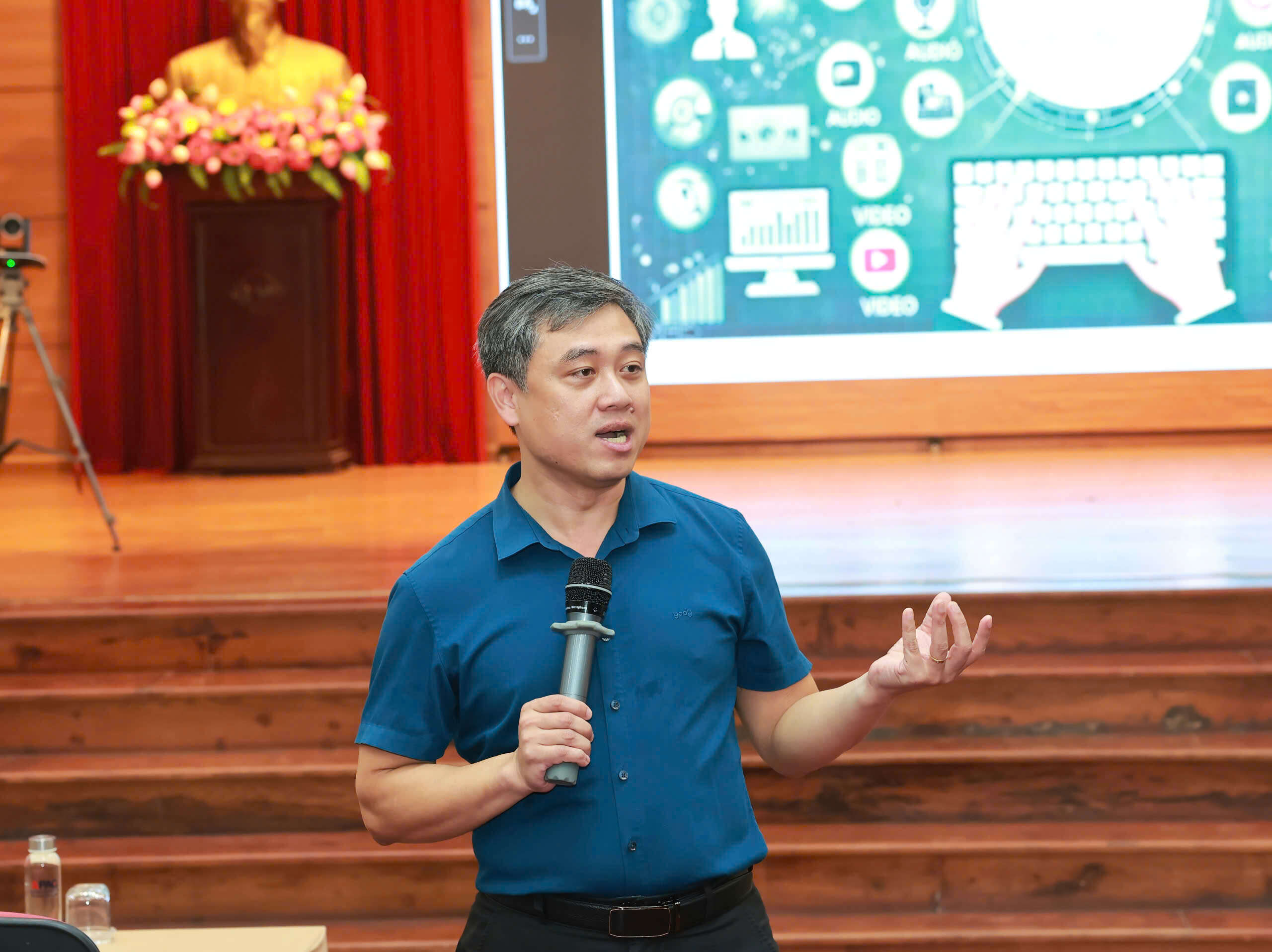 TS. Lê Thị Chiên trình bày chuyên đề tại chương trình tập huấn.Tiếp đó, ThS. Vũ Thế Cường, giảng viên Học viện Báo chí và Tuyên truyền đã trao đổi chuyên đề về “Kỹ năng xây dựng các tác phẩm đa phương tiện về bảo vệ nền tảng tư tưởng của Đảng”. ThS. Vũ Thế Cường nhấn mạnh vai trò của chuyển đổi số trong công tác tuyên truyền, định hướng dư luận xã hội; đồng thời hướng dẫn cách thức khai thác hiệu quả các nền tảng số, ứng dụng công nghệ truyền thông hiện đại nhằm nâng cao sức lan tỏa của các sản phẩm chính luận.