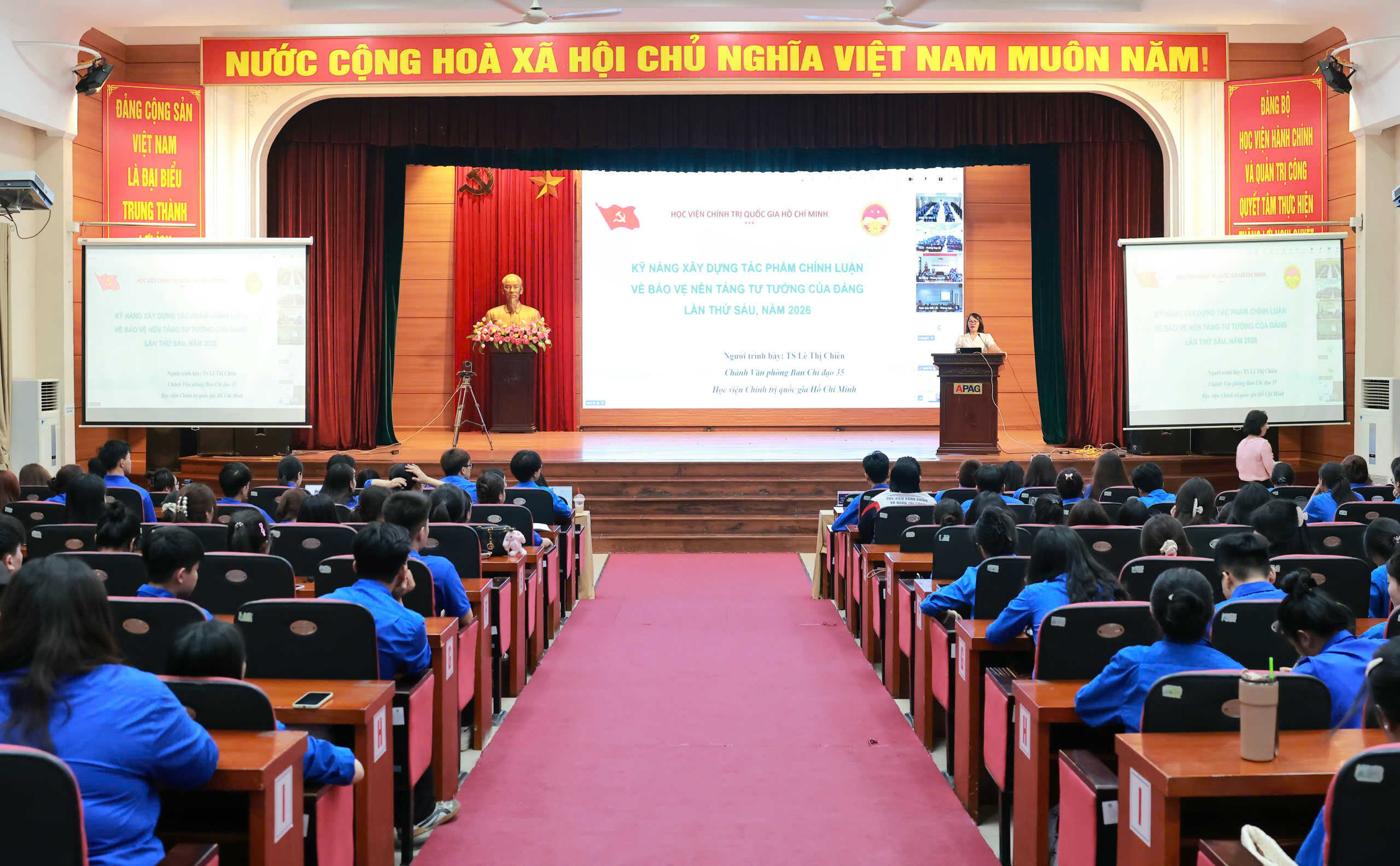 (apag.edu.vn) - Chiều ngày 22/4/2026, tại Hà Nội, Học viện Hành chính và Quản trị công tổ chức chương trình tập huấn kỹ năng xây dựng các tác phẩm chính luận về bảo vệ nền tảng tư tưởng của Đảng dành cho sinh viên toàn Học viện. Chương trình được kết nối trực tuyến tới các Phân hiệu và Phòng Truyền thống, thu hút đông đảo viên chức, giảng viên và đoàn viên, sinh viên tham dự.