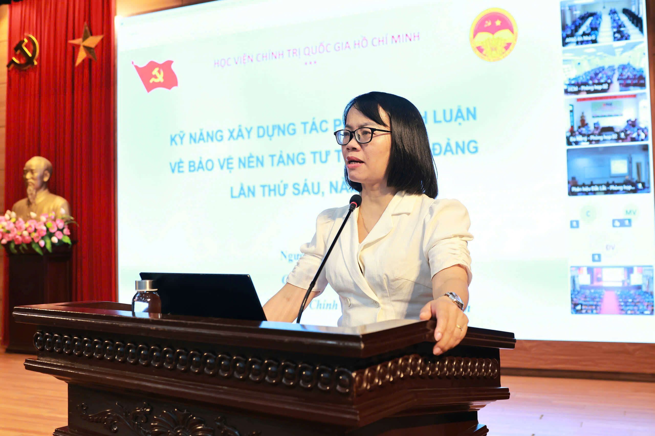 Tại chương trình, TS. Lê Thị Chiên, Phó Vụ trưởng Vụ Quản lý khoa học, Chánh Văn phòng Ban Chỉ đạo 35 Học viện Chính trị quốc gia Hồ Chí Minh đã trình bày chuyên đề về “Kỹ năng xây dựng các tác phẩm chính luận về bảo vệ nền tảng tư tưởng của Đảng lần thứ Sáu, năm 2026”. Nội dung tập trung làm rõ yêu cầu về tính Đảng, tính chiến đấu, tính thuyết phục trong các tác phẩm chính luận; phương pháp xây dựng luận điểm, luận cứ chặt chẽ; cách nhận diện, phân tích và phản bác hiệu quả các quan điểm sai trái, thù địch.