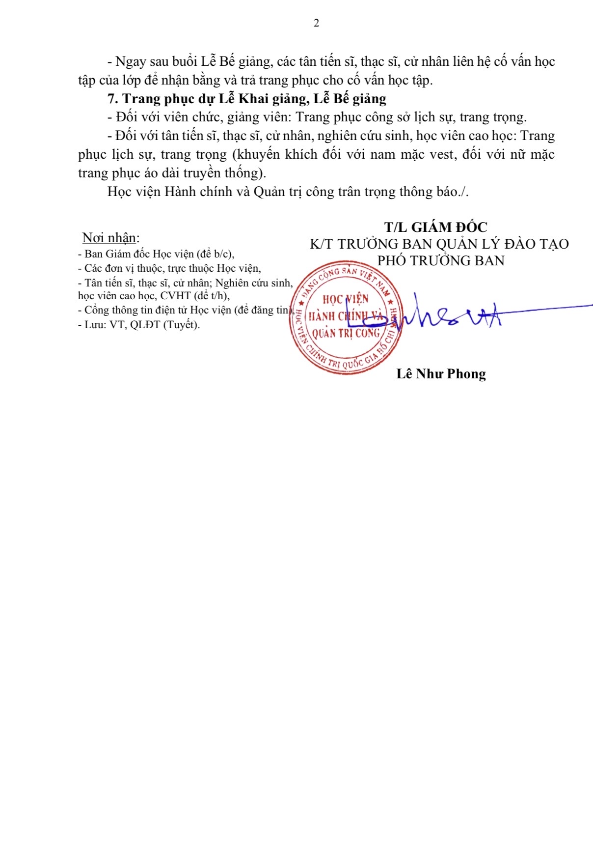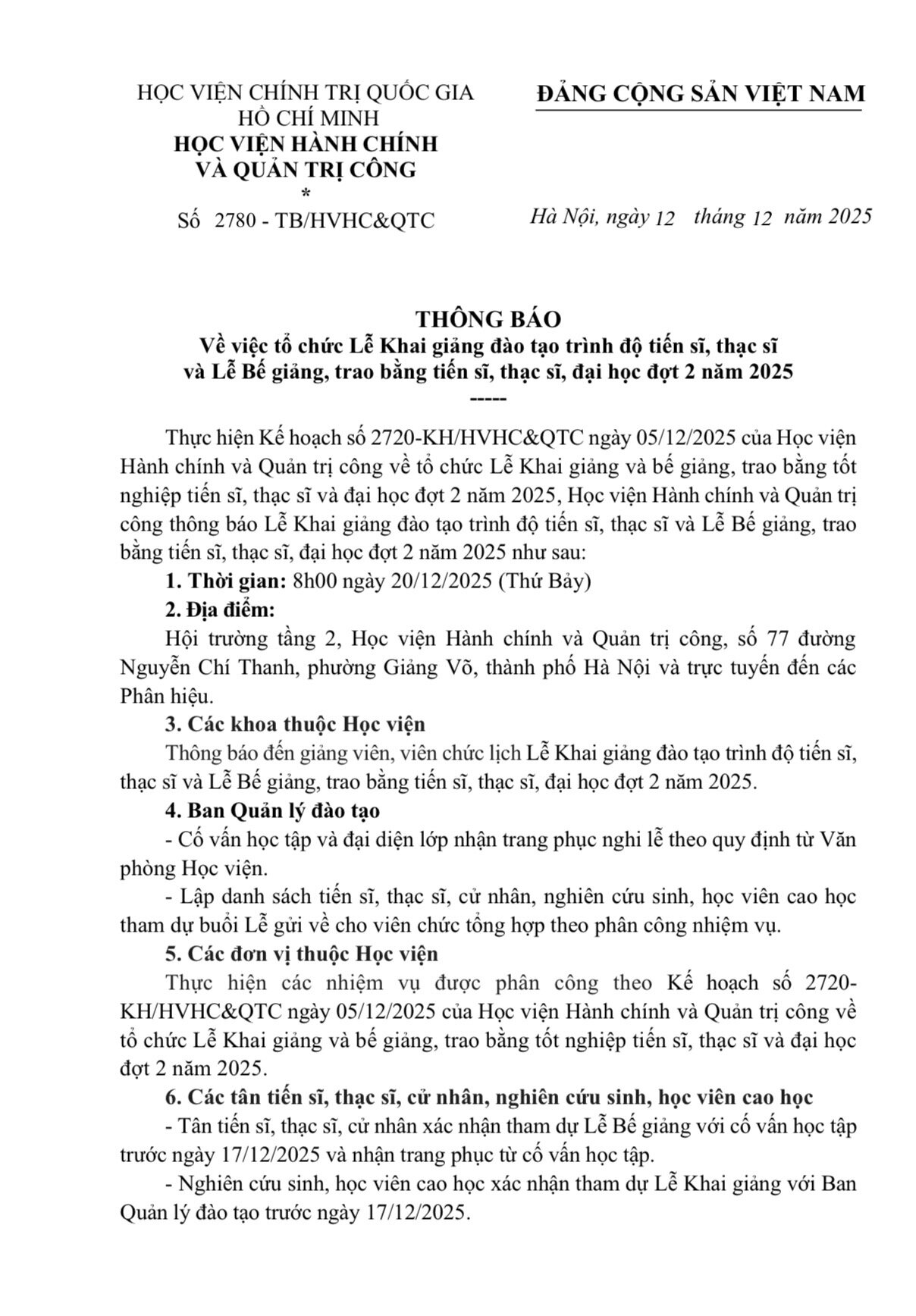 Thông báo về việc tổ chức Lễ Khai giảng đào tạo trình độ tiến sĩ, thạc sĩ và Lễ Bế giảng, trao bằng tiến sĩ, thạc sĩ, đại học đợt 2 năm 2025